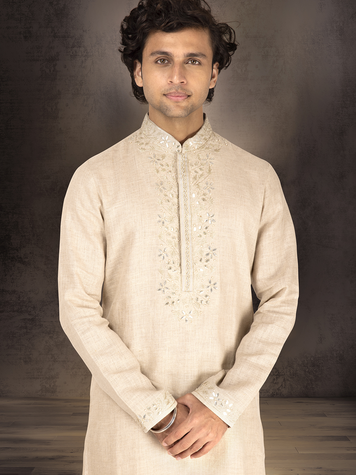 Beige Pure Linen Kurta Suit With Zardosi Detailing