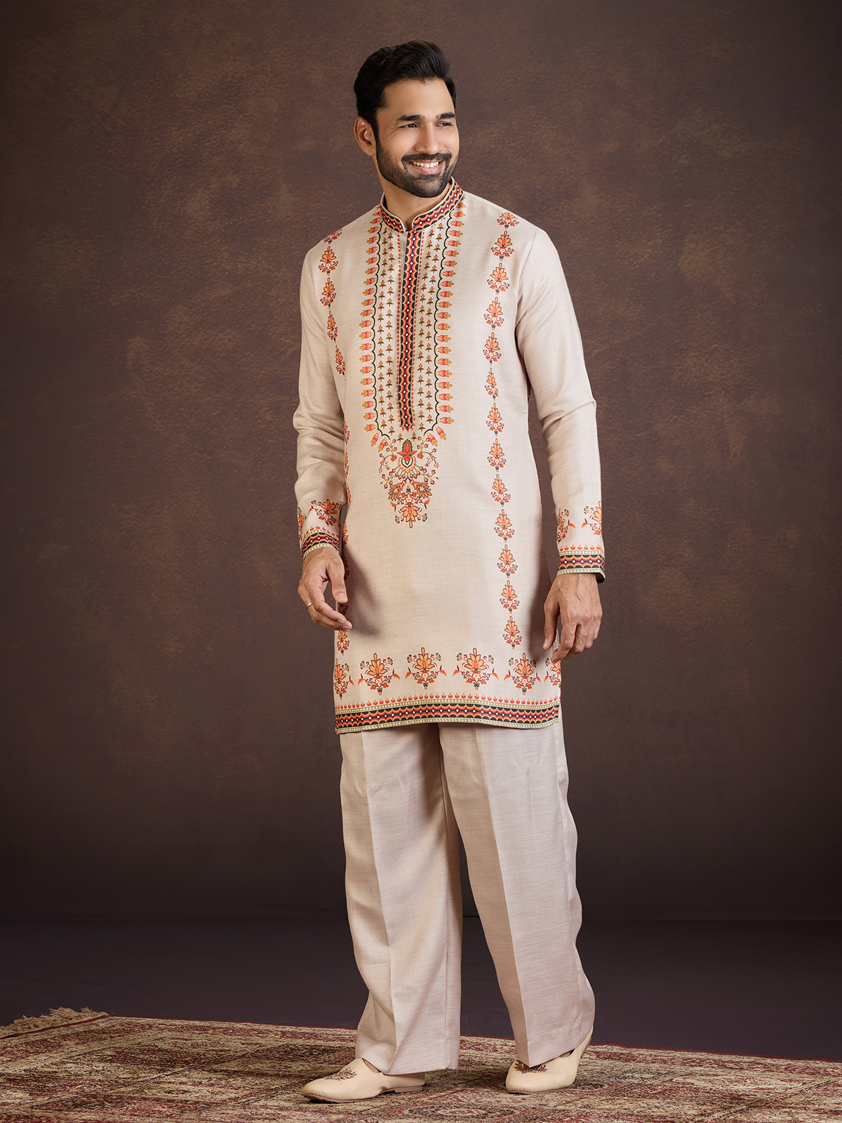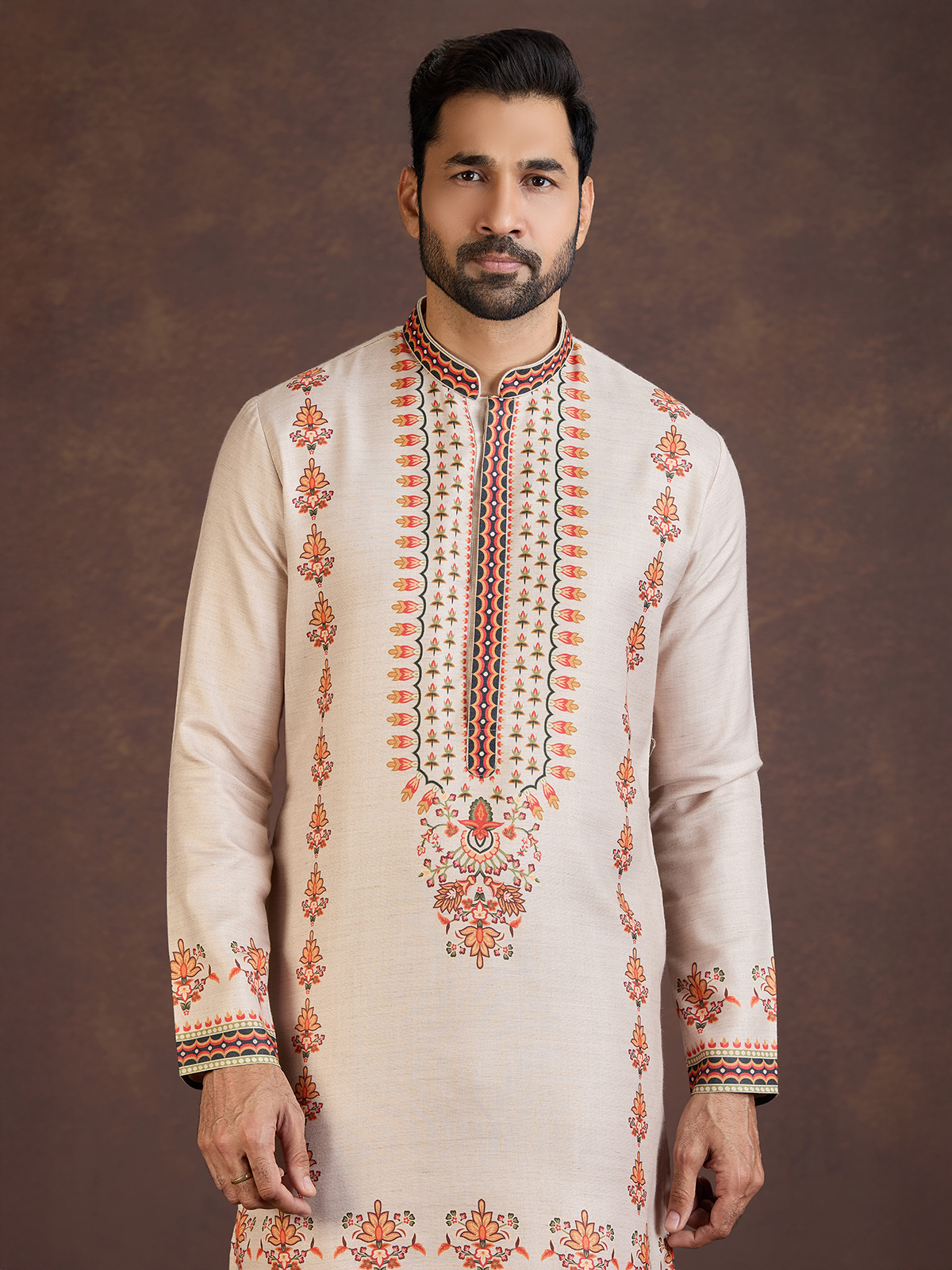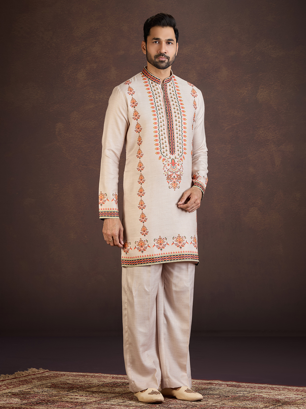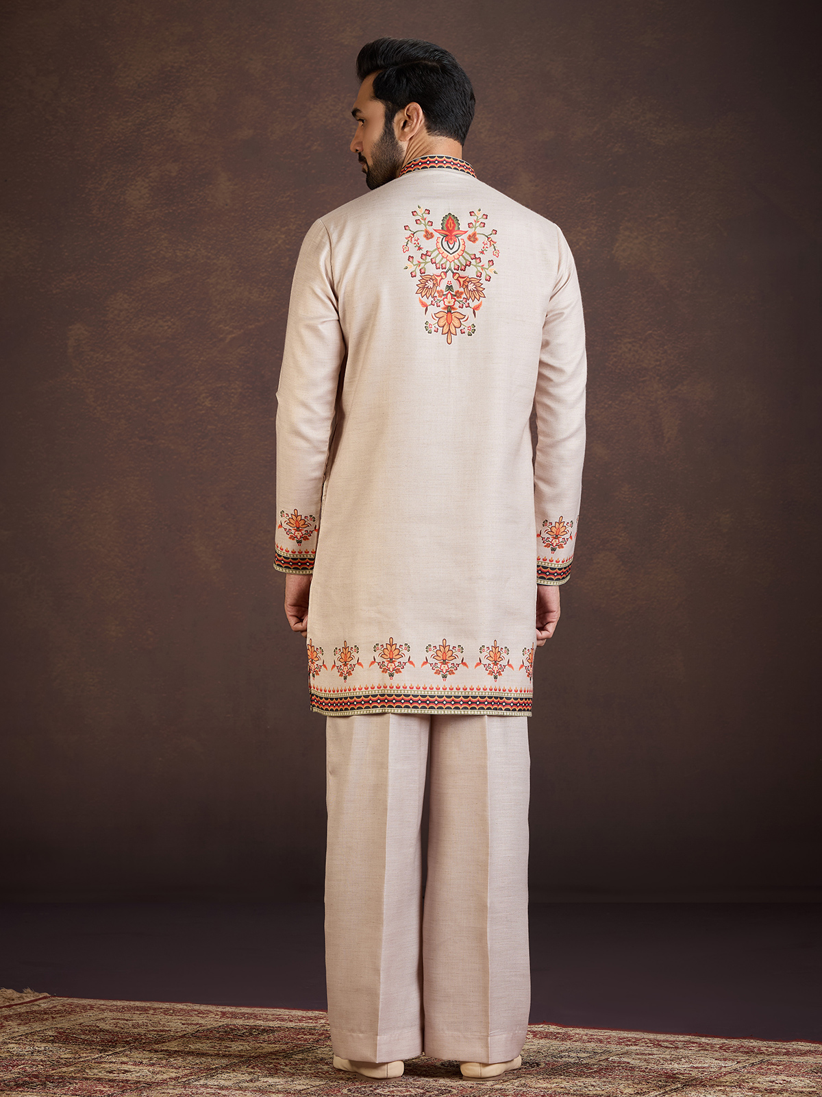 Exuding graceful heritage appeal, this beige soft linen kurta suit is designed for sophisticated festive styling. The kurta is adorned with vibrant multicolour prints arranged in traditional floral patterns across the neckline and front panel, enhanced with ornate borders on the cuffs and hem. Featuring a mandarin collar and full sleeves, it is paired with coordinated wide-leg pants, perfect for weddings, festive occasions, and family celebrations.