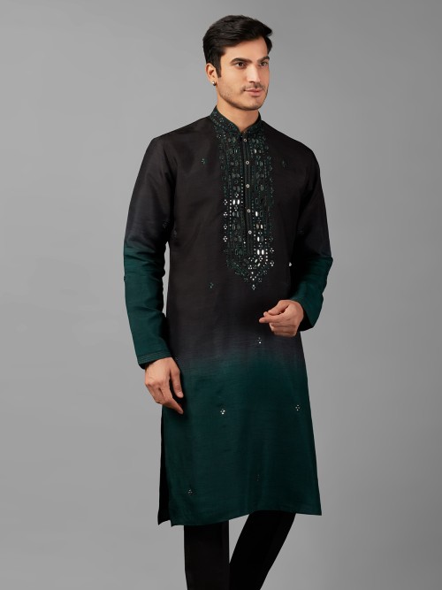 Make a unique statement with the black and rama blue shaded silk kurta suit, adorned with mirror and resham work. Its mandarin collar and full sleeves offer an authentic look, paired with a bottom for a standout ensemble.