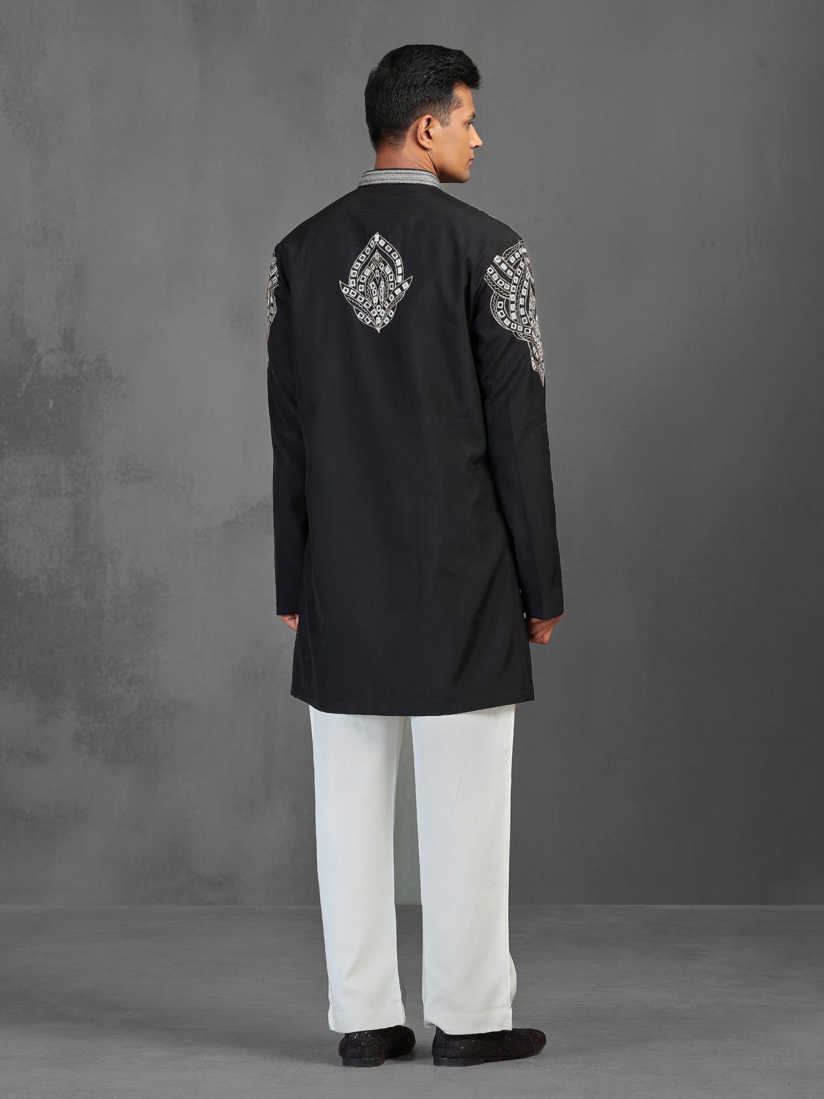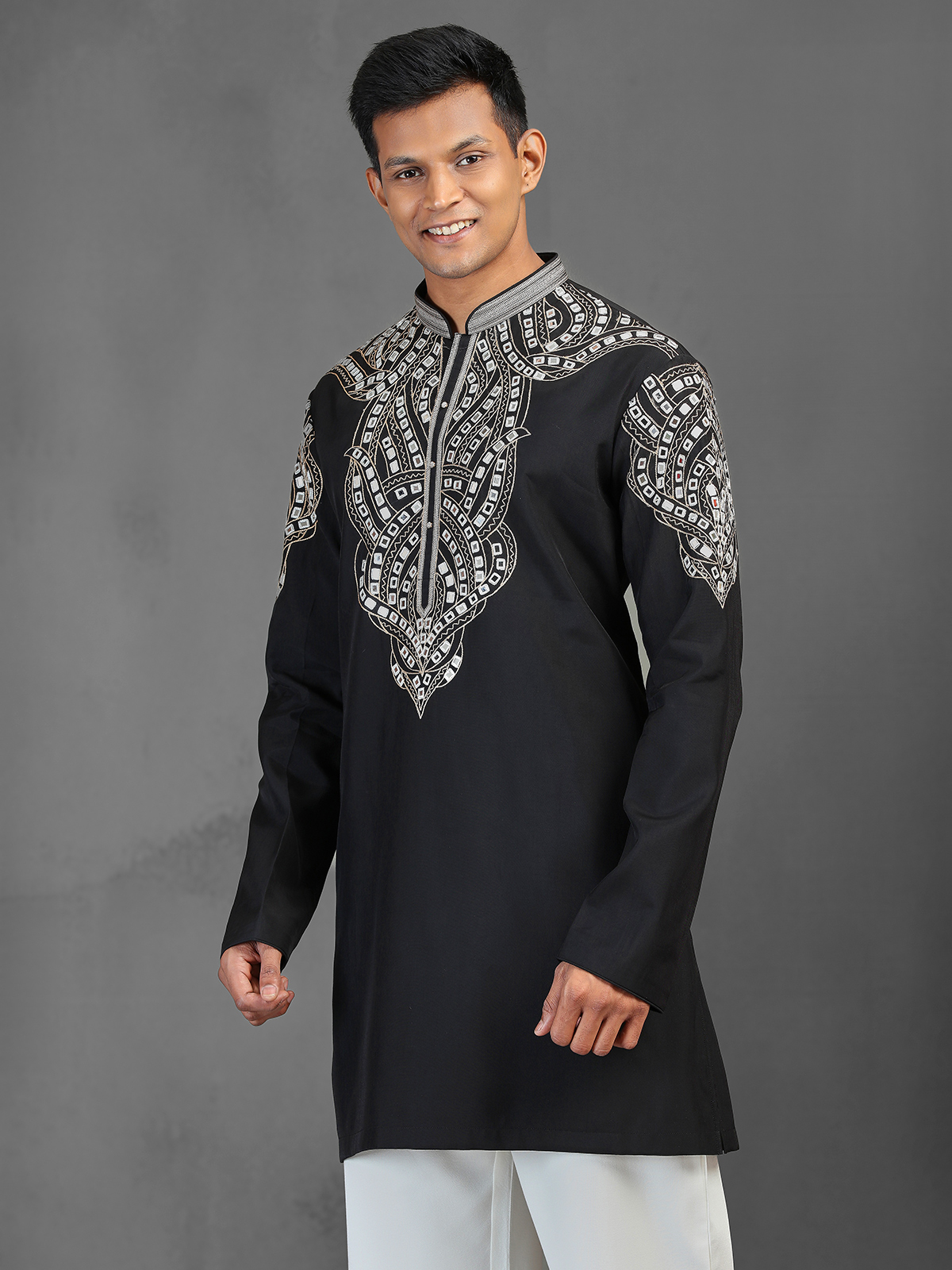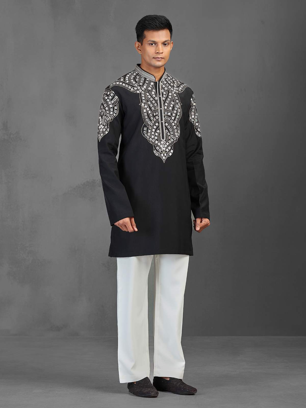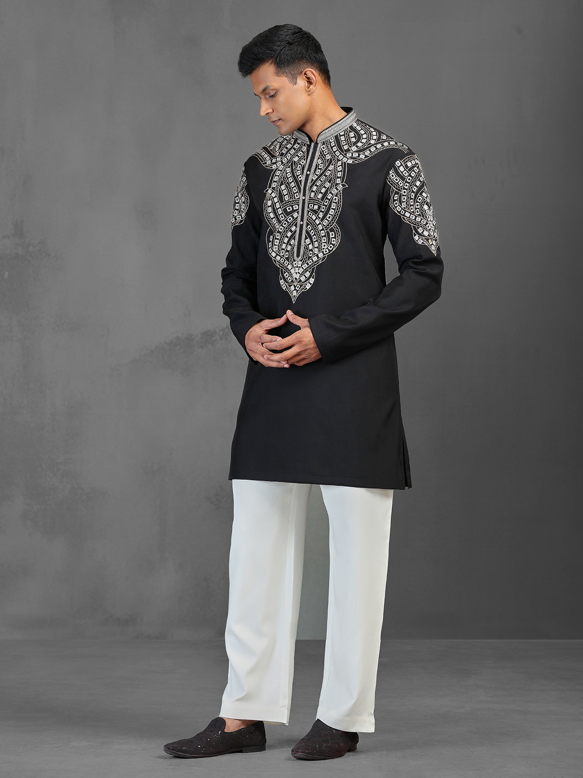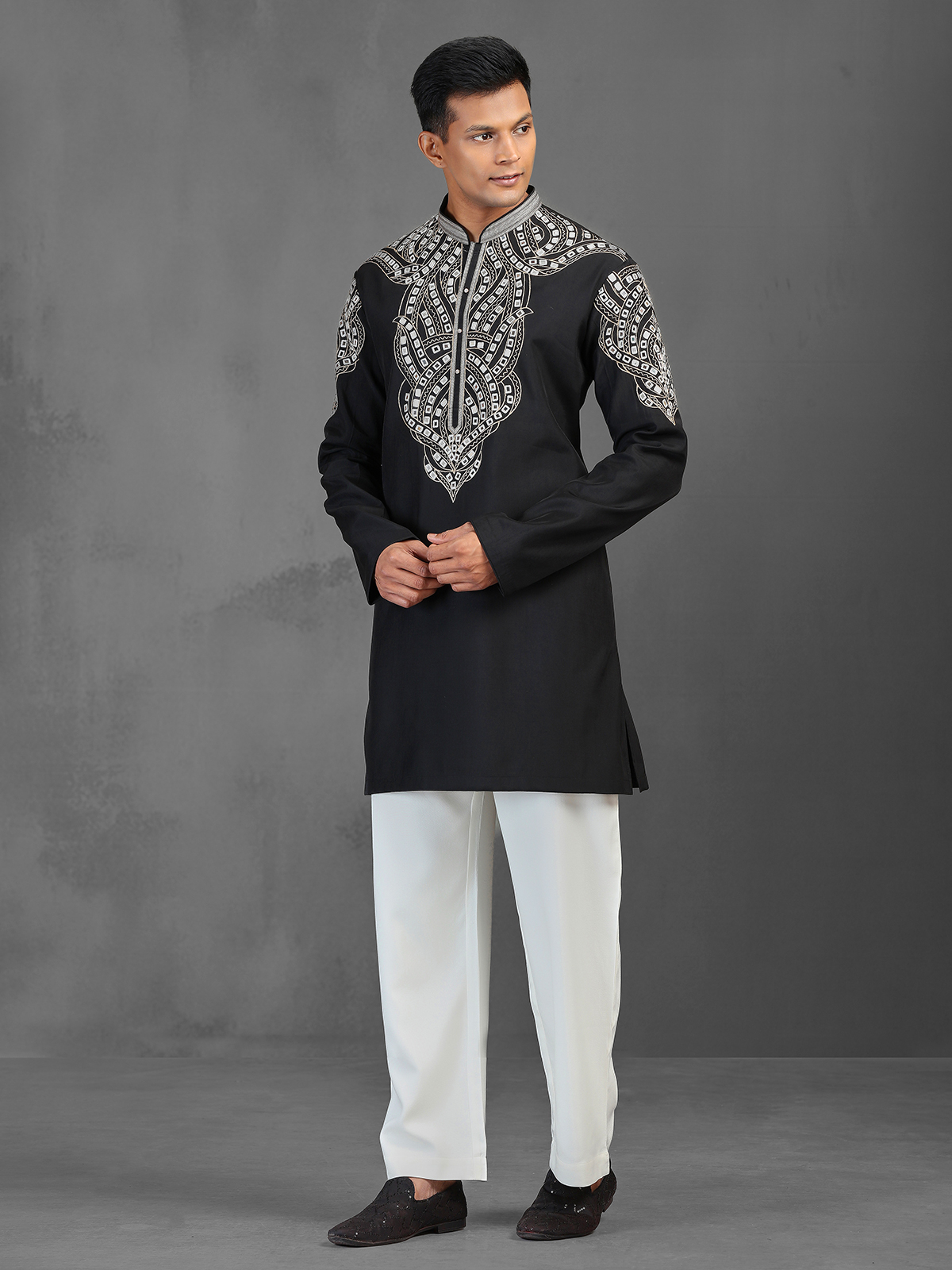 Exuding timeless sophistication, this black art silk kurta set features a mid-length, straight-cut silhouette designed for elegant occasions. The kurta is detailed with refined mirror-work and thread embroidery along the Chinese collar, sleeve cuffs, and placket, offering a subtle festive shine. Paired with straight-fit trousers, it is an ideal choice for receptions, weddings, and evening celebrations.