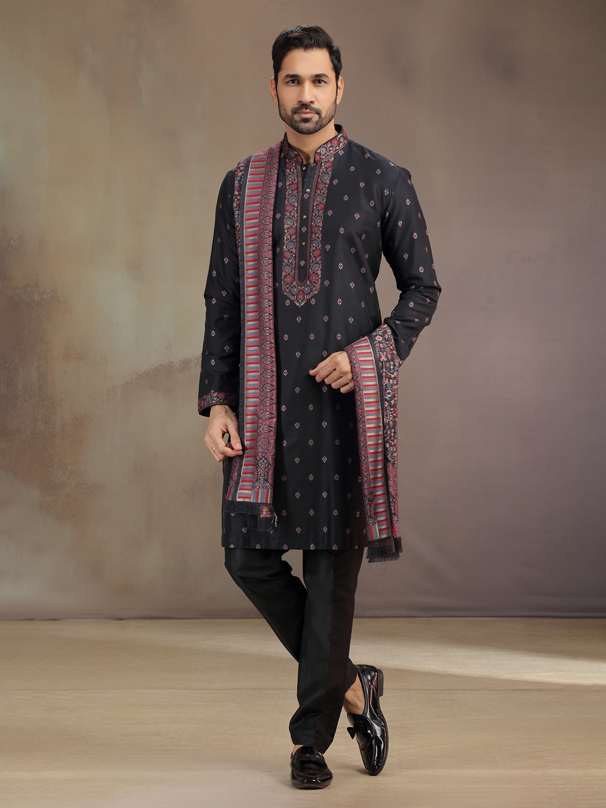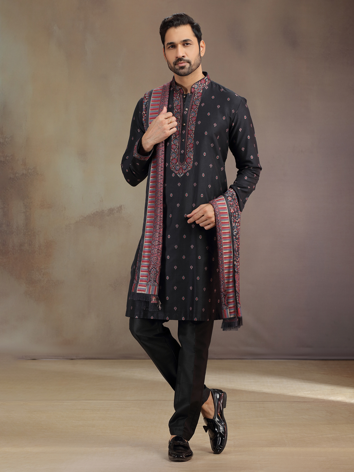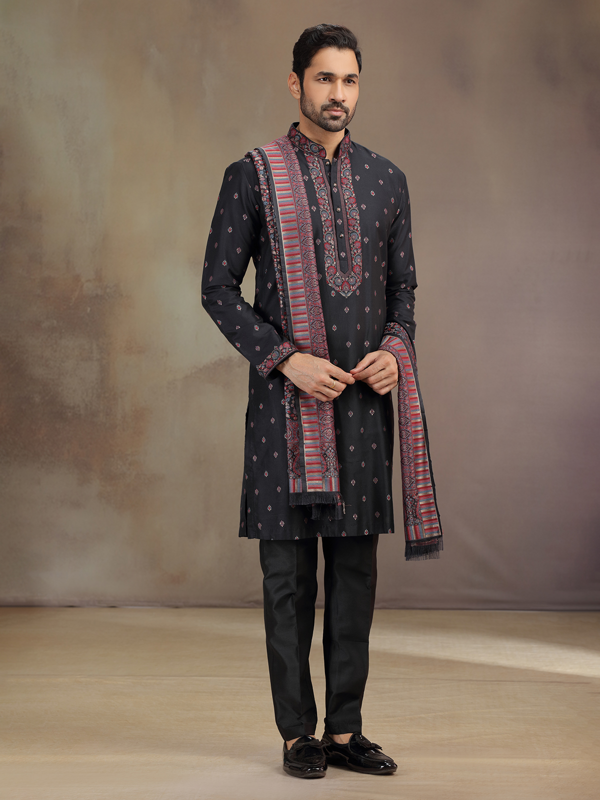 Classic charm meets cultural refinement in this black cotton silk kurta pajama. The delicate thread work highlights its full sleeves and graceful mandarin collar. Paired with pants and dupatta, the ensemble exudes quiet grandeur, designed for festivals that call for timeless sophistication and graceful celebration.