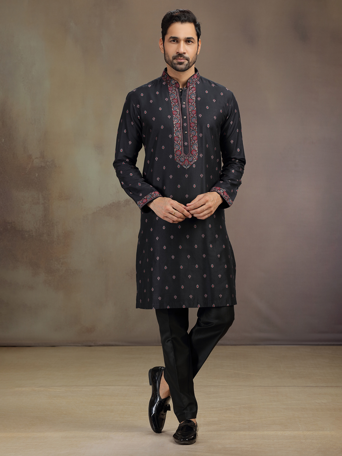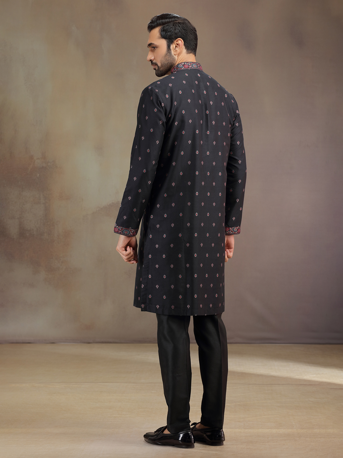 Black Cotton Silk Kurta Pajama With Woven Detailing