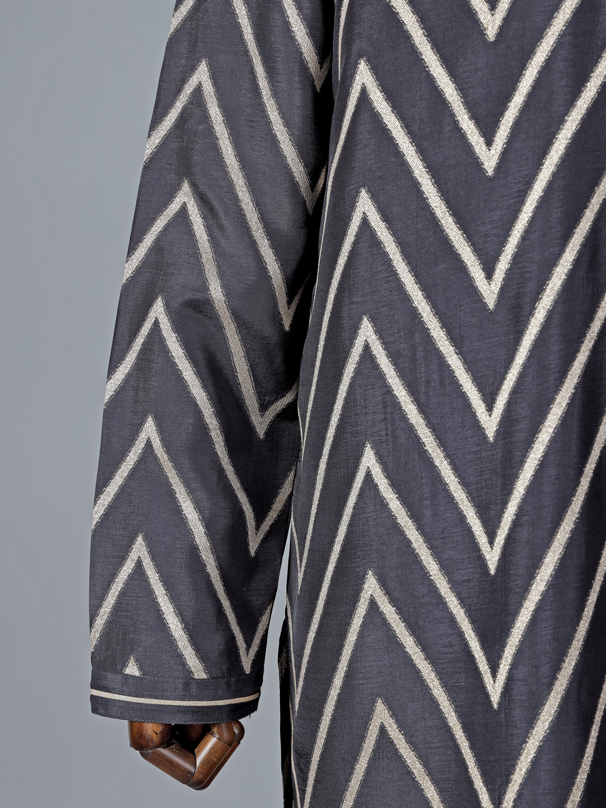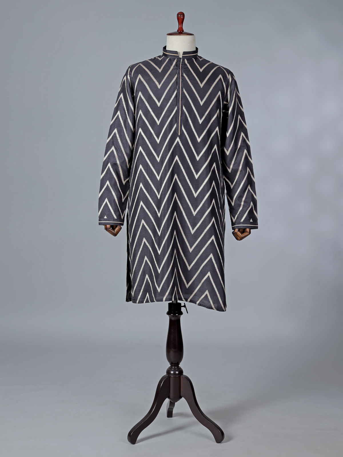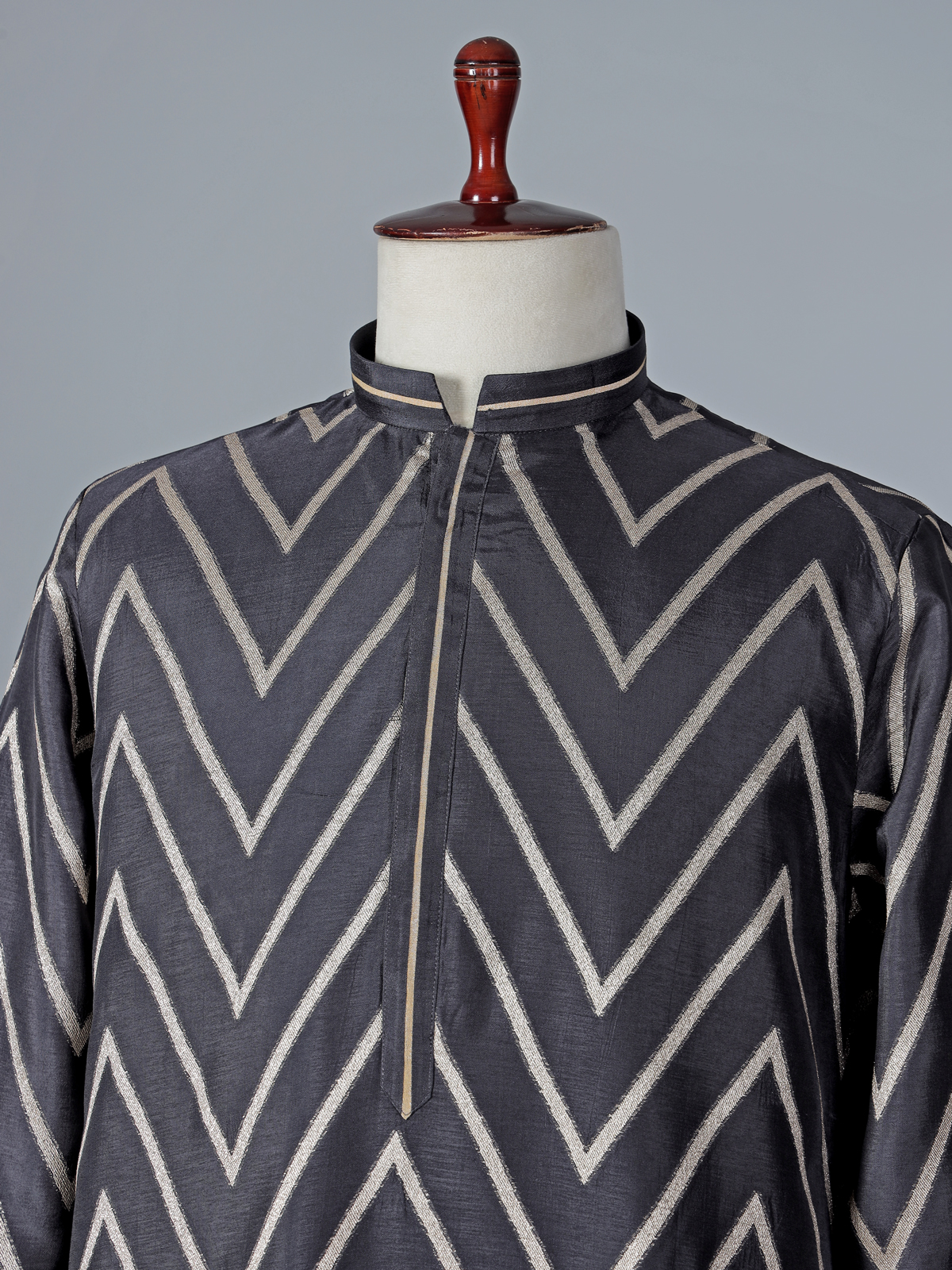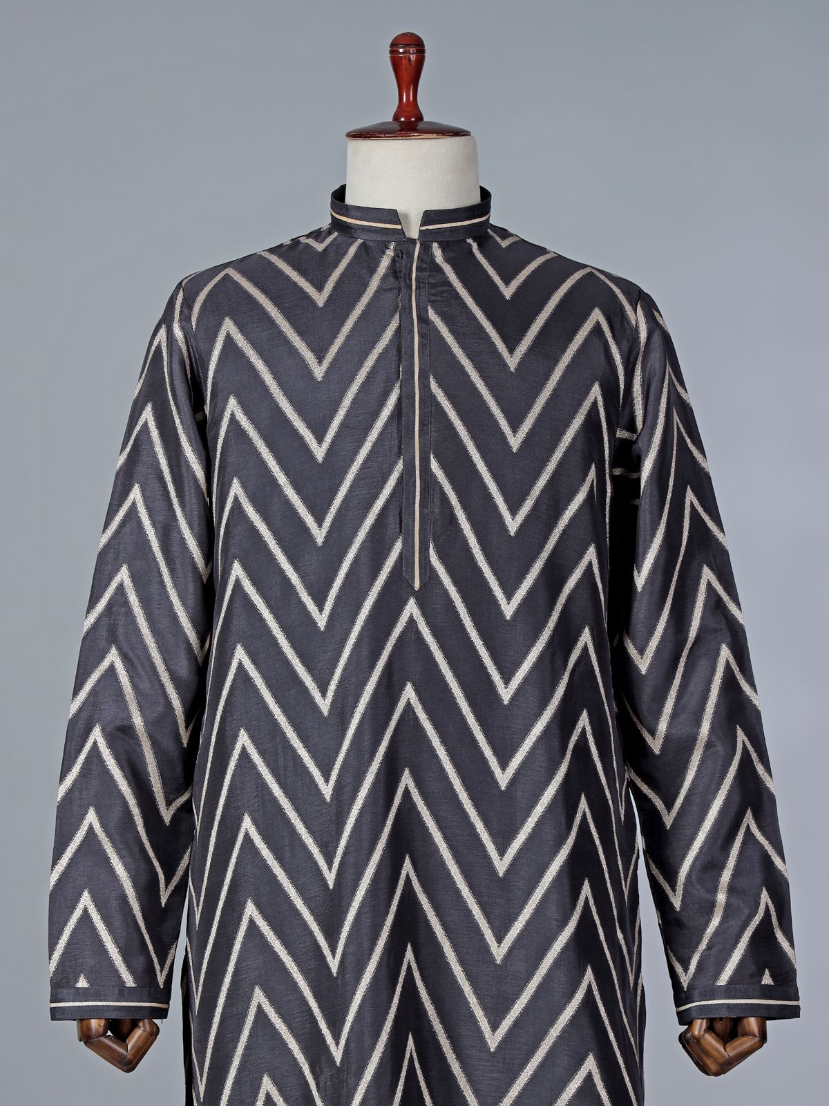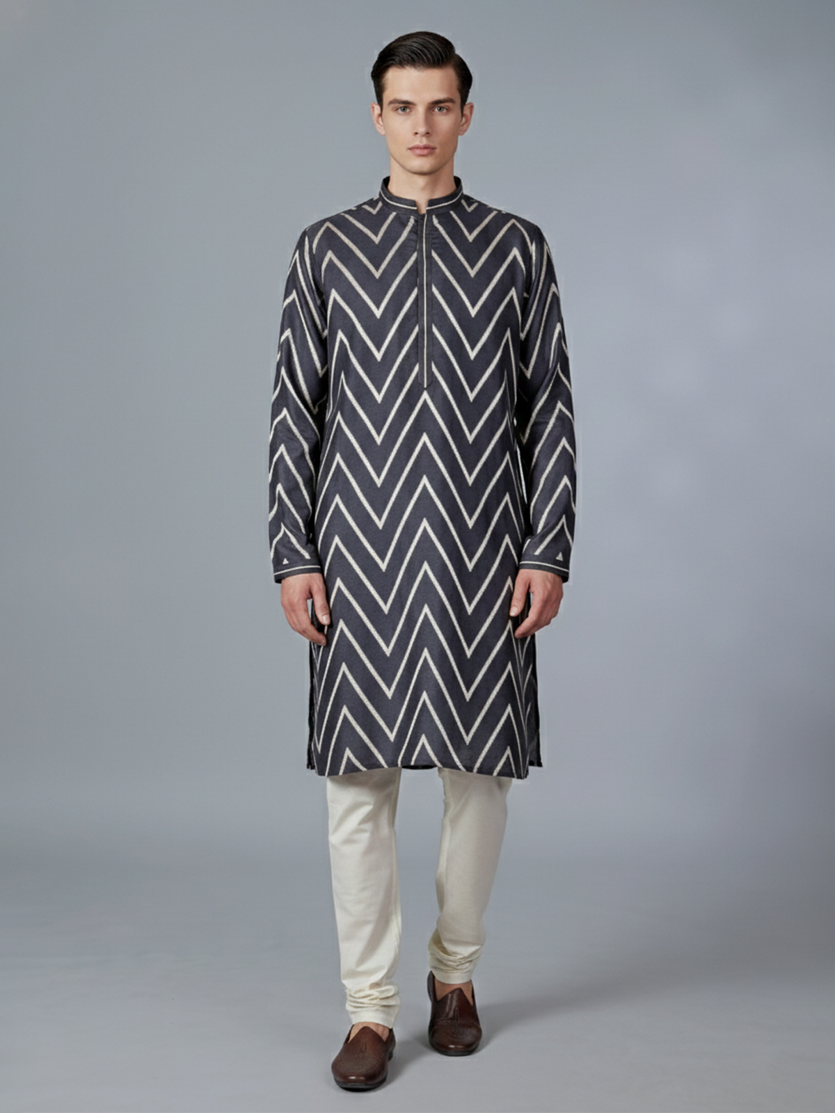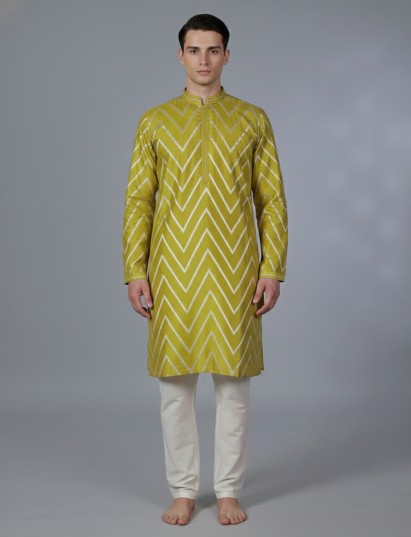 This black cotton silk kurta suit stands out with its bold yet classic festive appeal. Highlighted with elegant zig-zag zari work, the kurta reflects rich traditional craftsmanship. The chinese collar with half button placket and full sleeves enhances its structured silhouette, while pant complete the refined look. Ideal for estival and Eid occasions, this ensemble is perfect for men seeking sophistication with timeless ethnic richness.