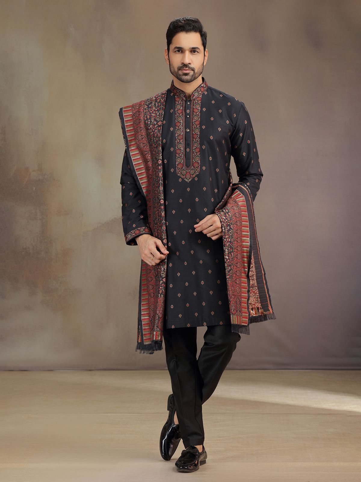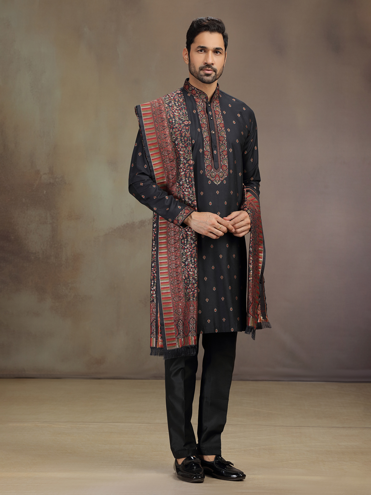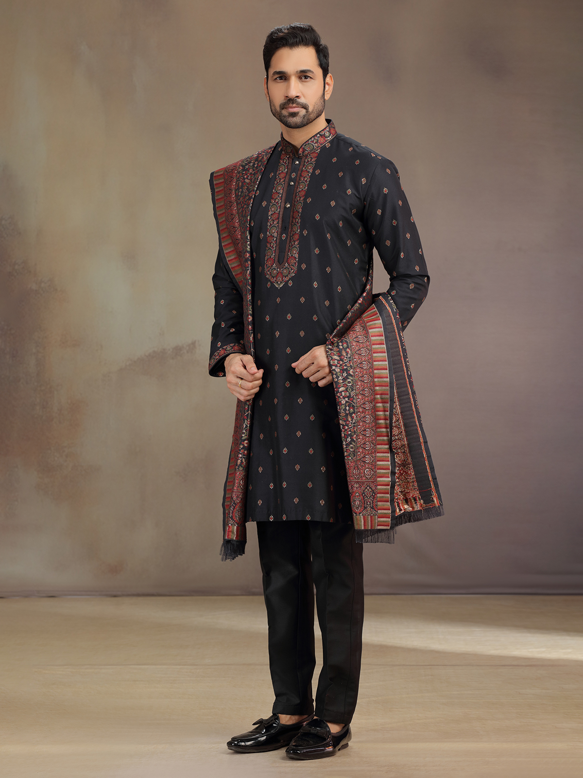 Timeless in black, this cotton silk kurta pajama presents a refined silhouette for special festivities. Elegant thread work frames the mandarin collar accentuating its full-sleeved design. Paired with complementing pants and dupatta, it resonates with cultural depth and contemporary style, perfect for festive evenings and traditional gatherings alike.