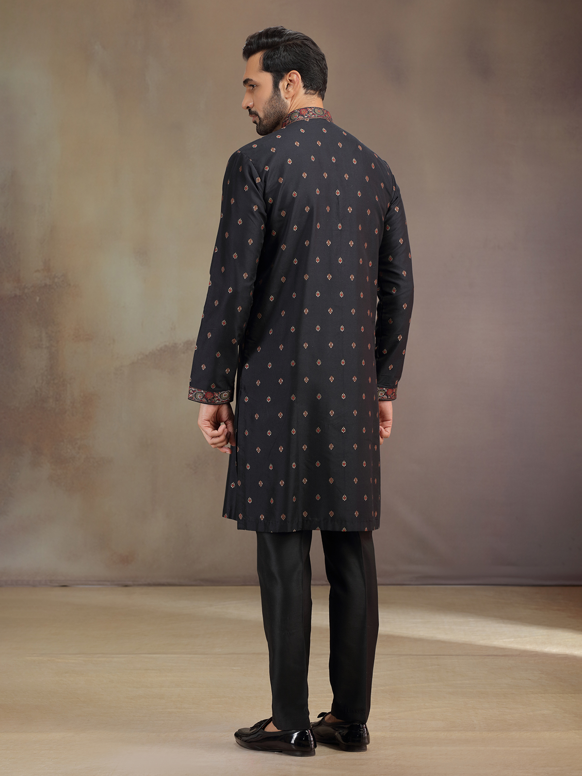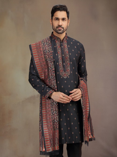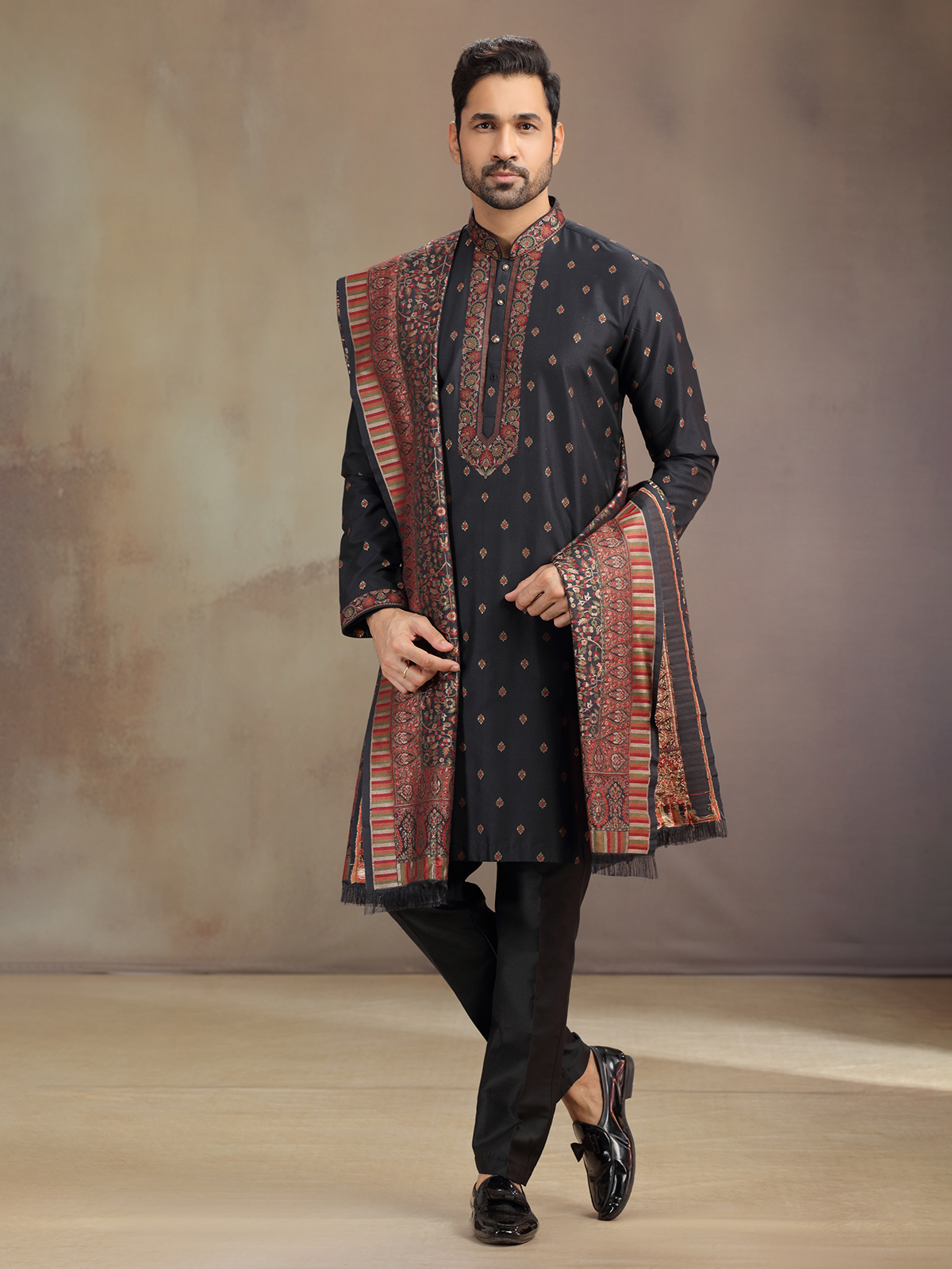 Timeless in black, this cotton silk kurta pajama presents a refined silhouette for special festivities. Elegant thread work frames the mandarin collar accentuating its full-sleeved design. Paired with complementing pants and dupatta, it resonates with cultural depth and contemporary style, perfect for festive evenings and traditional gatherings alike.