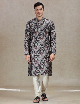 Perfect for special occasions, this black kurta set is designed to leave a lasting impression. Crafted from luxurious tussar silk, it features intricate all-over embroidery complemented by a chic printed pattern. The mandarin collar and full sleeves add a refined touch to its overall appeal. Paired with coordinated pant, this ensemble ensures you make a graceful and elegant entrance at any celebration.