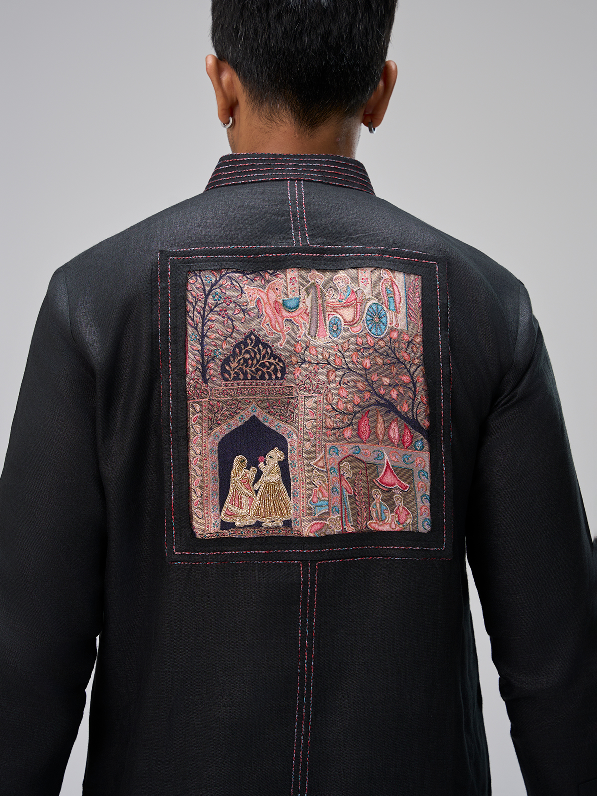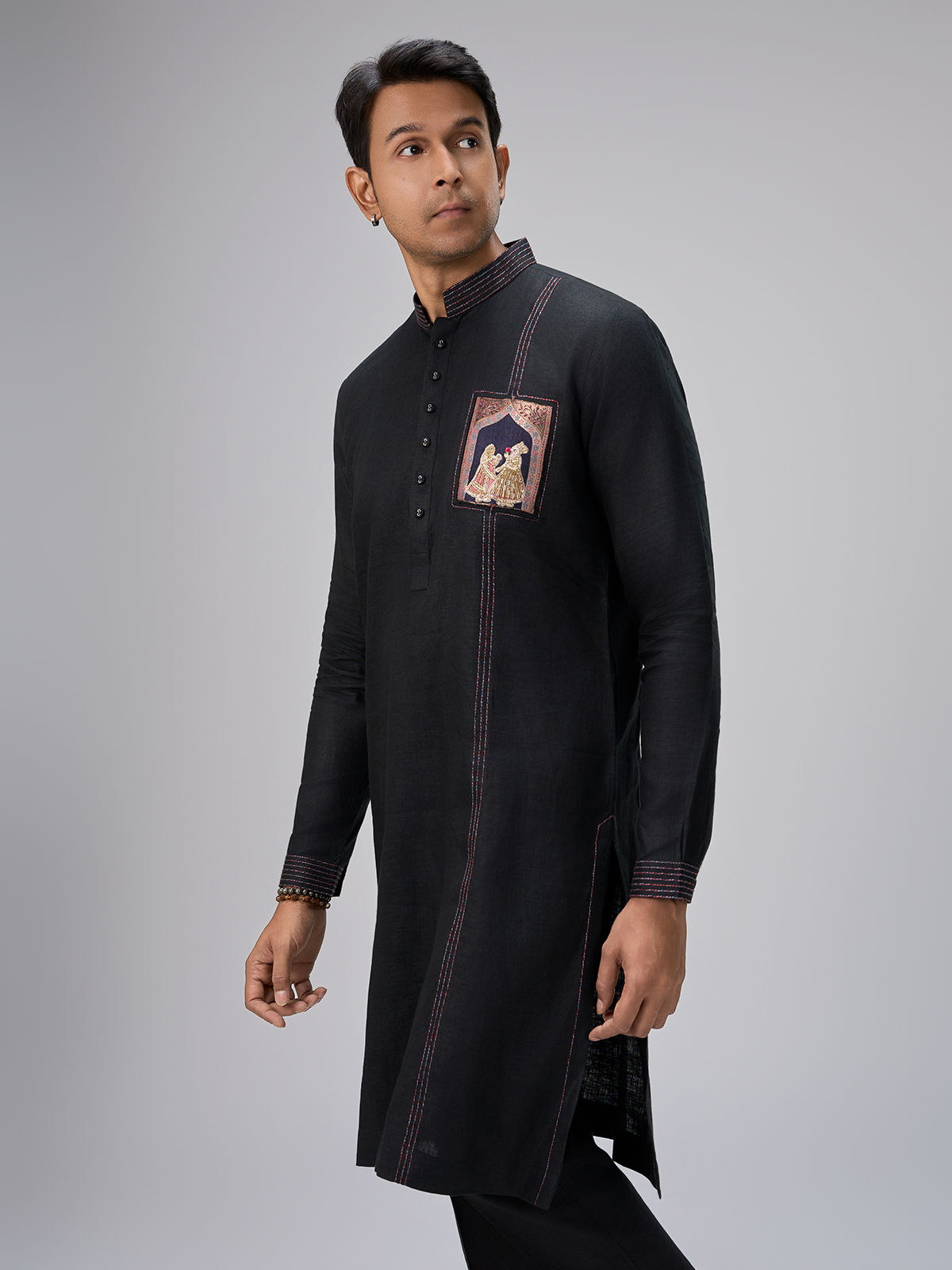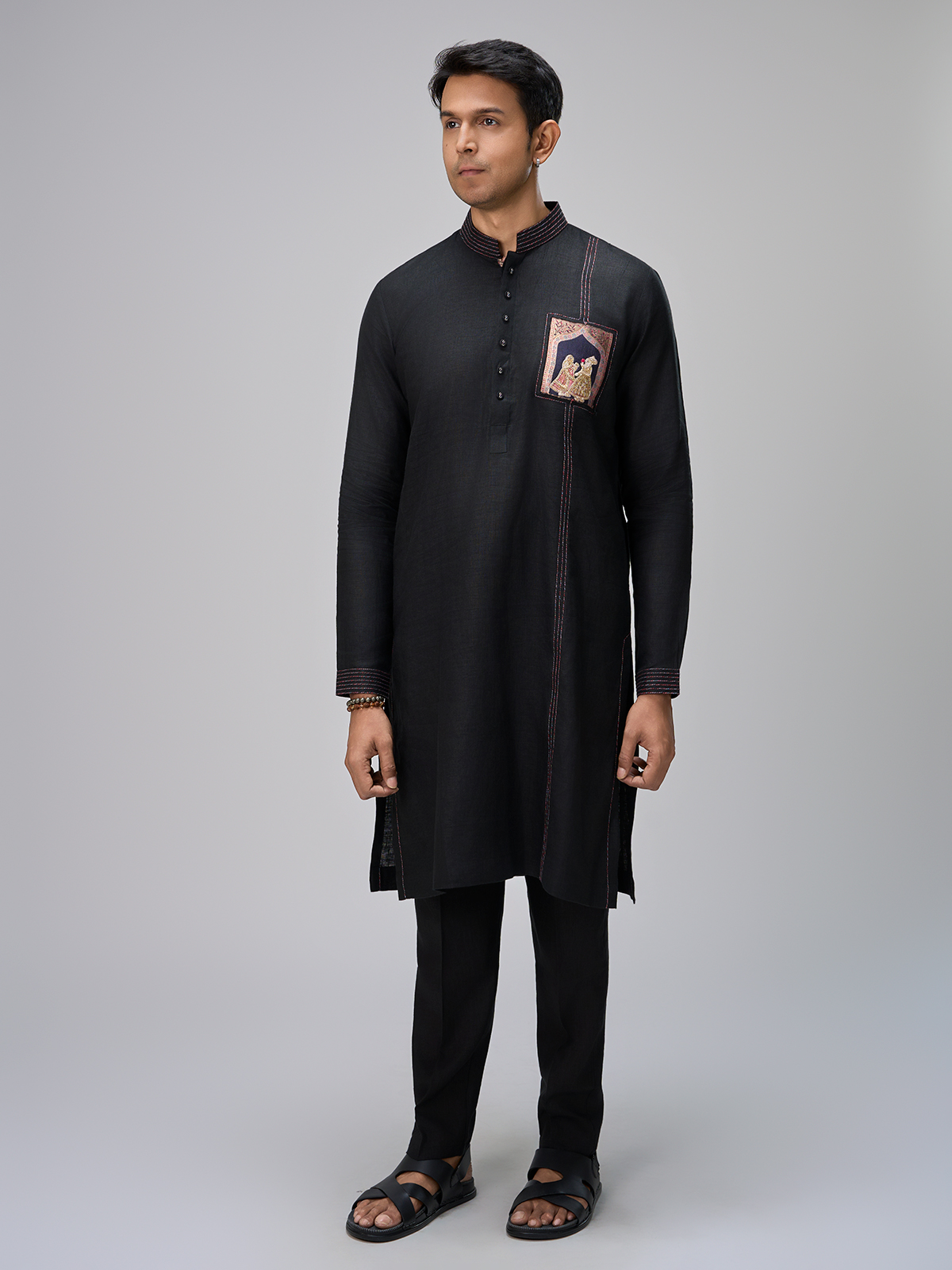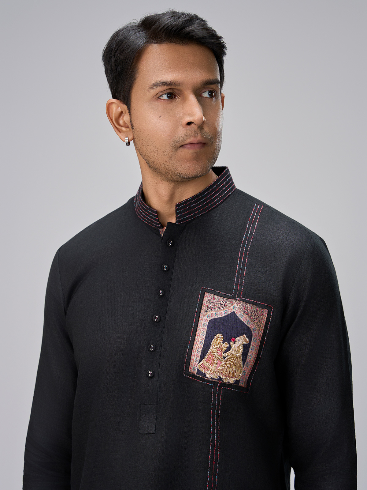 A black linen kurta enriched with cutdana, patch, thread and bead craftsmanship brings subtle festive brilliance. The chinese collar shapes a modern, tidy outline suitable for receptions and sangeet. The pant adds easy movement with an elegant finish.