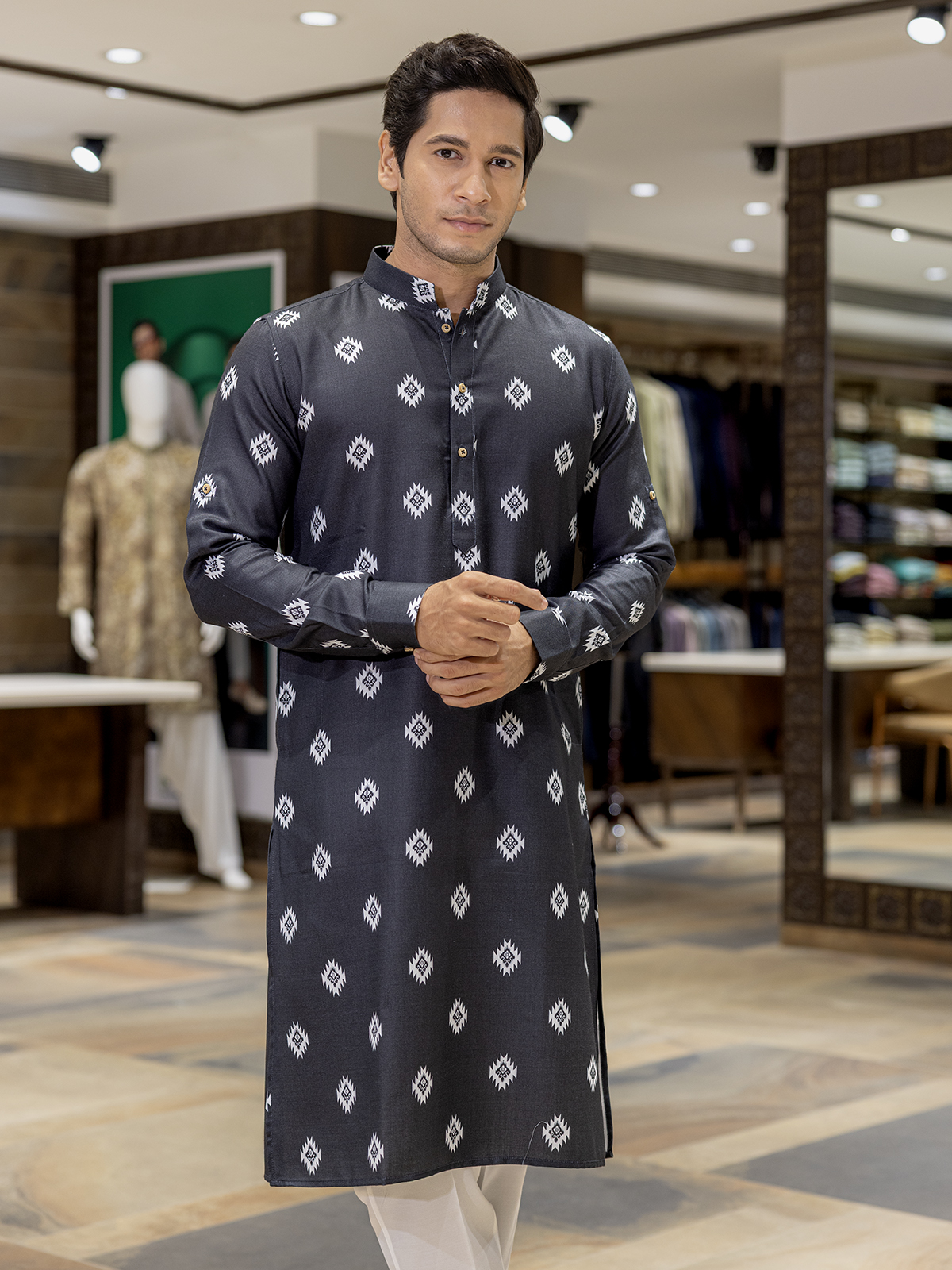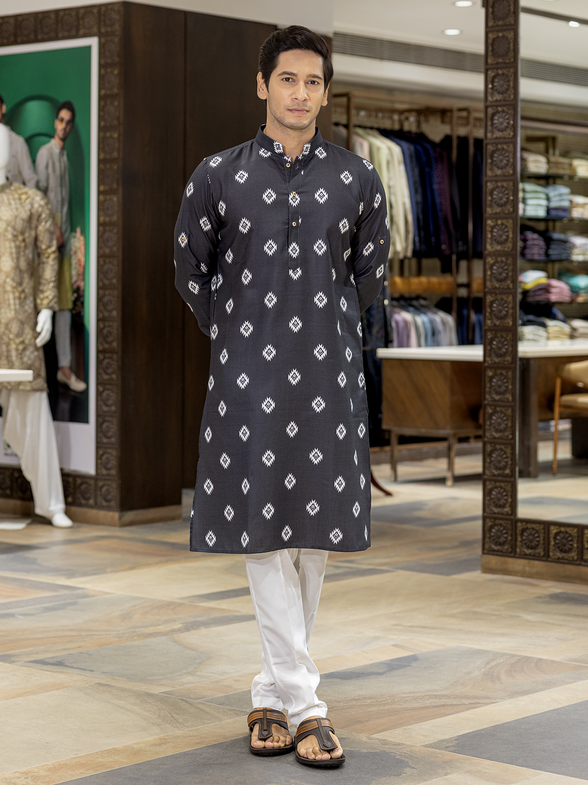 Charm in black, cotton silk kurta suit is styled with pant, mandarin collar, and full sleeves. The ensemble is uplifted with a printed design, combining subtle sophistication and festive appeal, perfect for traditional events and joyful occasions.
