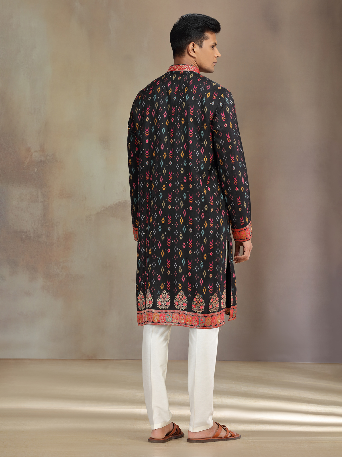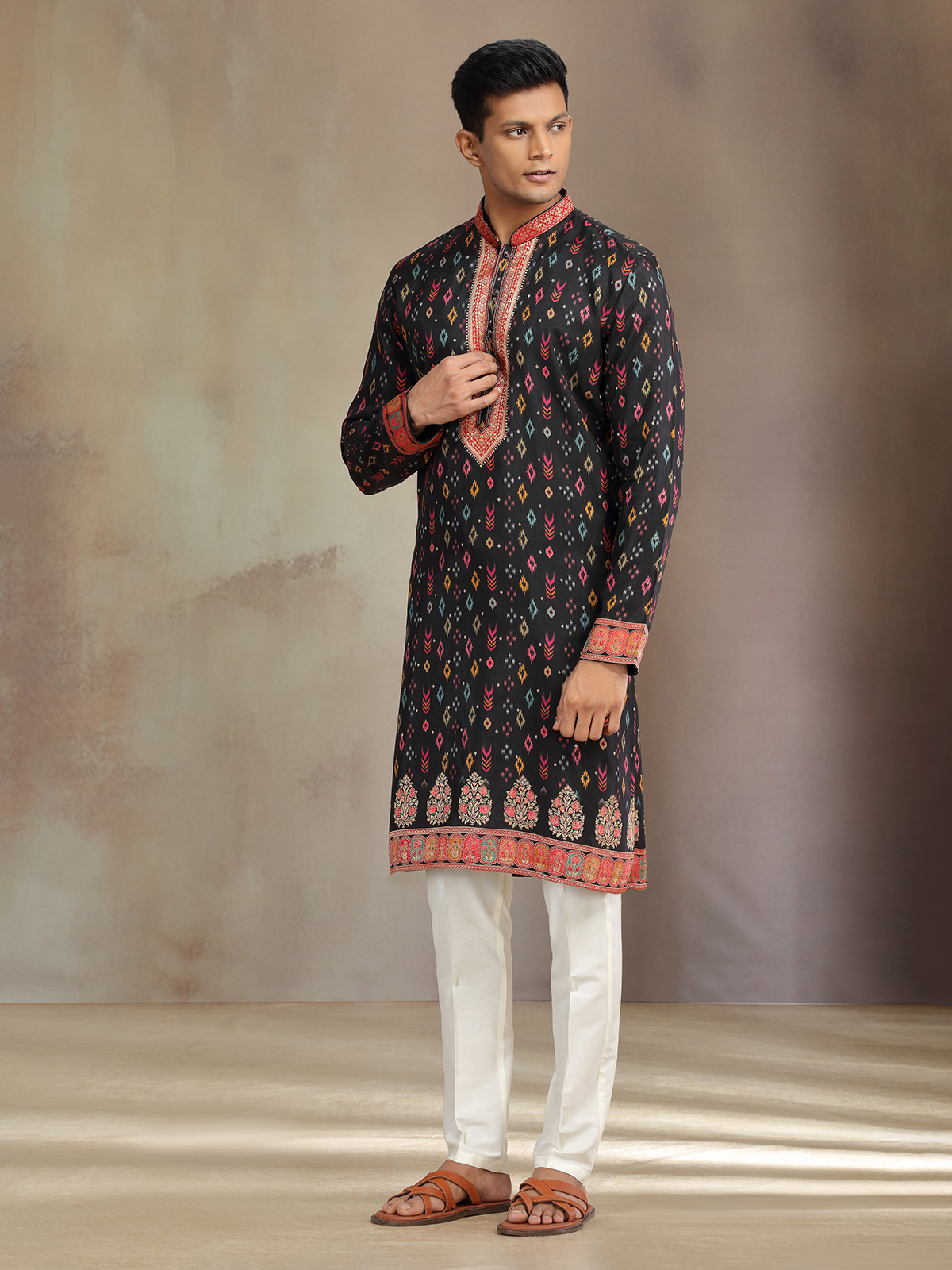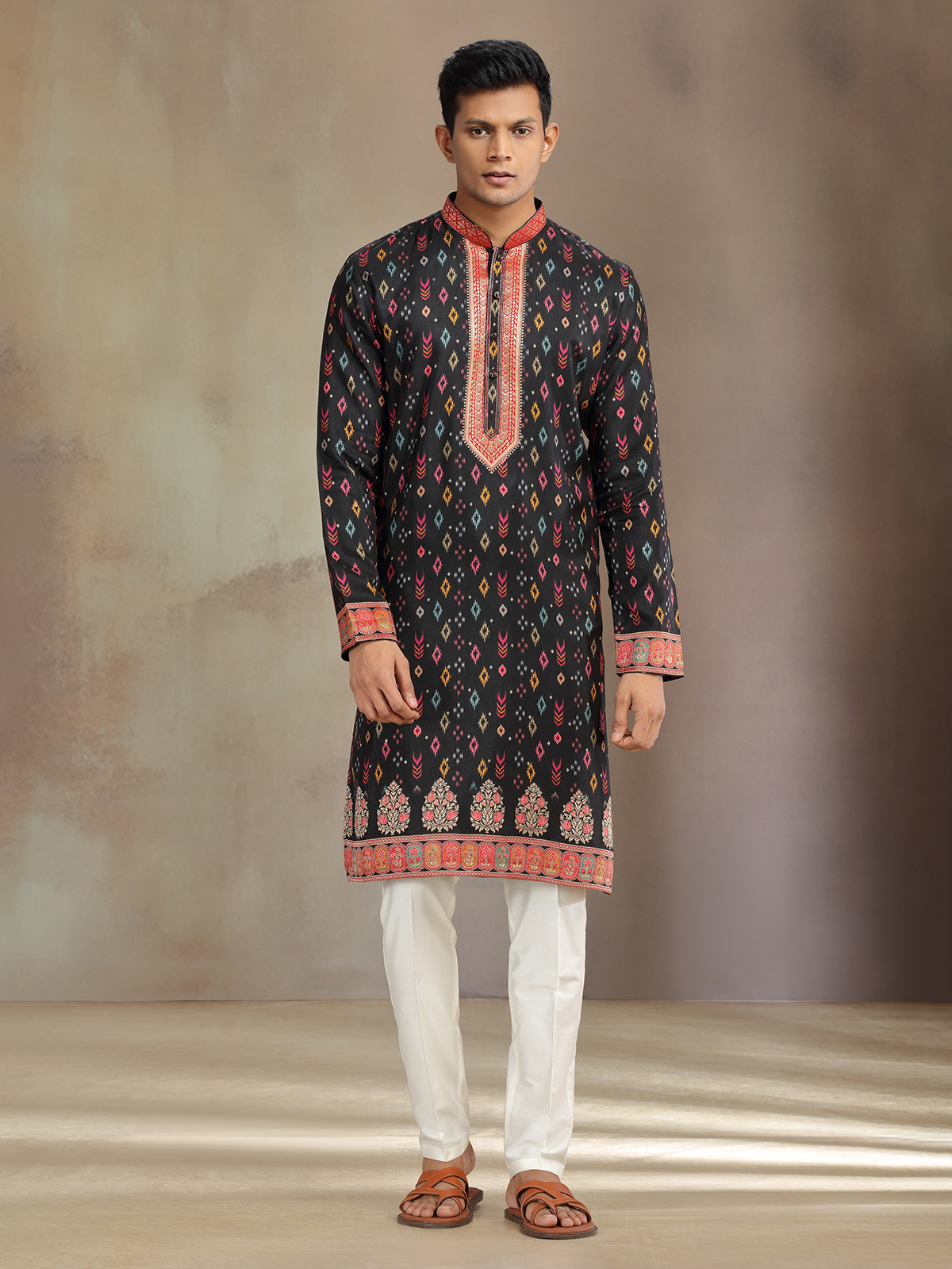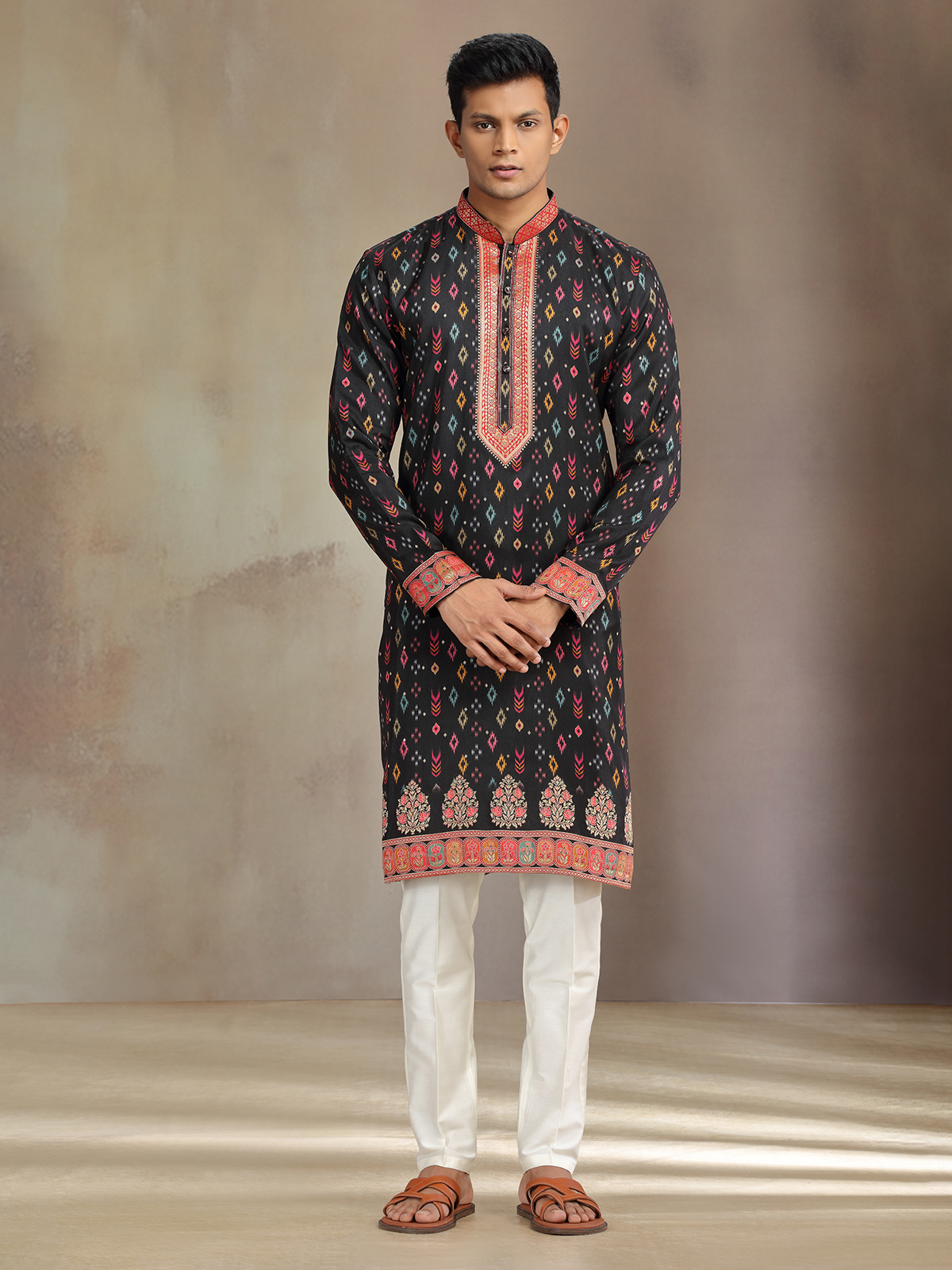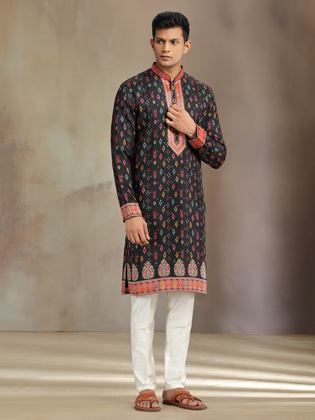 Black Printed Festive Wear Silk Kurta Suit For Men