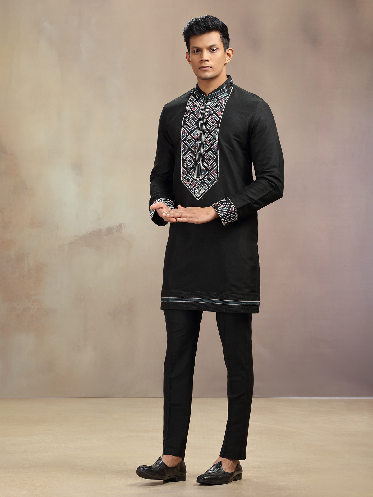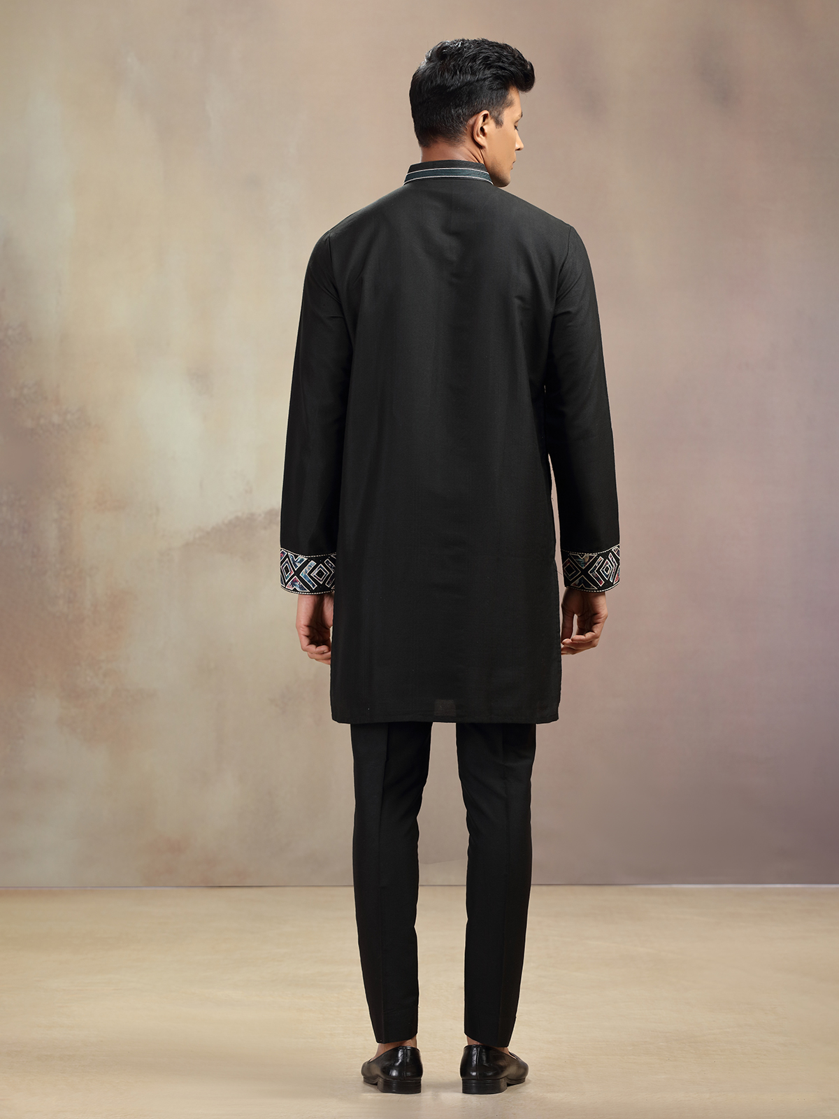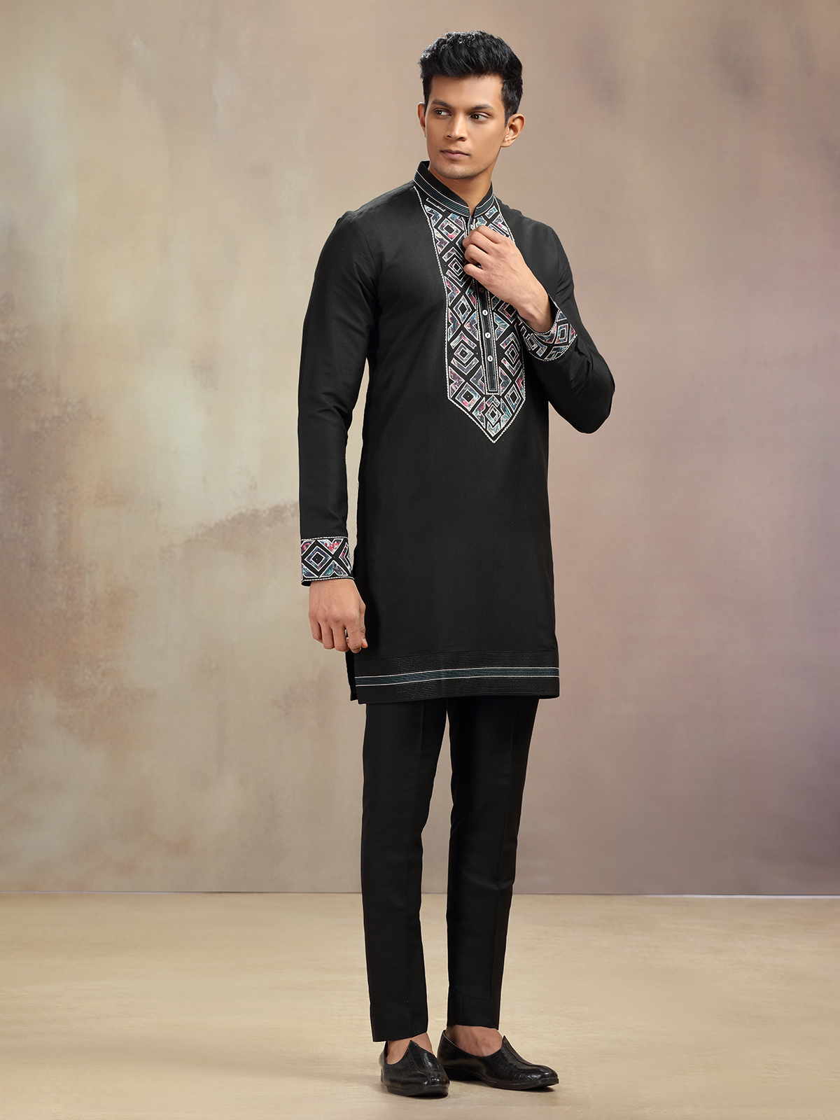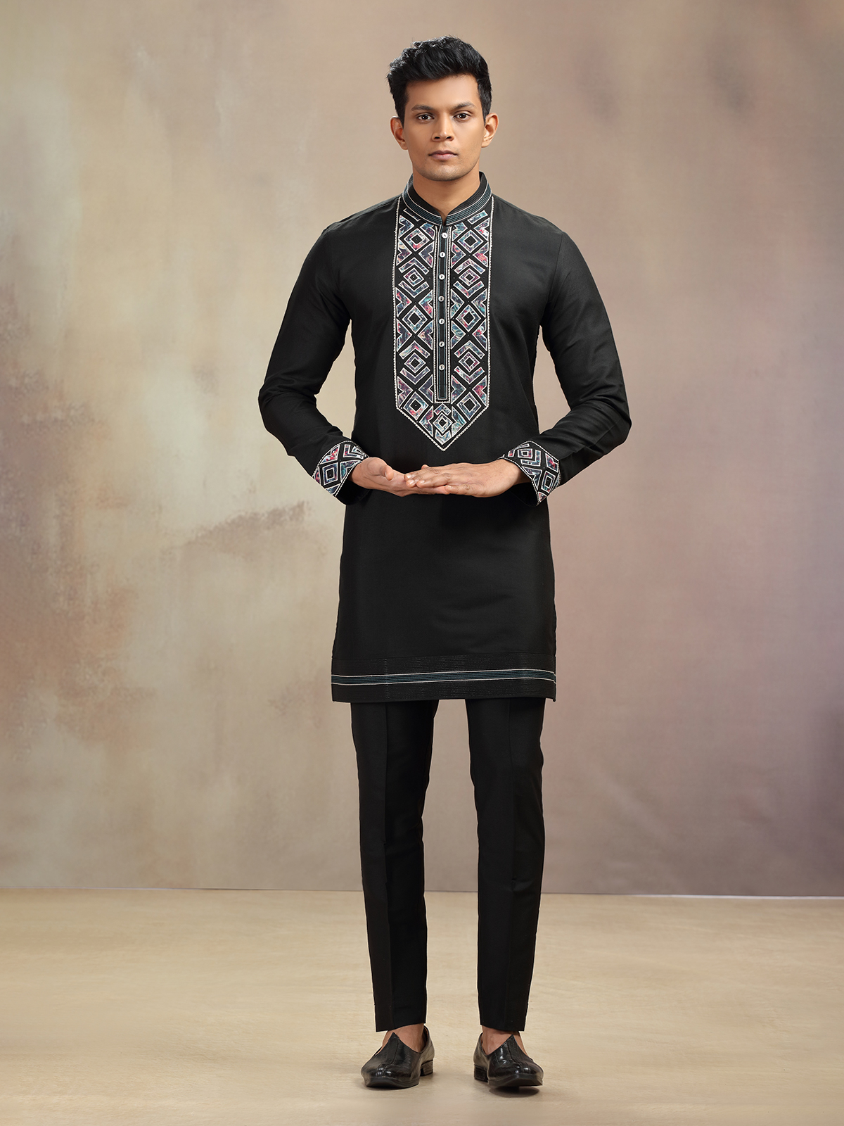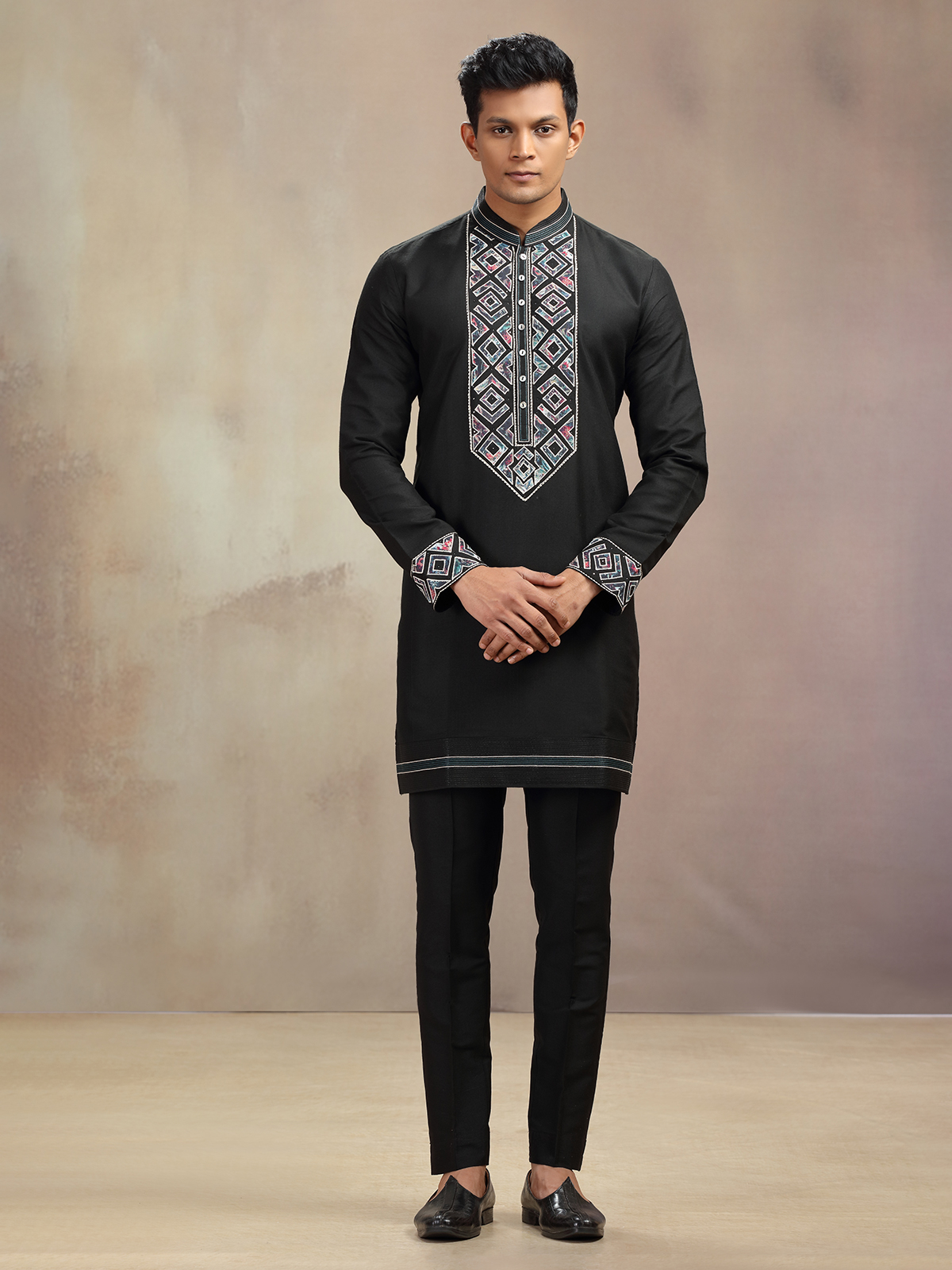 Regal black banarasi silk shimmers with Swarovski accents and intricate embroidery, radiating a luxurious festive glow. Mandarin collar and full sleeves frame a modern yet classic silhouette. Matched with a sleek pant, this ensemble harmonizes elegance and celebration, capturing attention with refined sparkle at weddings and joyous festive nights.