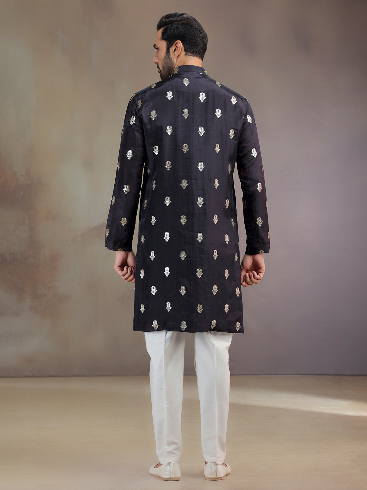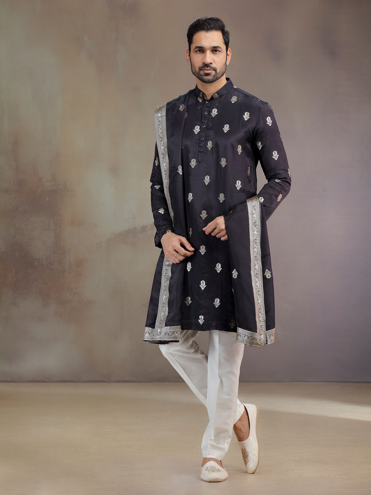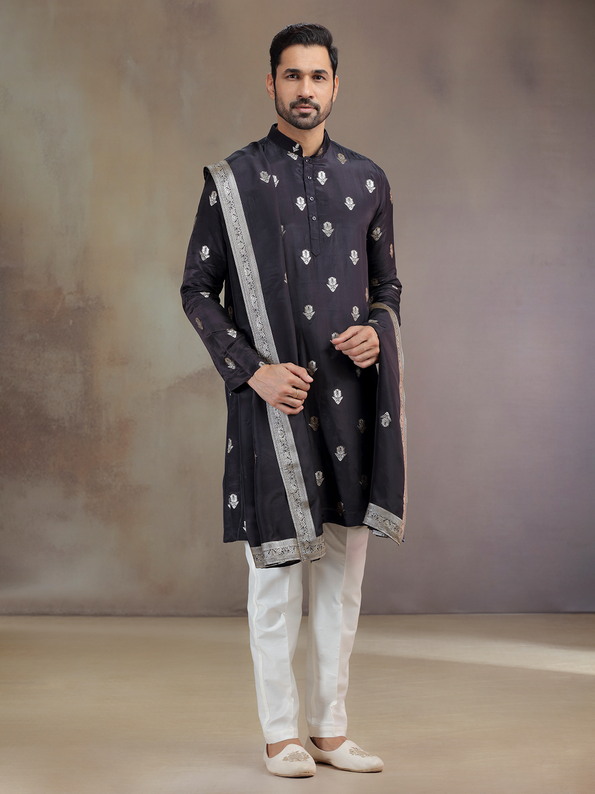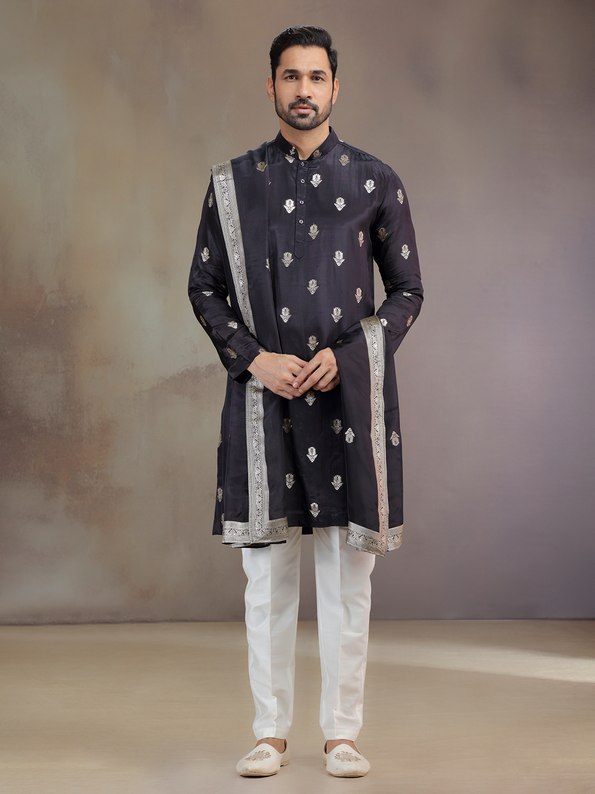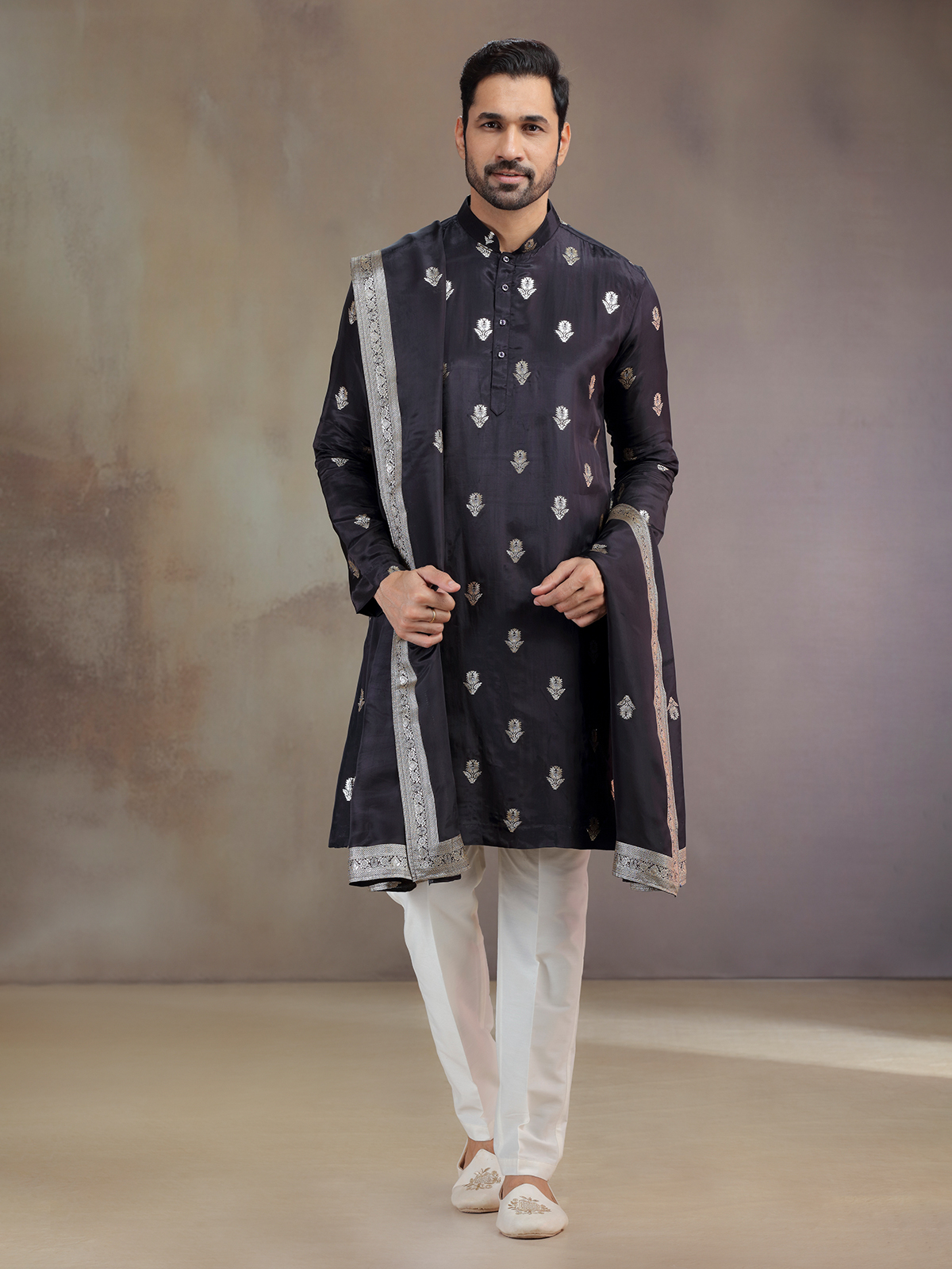 Shrouded in regal mystique, this black silk kurta pajama is enriched with zari detailing. The shimmering work gracefully complements the full sleeves and mandarin collar, elevating its poise. Accompanied by a refined zari enriched dupatta and pant, it is perfect for festivals and wedding ceremonies where grandeur meets tradition, enveloping the wearer in bold elegance and striking sophistication.