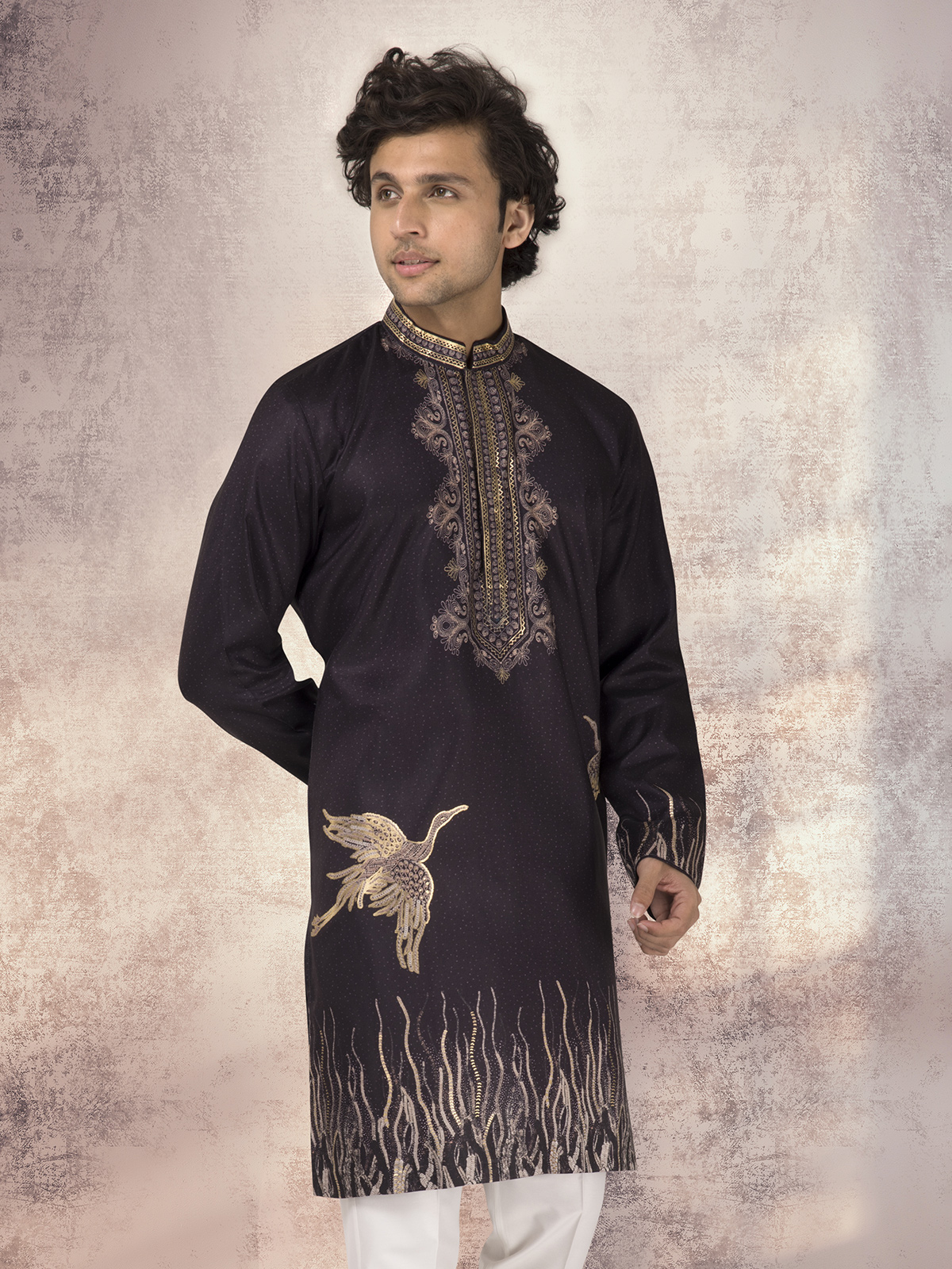 Designed in luxurious black silk, this printed kurta suit gleams with intricate zari detailing. The mandarin collar defines its sharp silhouette, paired with pants for a regal, festive charm. Ideal for wedding nights or cultural soirées.