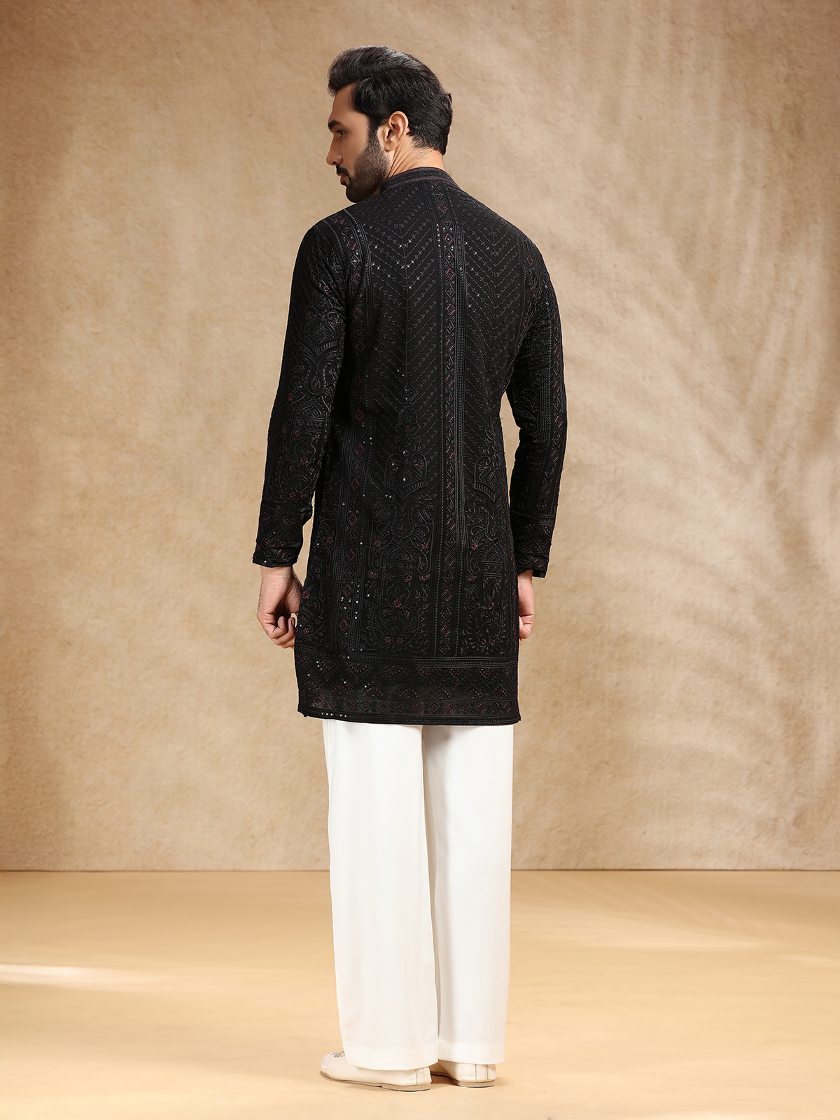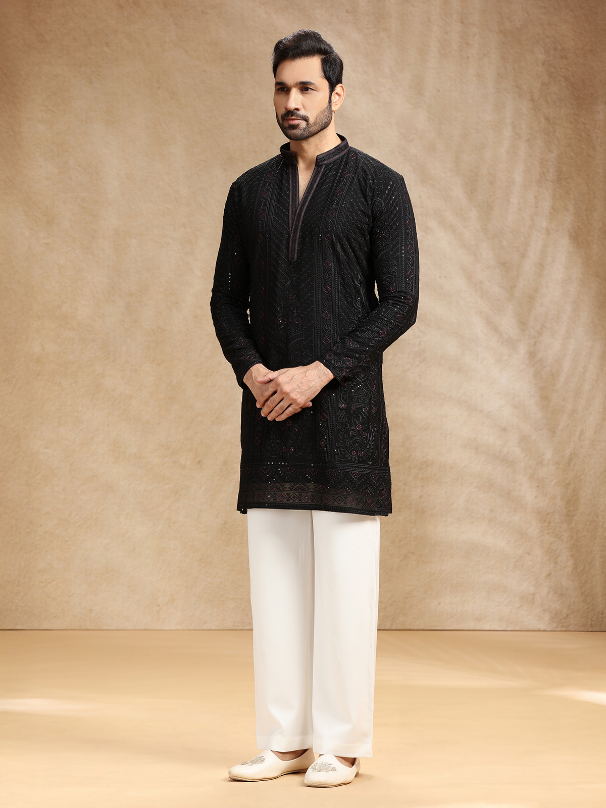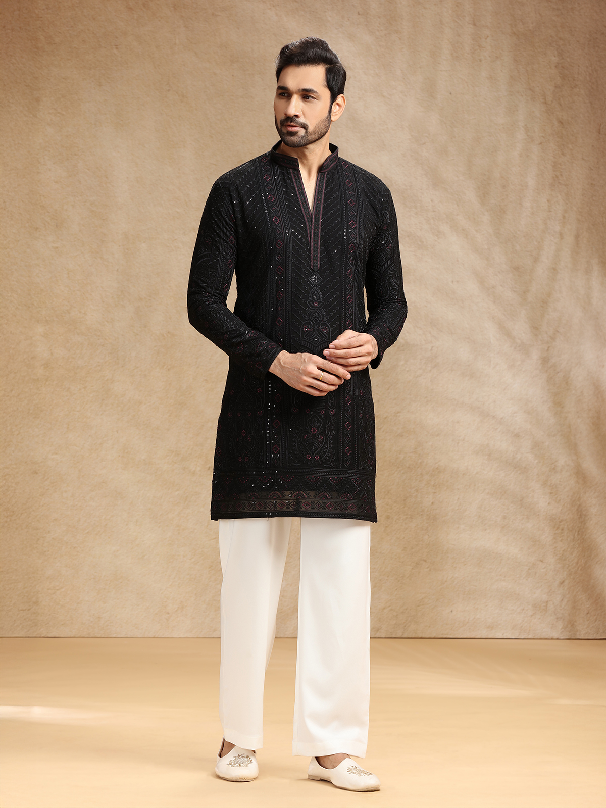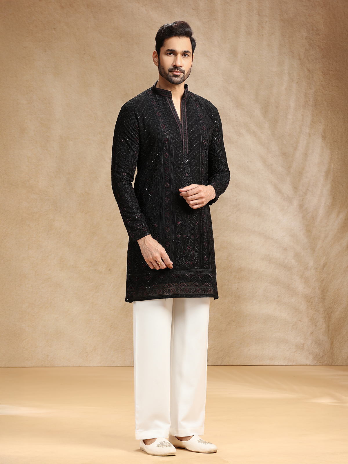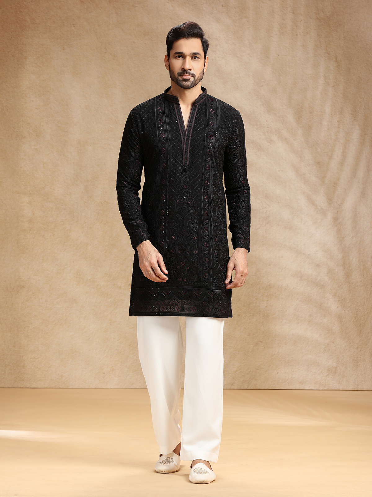 Crafted in luxurious black georgette, this kurta suit sparkles with sequins and embroidery that embody festive grace. The refined stand collar and full sleeves lend regal structure, while tailored pants add a polished finish. The rich black hue deepens its allure, creating an ensemble that exudes timeless elegance, perfect for cultural gatherings and joyous celebrations steeped in tradition.