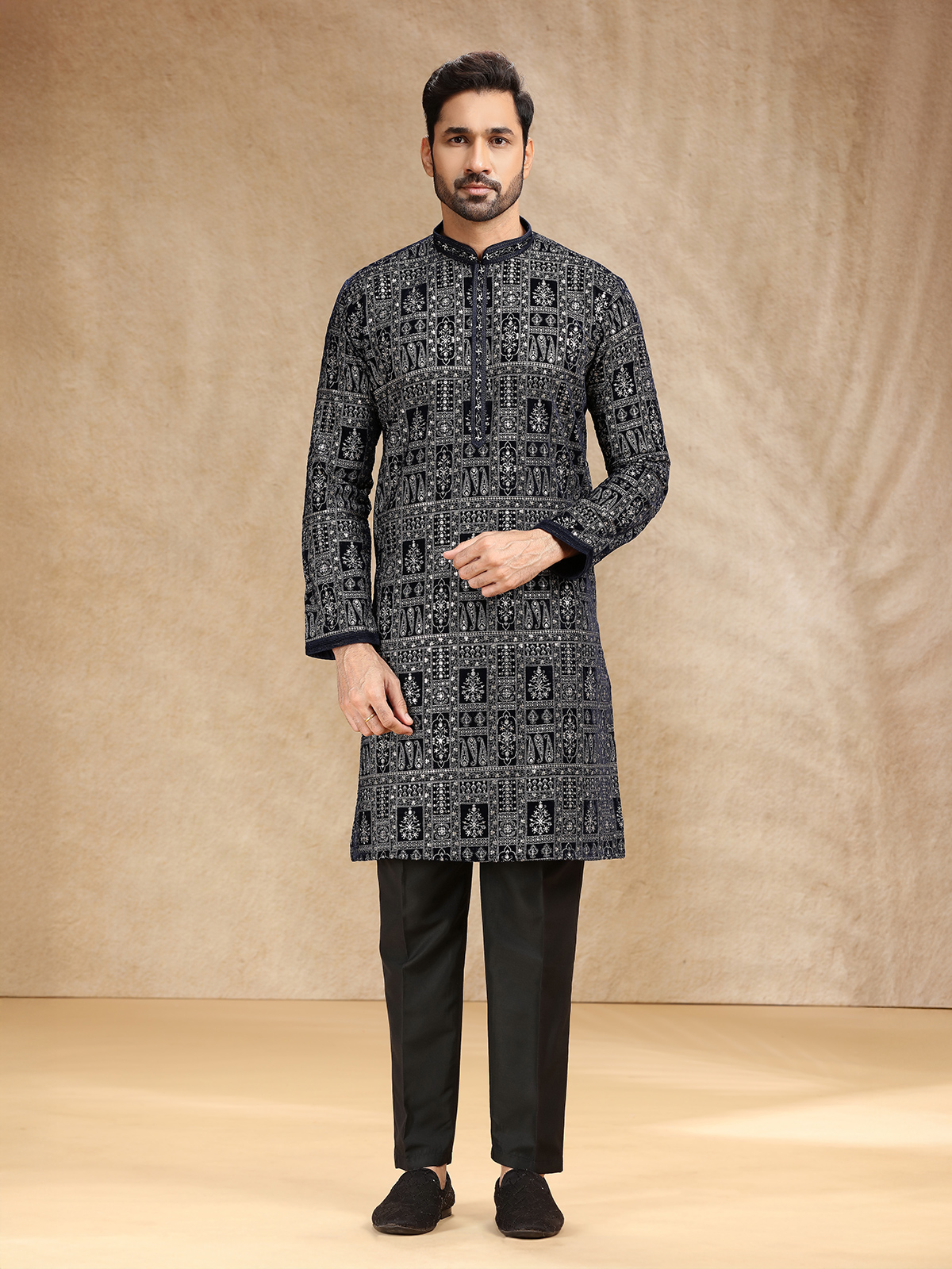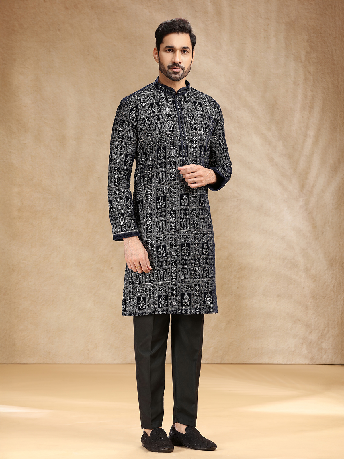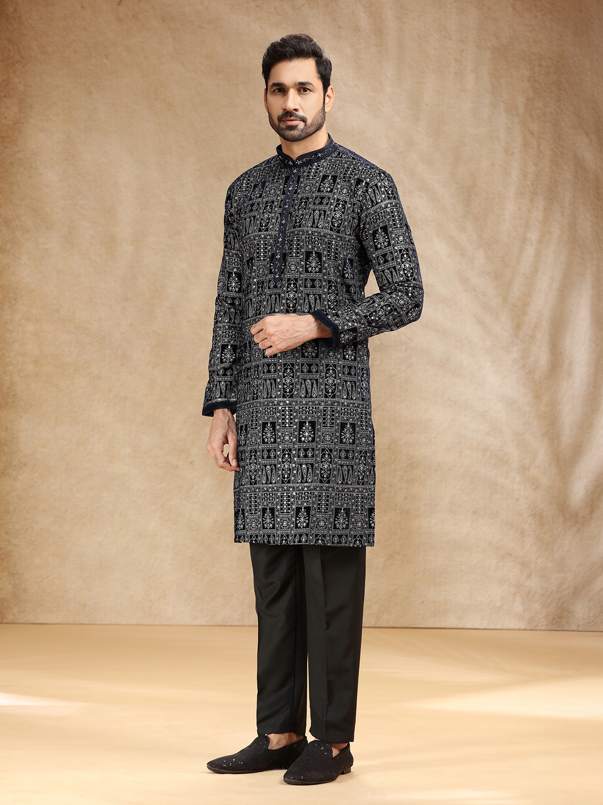 Wrapped in opulent black velvet, this kurta suit glows with resham and sequins that capture the essence of festive luxury. Designed with a stand collar and full sleeves, it pairs with tailored pants for a balanced finish. The deep black hue reflects timeless refinement, making this ensemble a graceful choice for family gatherings and celebratory occasions.