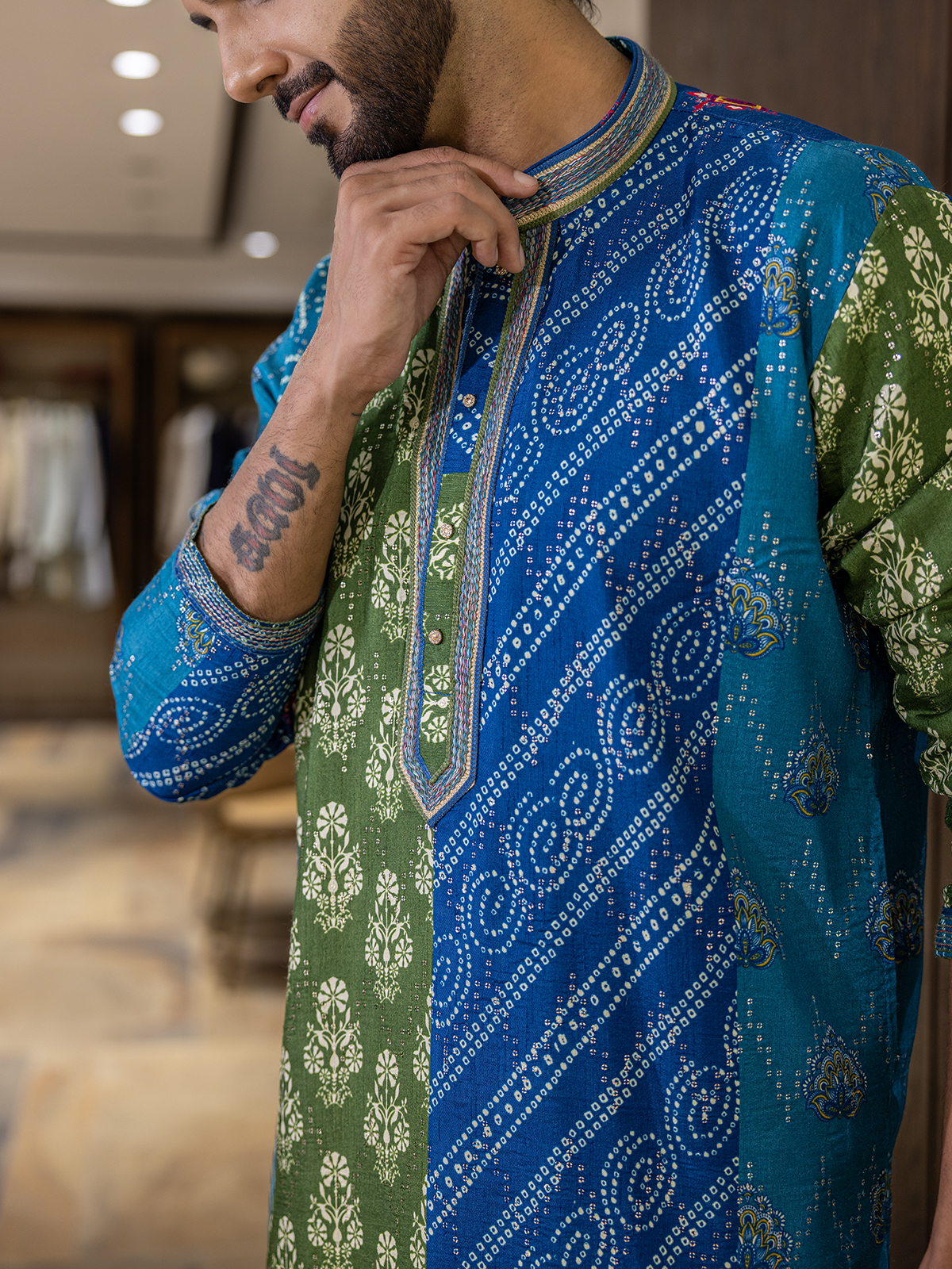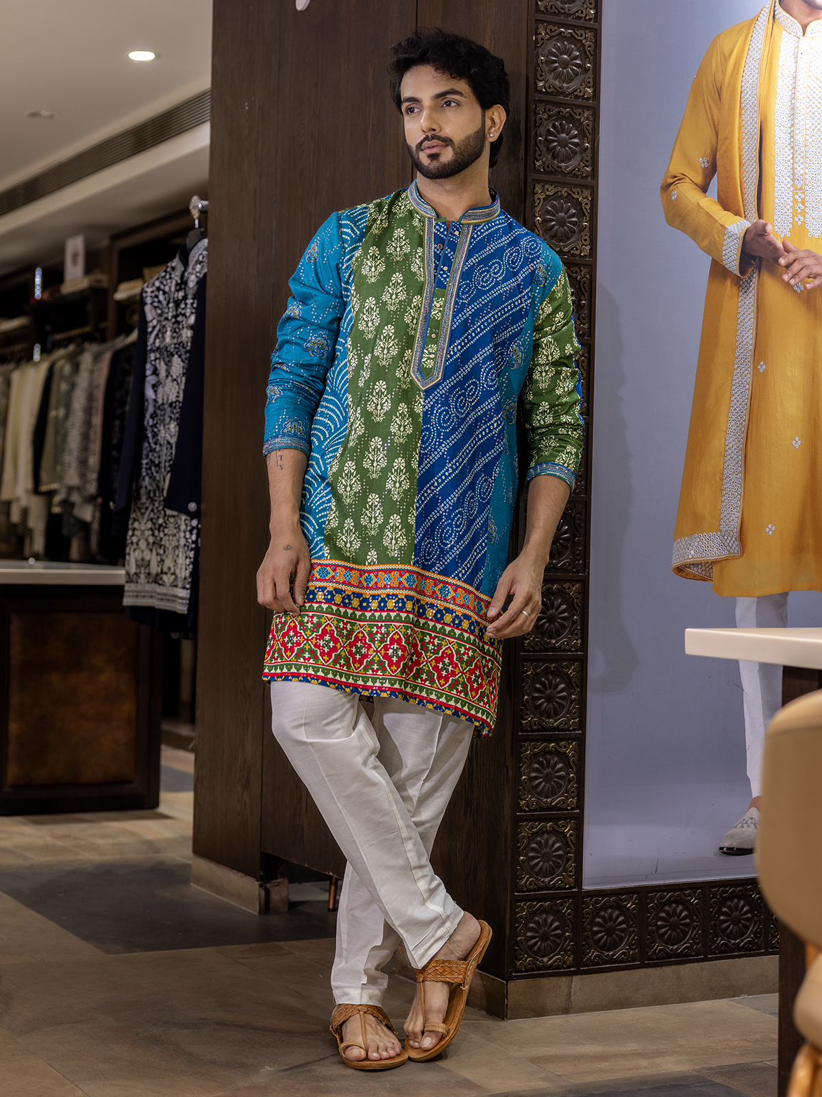 Wrapped in serene blue cotton silk, this printed kurta suit gleams with a delicate interplay of thread and sequins. The mandarin collar and full sleeves define its tailored charm. Matched with pants, a refined festive wear blending shimmer and sophistication.