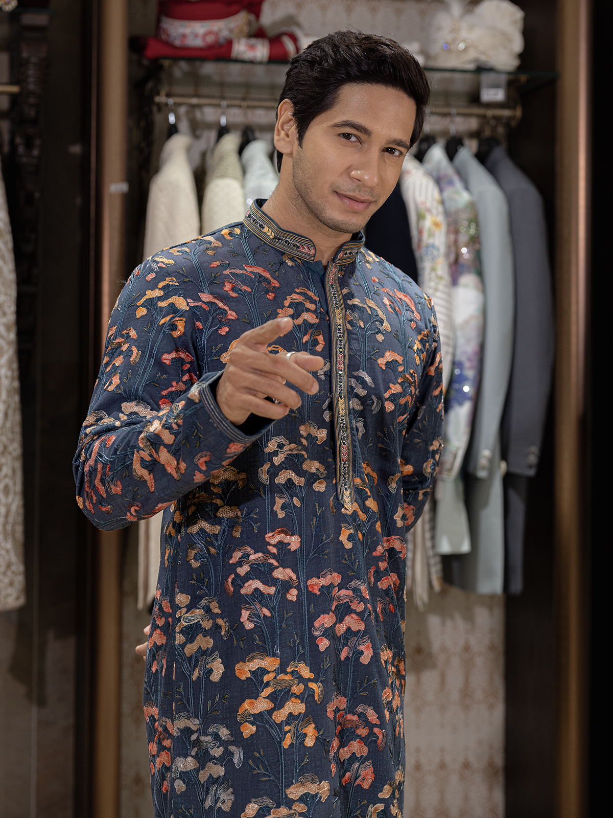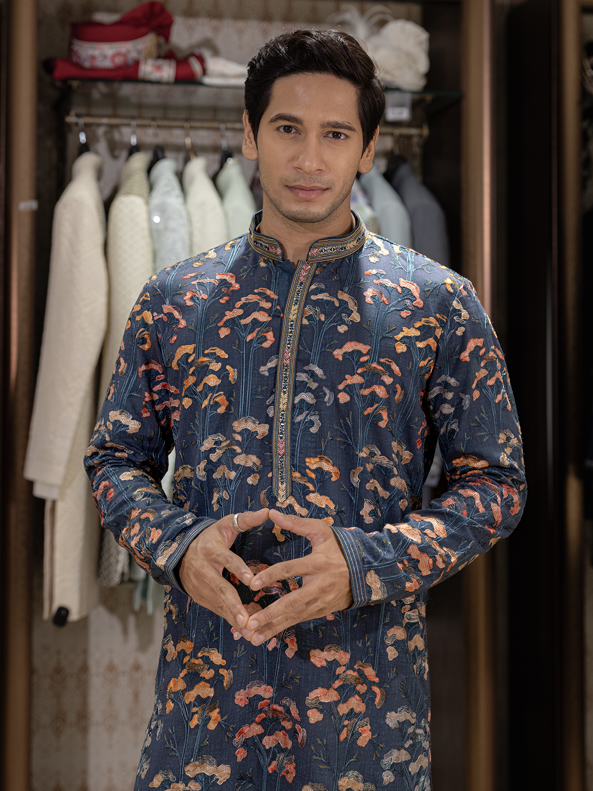 Serenity in blue, this cotton silk kurta suit comes with pant, full sleeves, and mandarin collar. The look is completed with thread work, adding subtle festive detailing that blends tradition with understated elegance.