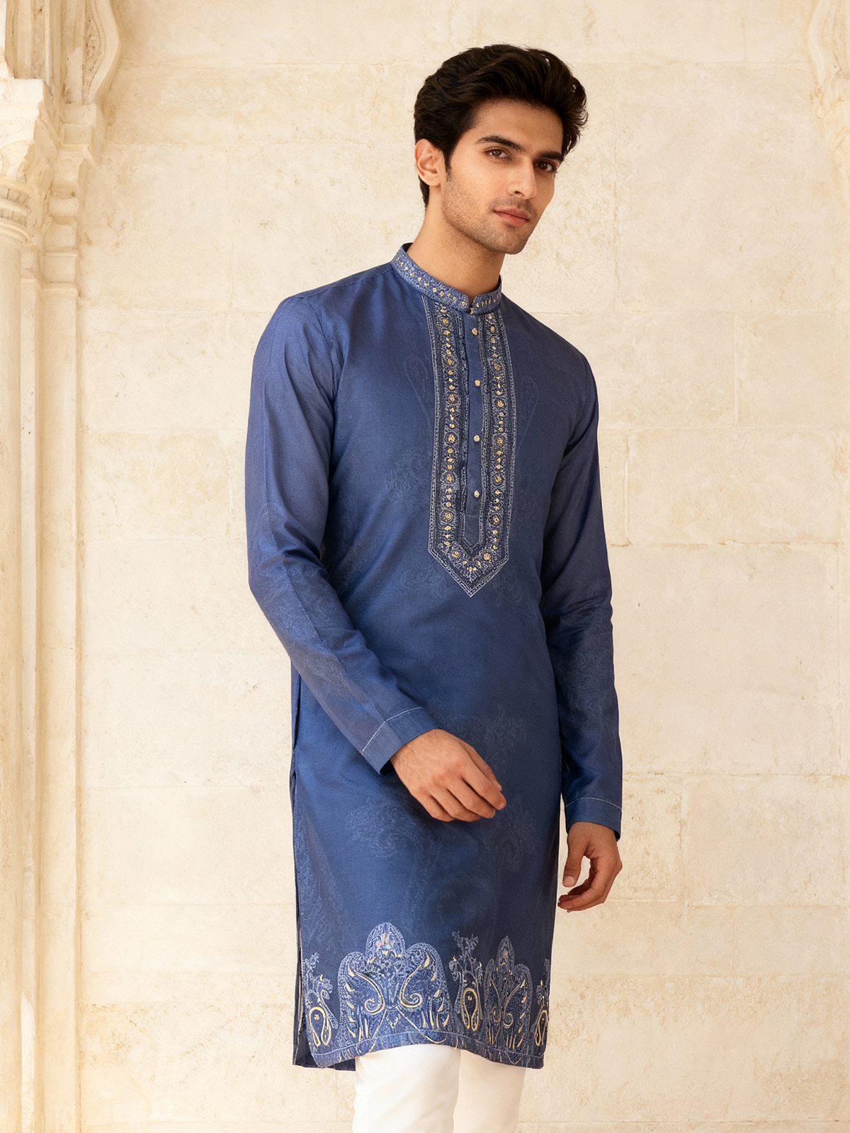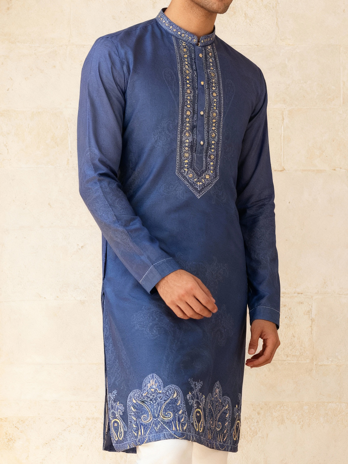 Classic yet contemporary, this blue cotton silk kurta features daman prints for timeless appeal. Styled with a Chinese collar and full sleeves, and paired with pants, it’s ideal for festive and family occasions.