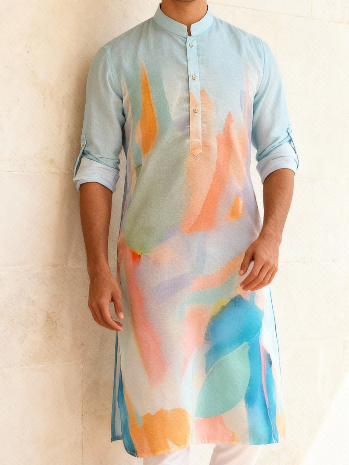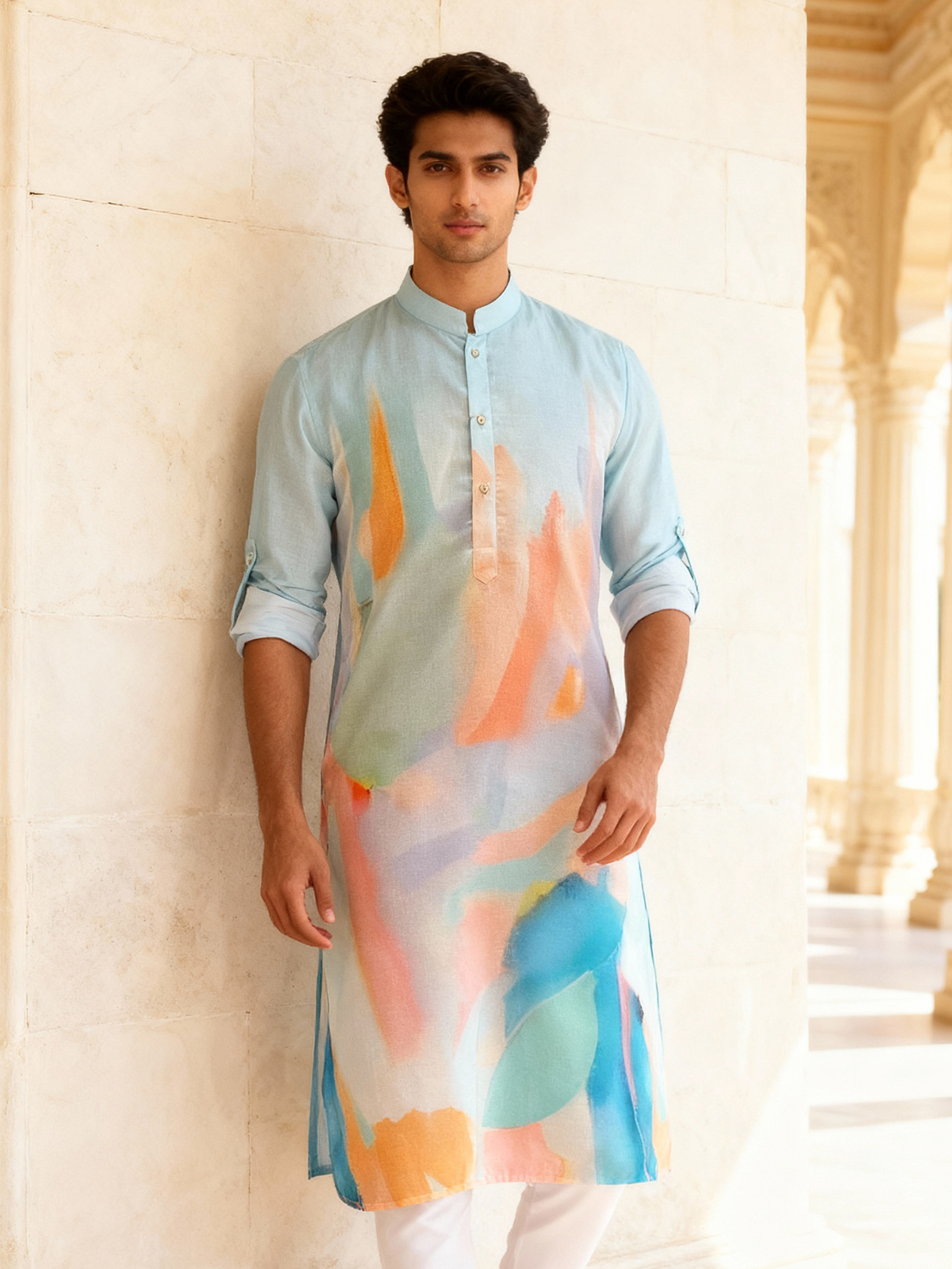 Crafted in premium silk, this blue kurta features stylish digital prints that add modern ethnic charm. Designed with a chinese collar and full sleeves, it delivers a polished festive silhouette. Paired with a crisp white pyjama, it is perfect for weddings and energetic sangeet celebrations.