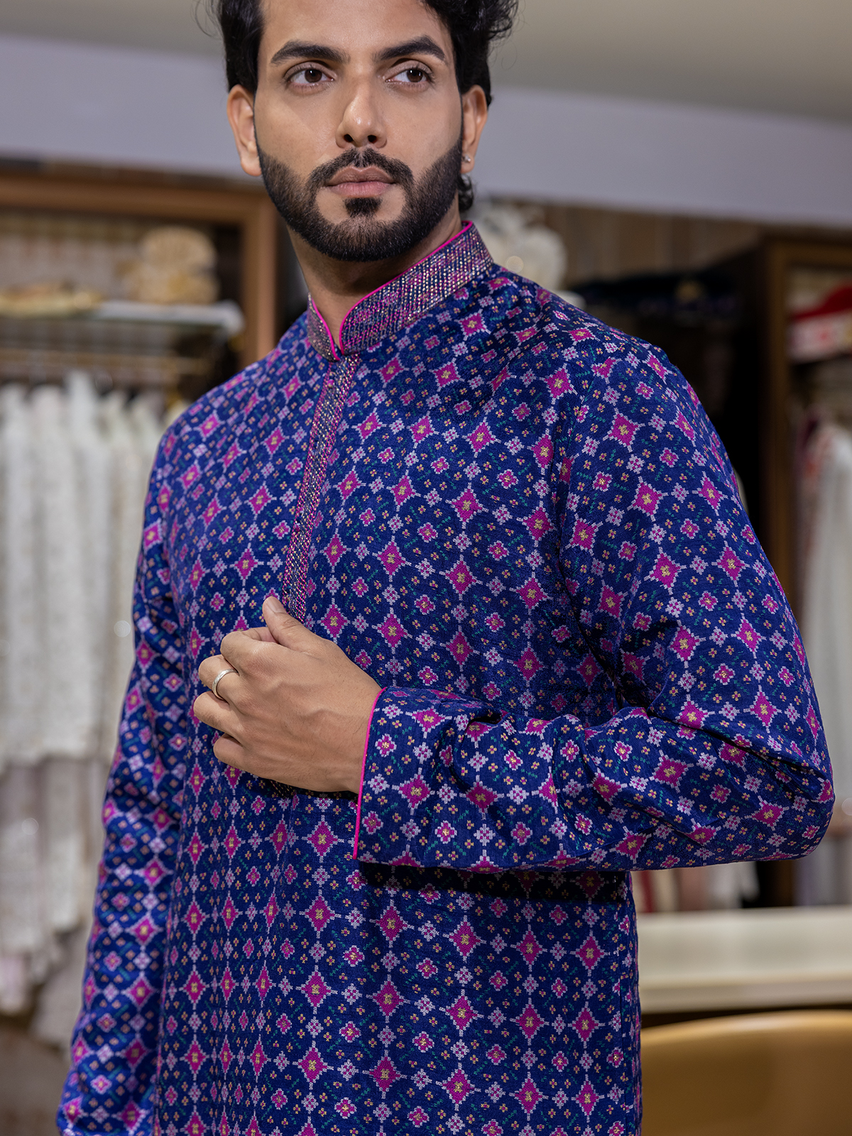 In a soothing shade of blue cotton silk, this printed kurta suit embodies vibrant festivity and refined ease. Delicate thread work graces its surface, complemented by a mandarin collar and full sleeves. Matched with soft pants, it is perfect for celebrations filled with color and charm.