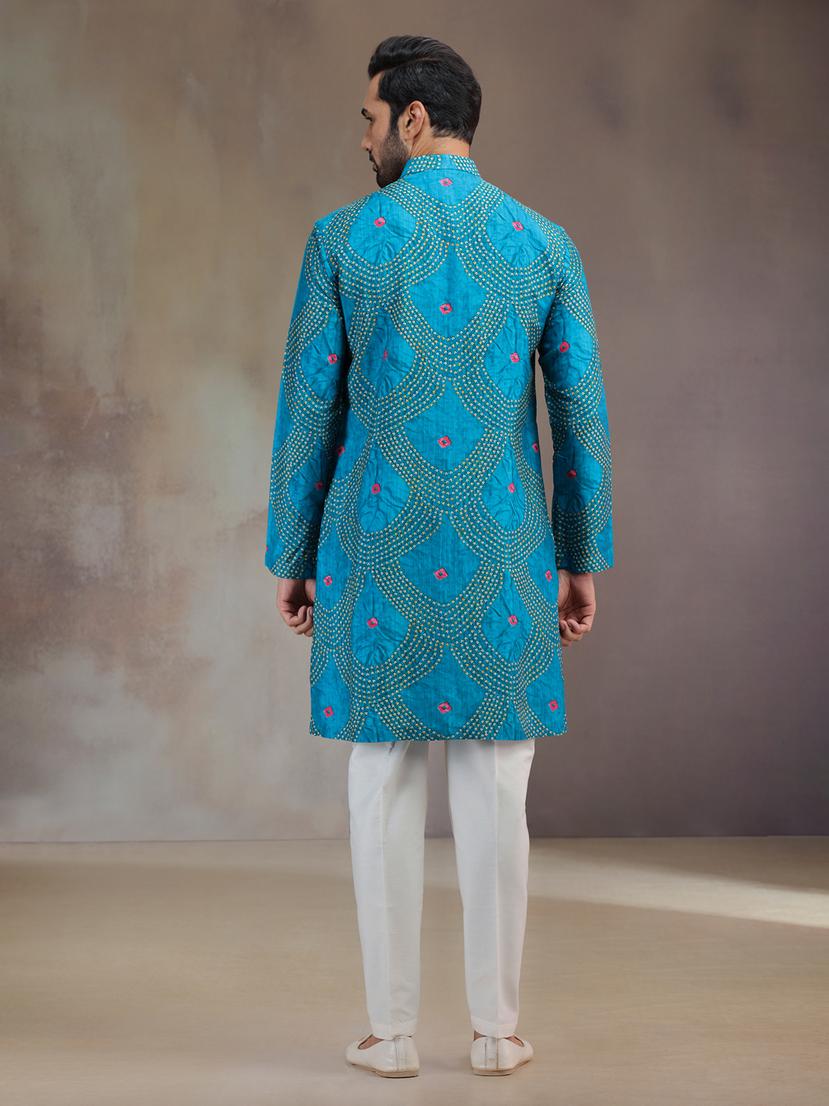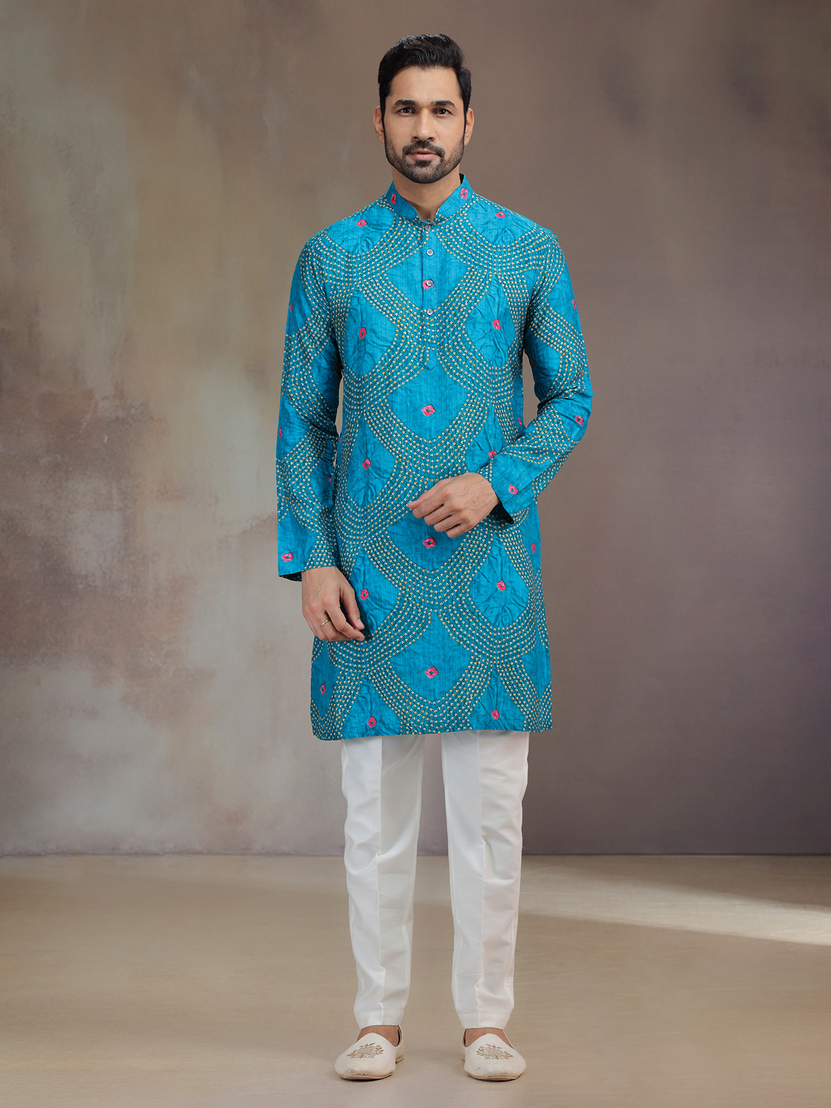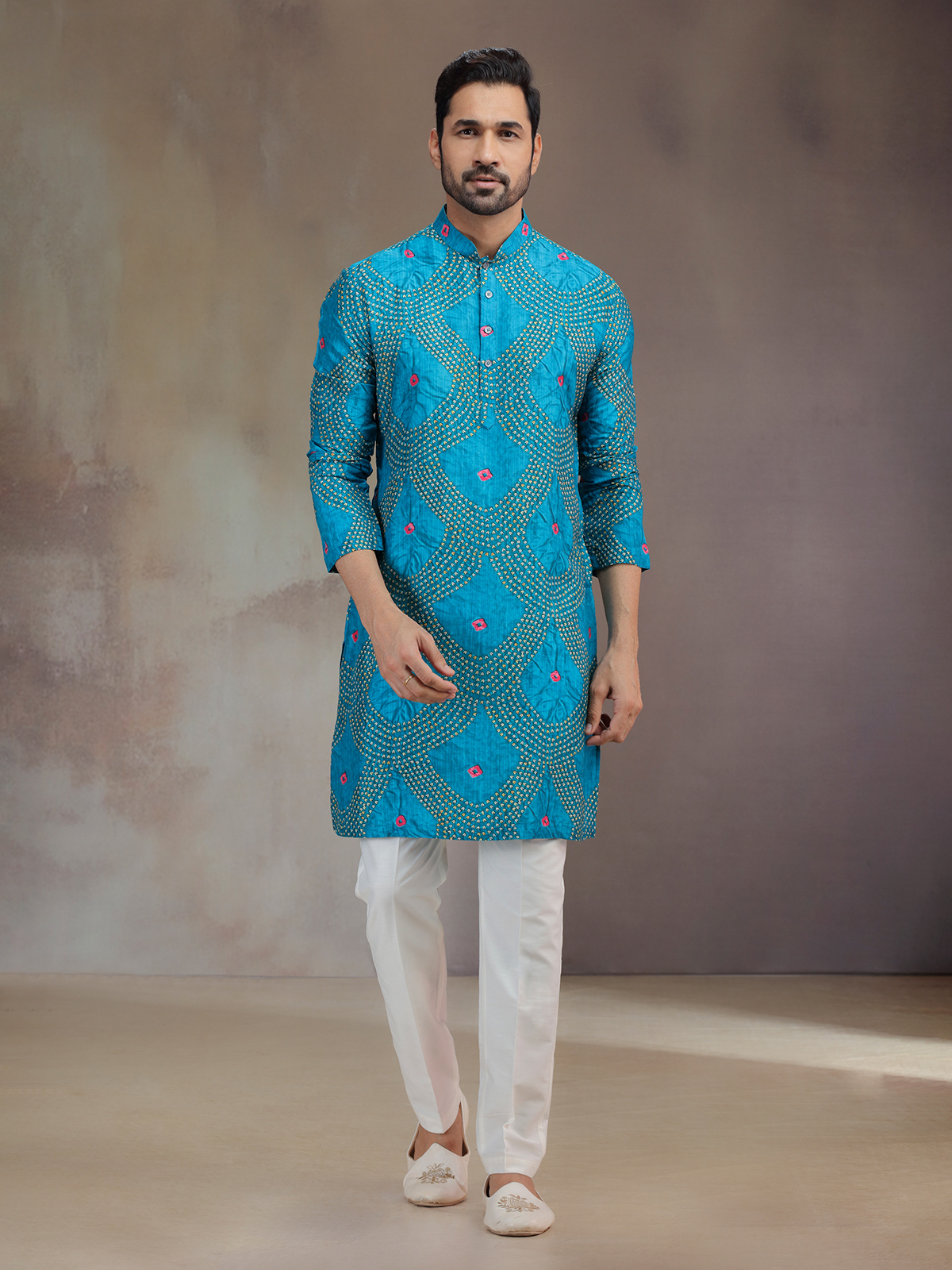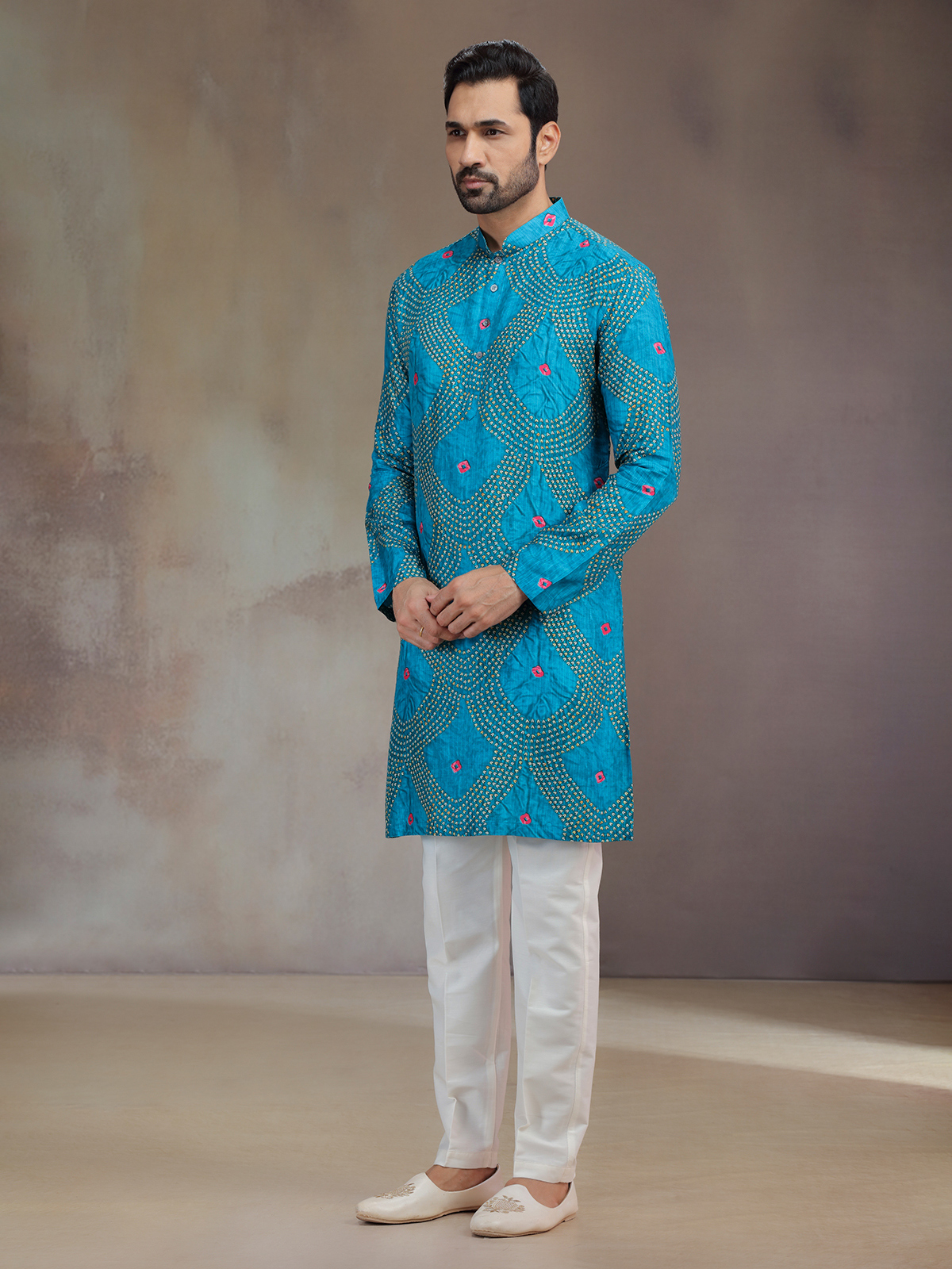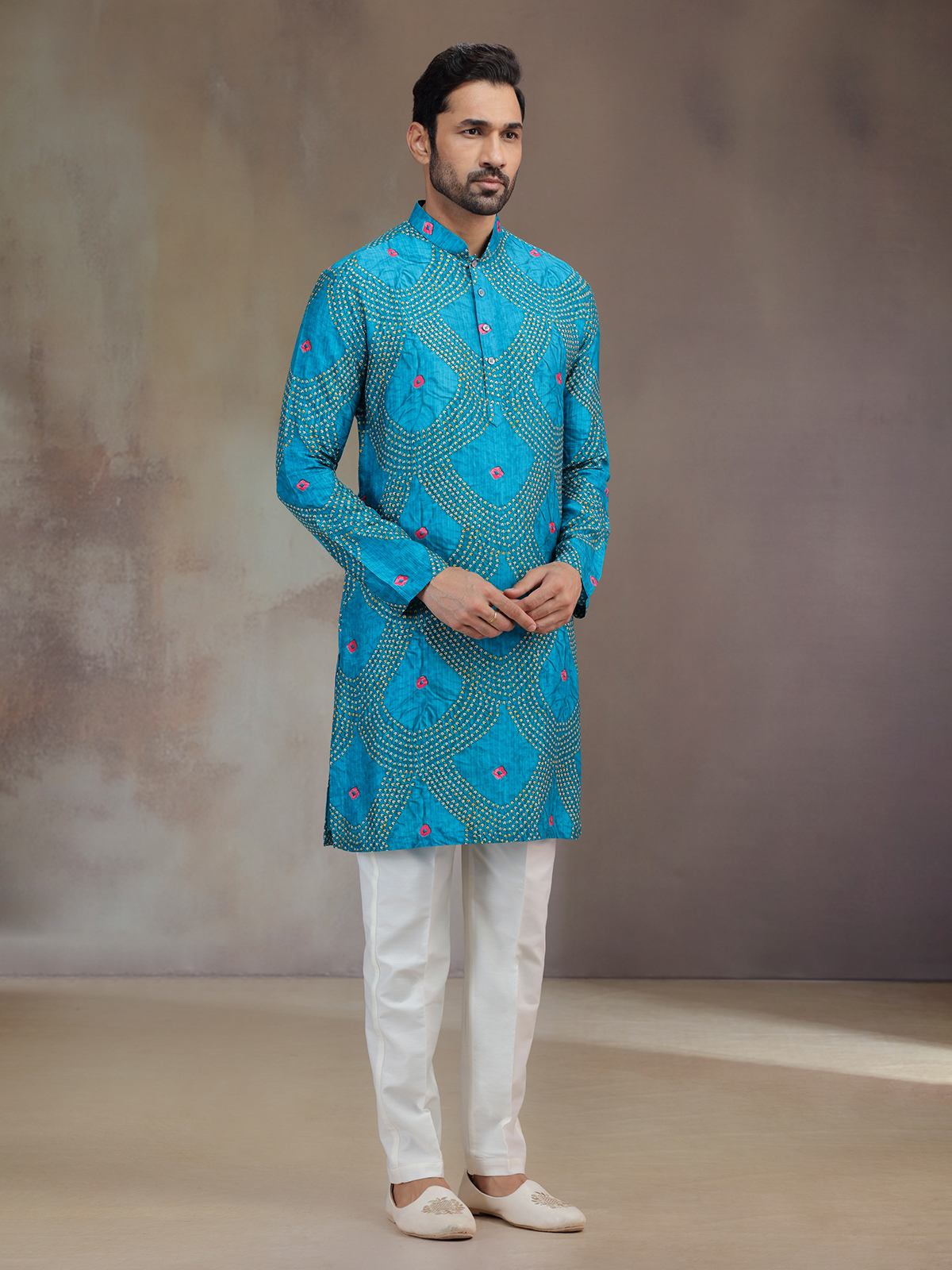 Majestic and graceful, this blue silk printed kurta pajama presents subtle artistry. Its detailed work frames the mandarin collar and full sleeves. Paired with coordinating pants, it becomes an outfit for cultural celebrations that resonate with elegance and tradition.
