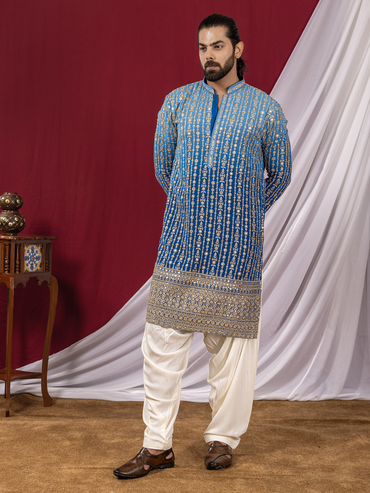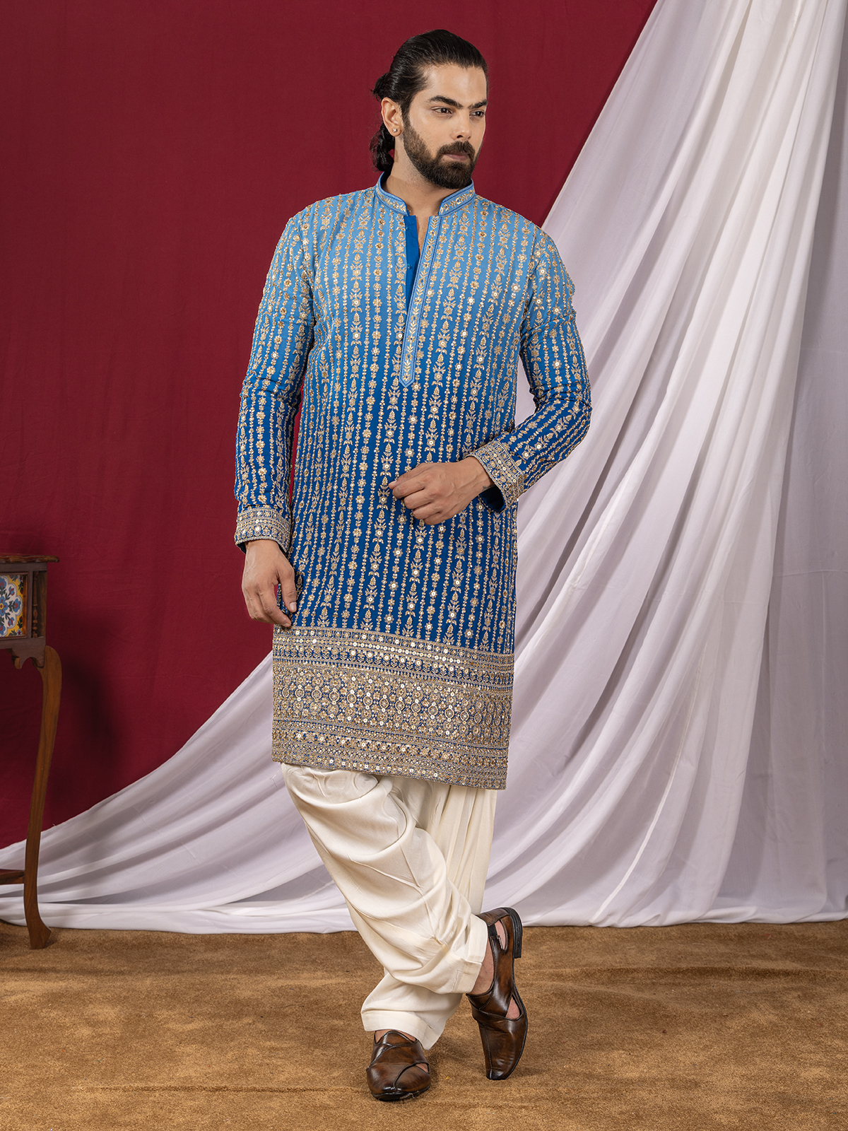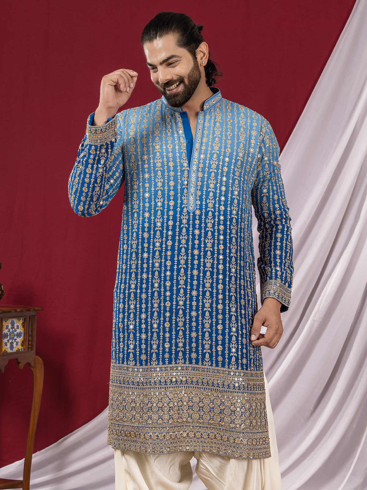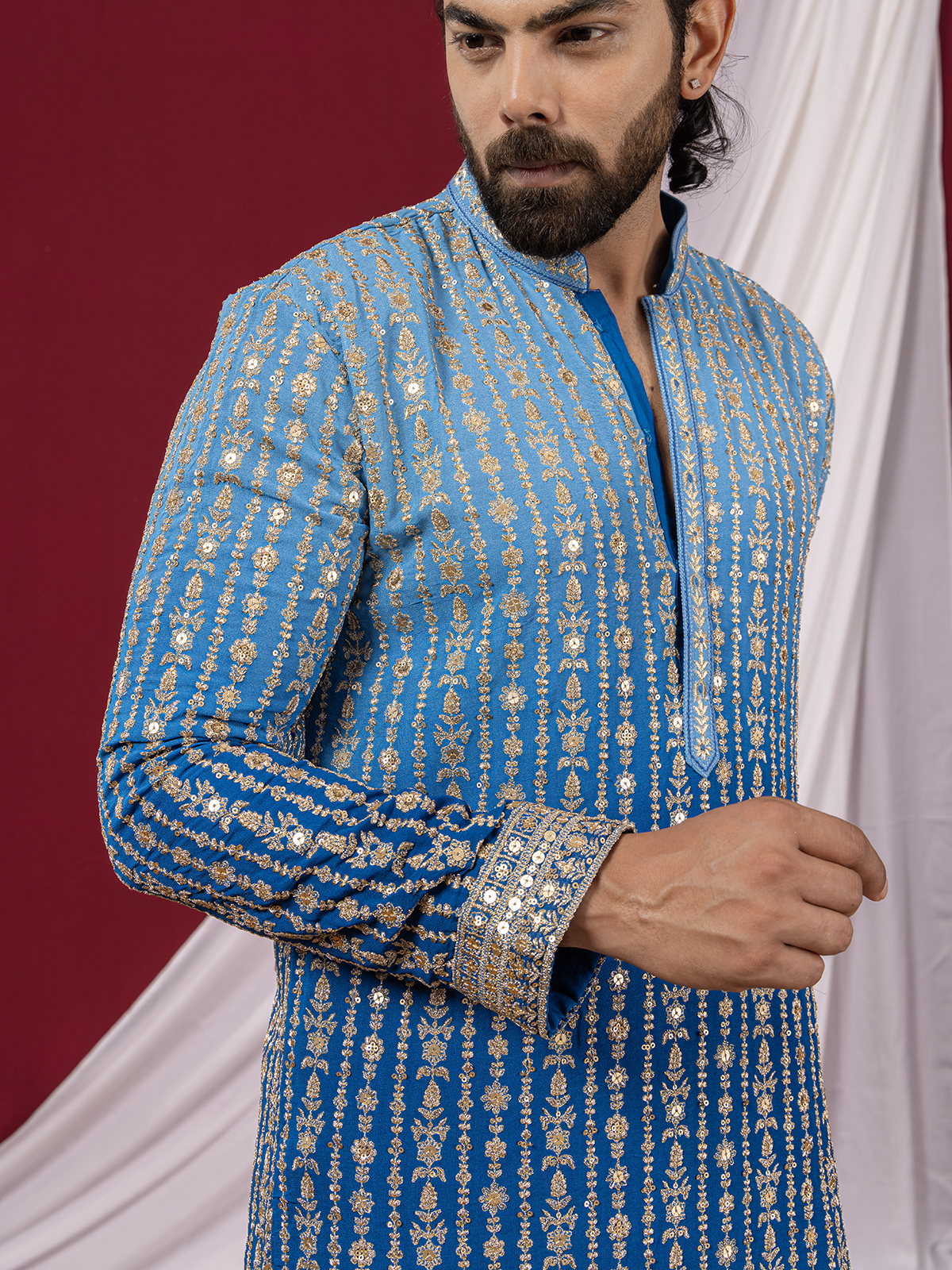 Styled in vibrant blue georgette in shaded pattern, this kurta suit glows with resham and sequins artistry that catches every festive light. The chinese collar and full sleeves bring a modern regal flair. Teamed with a tonal salwar, it flows with refined celebration.
