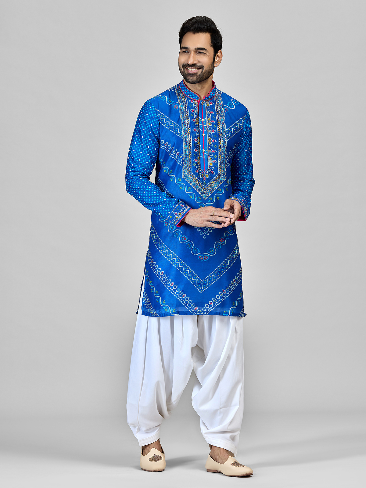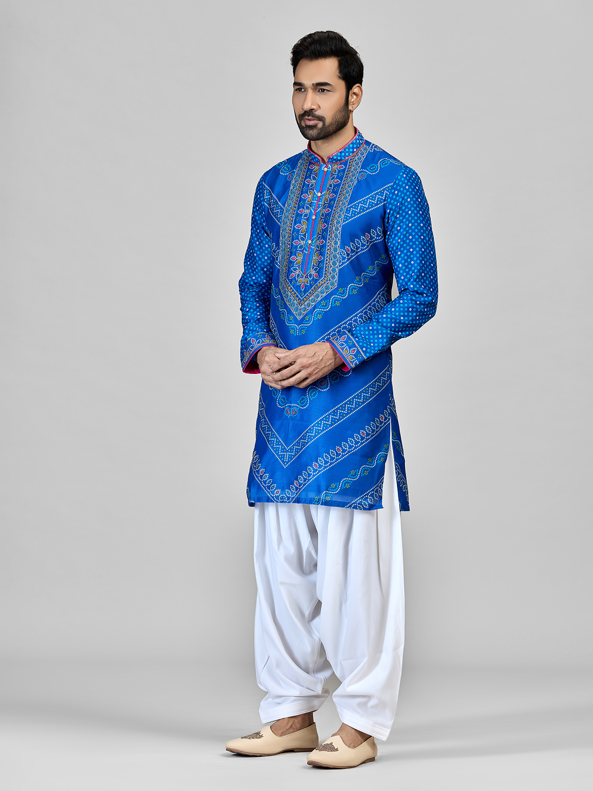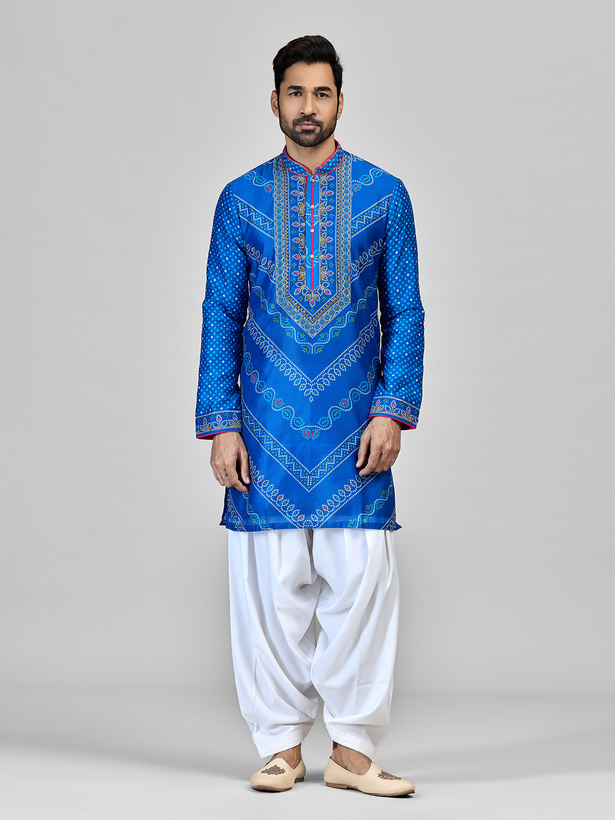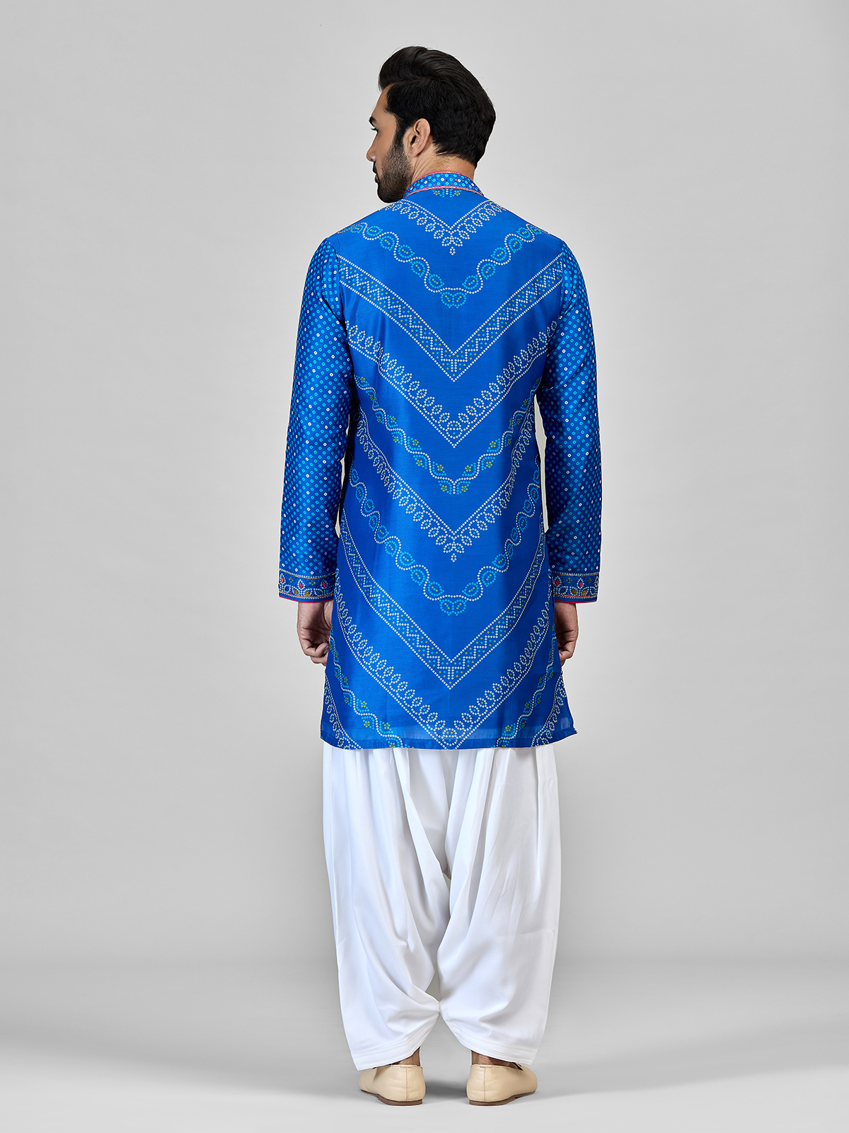 Crafted in blue silk with bandhani patterns, embroidery, aari, and sequin work, this kurta includes a Chinese collar, full sleeves, and salwar bottom. Ideal for weddings, sangeet, and festive occasions with a balanced blend of tradition and style.