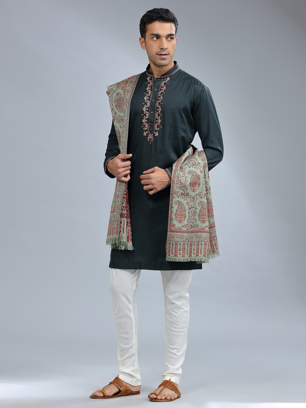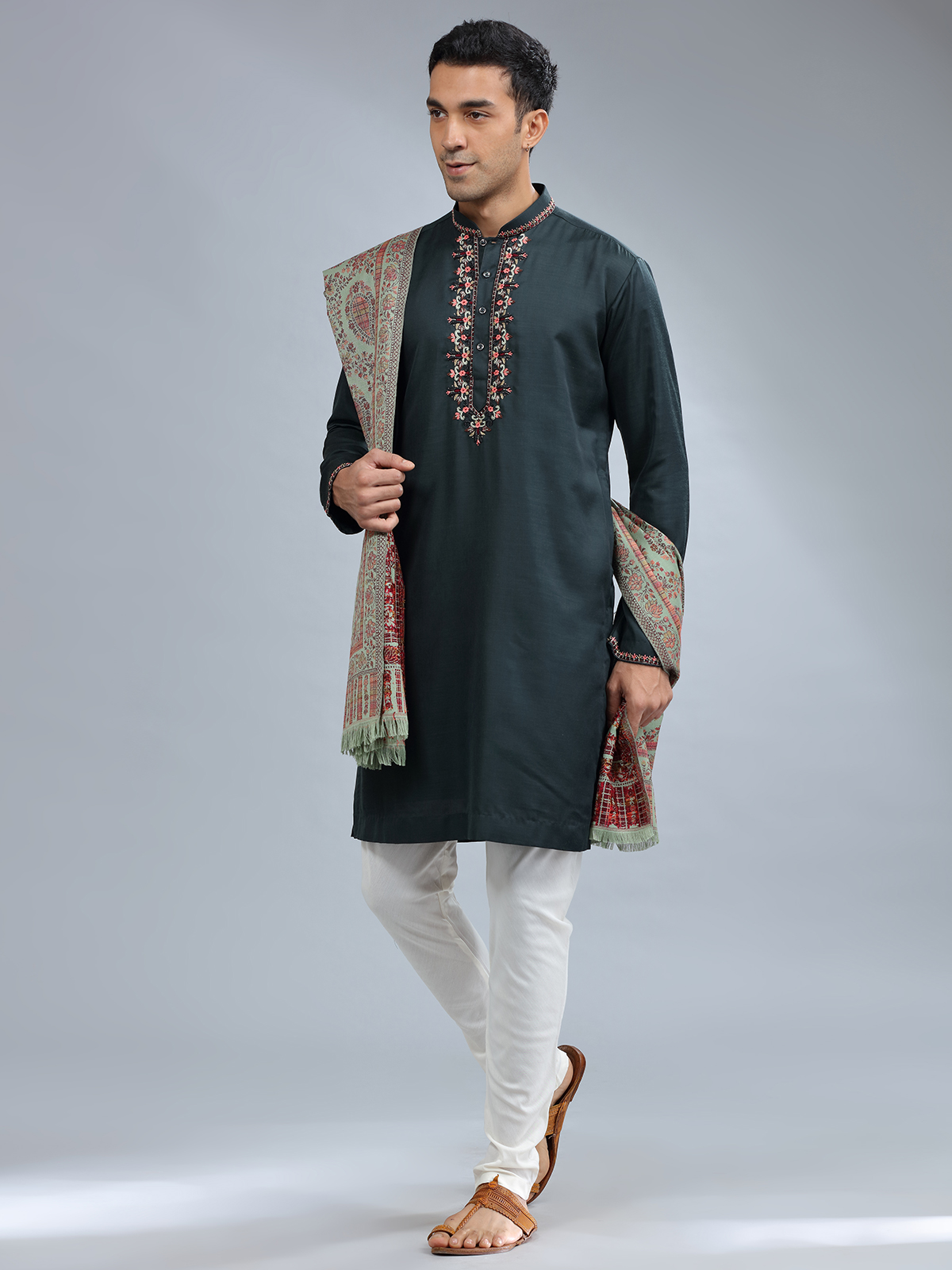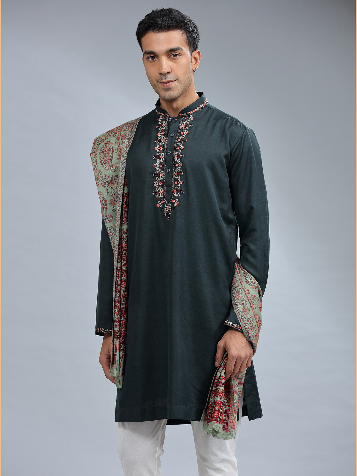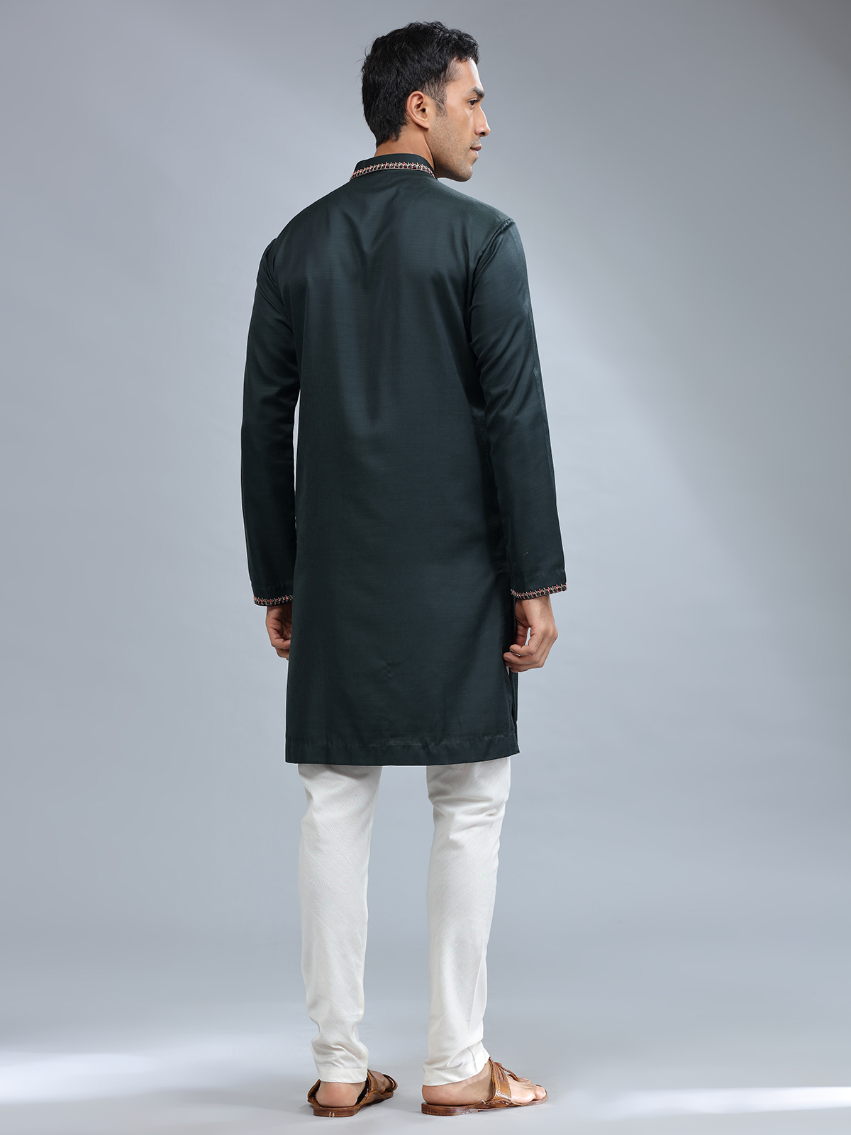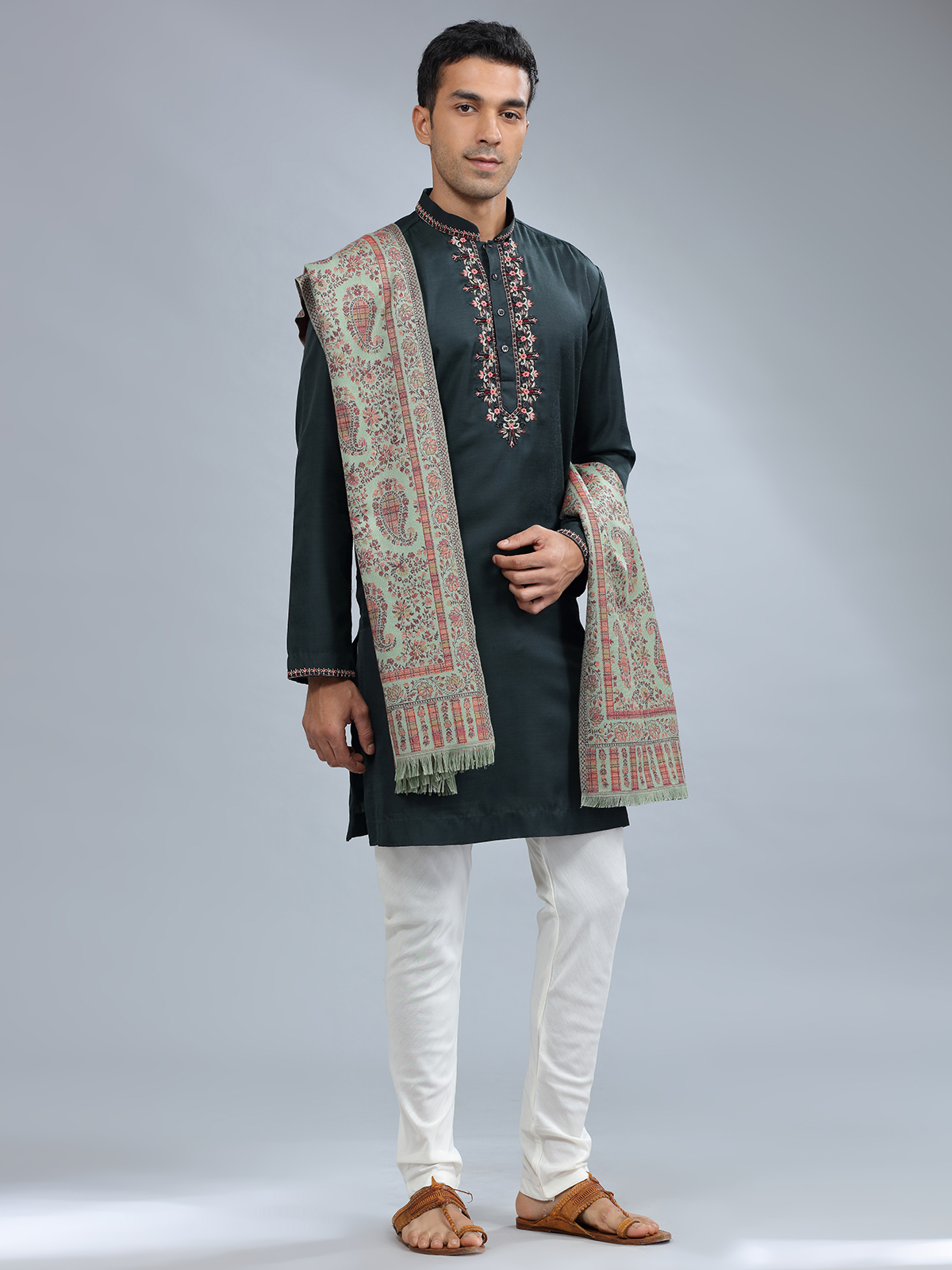 Embrace fashion-forward style with our bottle green cotton silk kurta pajama, featuring detailed embroidery, zardosi, and resham work around the collar. This ensemble exudes timeless charm with its mandarin collar and graceful full sleeves, accompanied by a bottom.