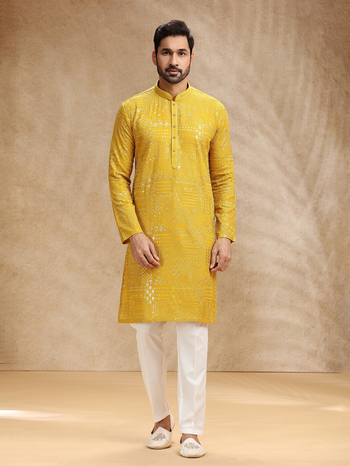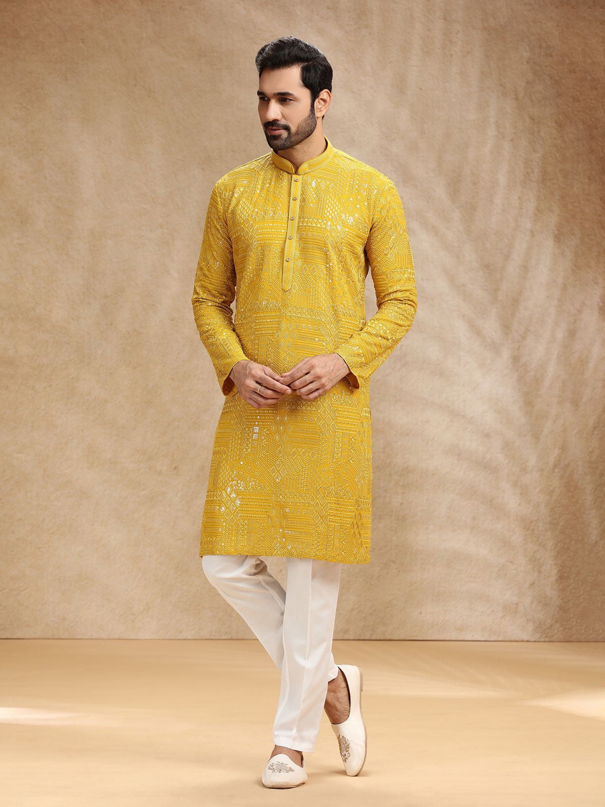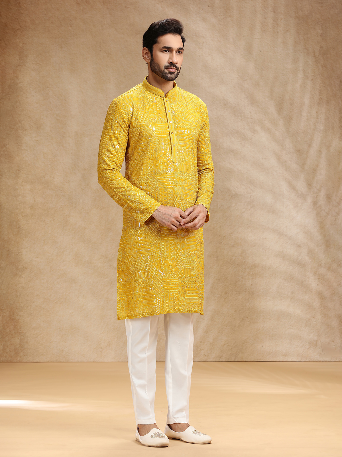 Bright Yellow Georgette Festive Kurta Pajama For Men