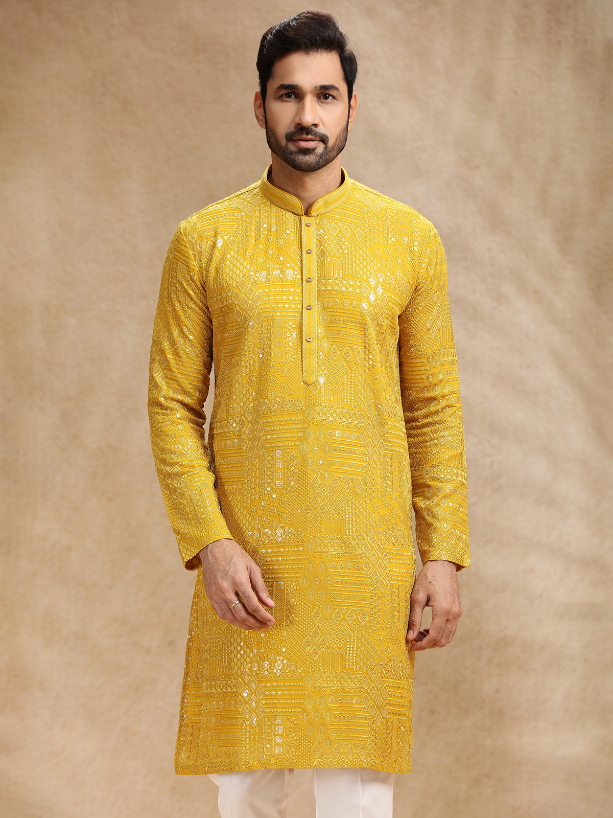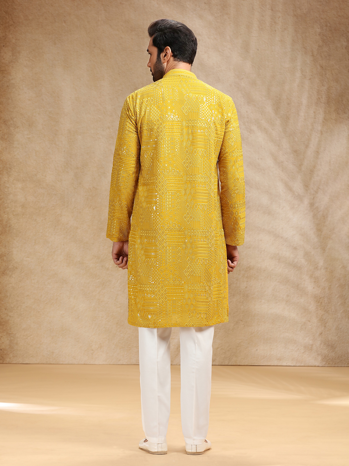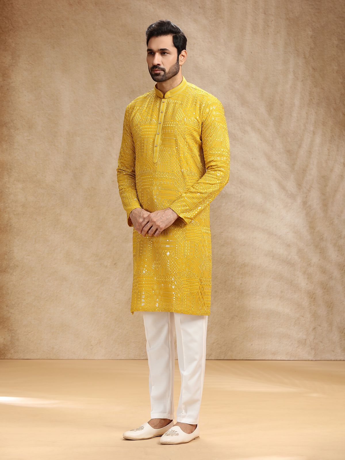 Bright Yellow Georgette Festive Kurta Pajama For Men
