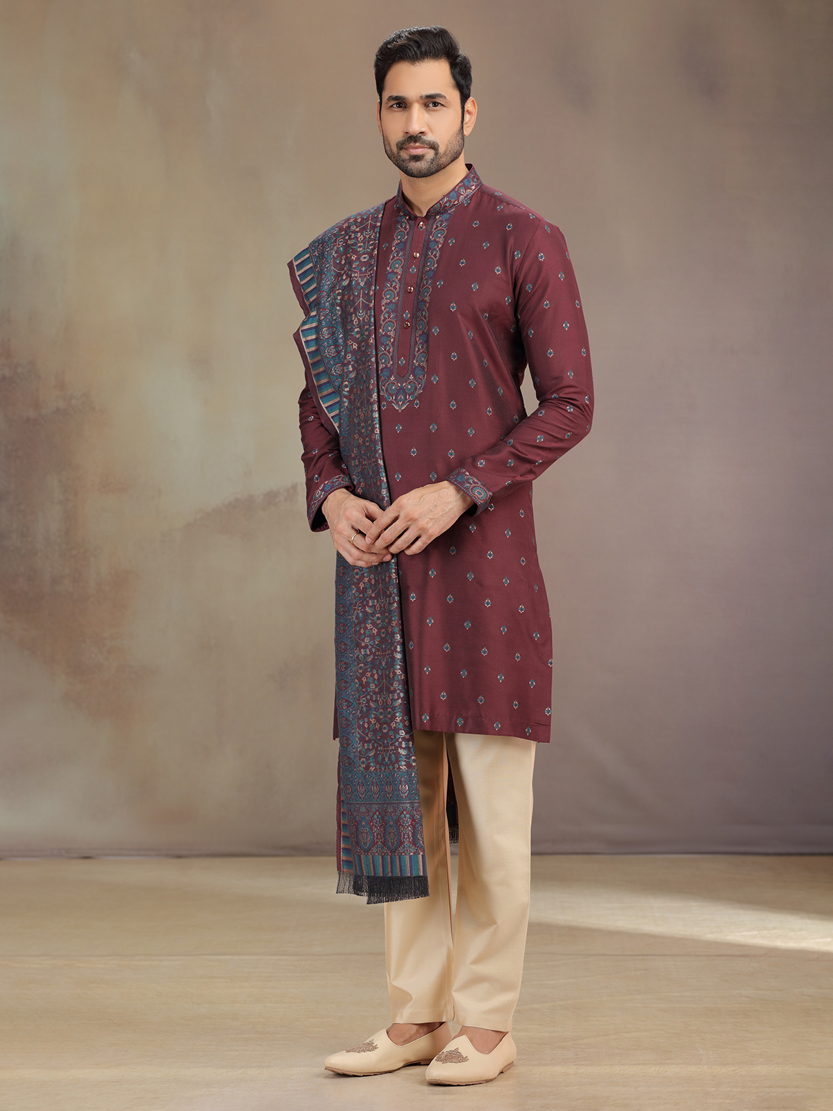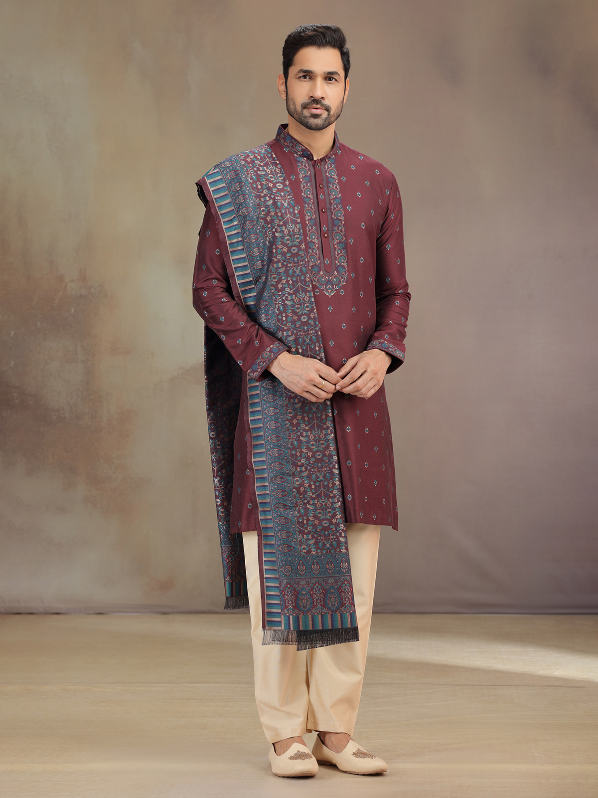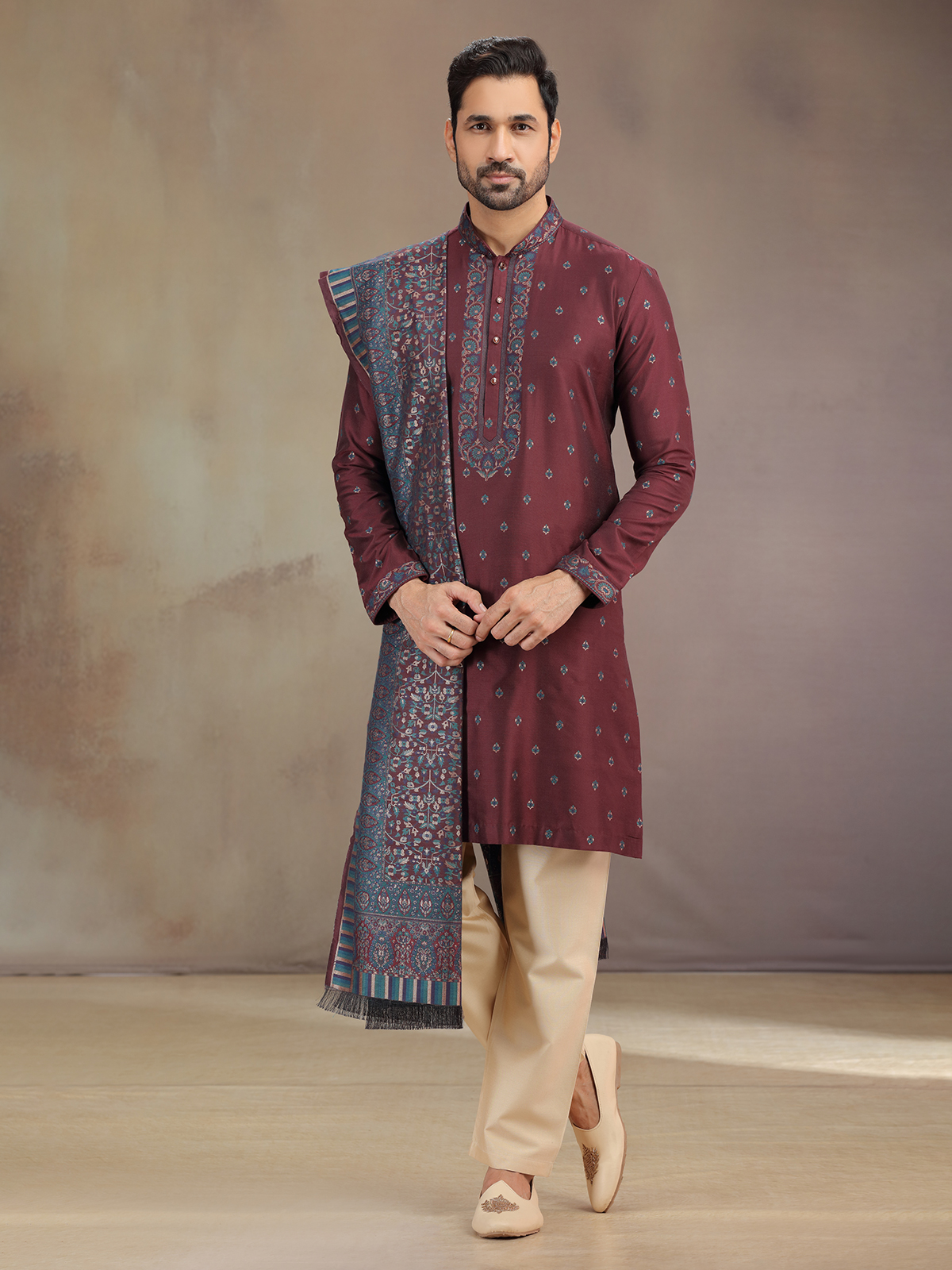 Celebrate festival with this earthy tones of this brown cotton silk kurta pajama. Subtle thread work enhances the full sleeves and mandarin collar, radiating understated elegance. Teamed with pants and a dupatta, it is an ensemble tailored for festive occasions, celebrating simplicity blended with cultural richness in every detail.