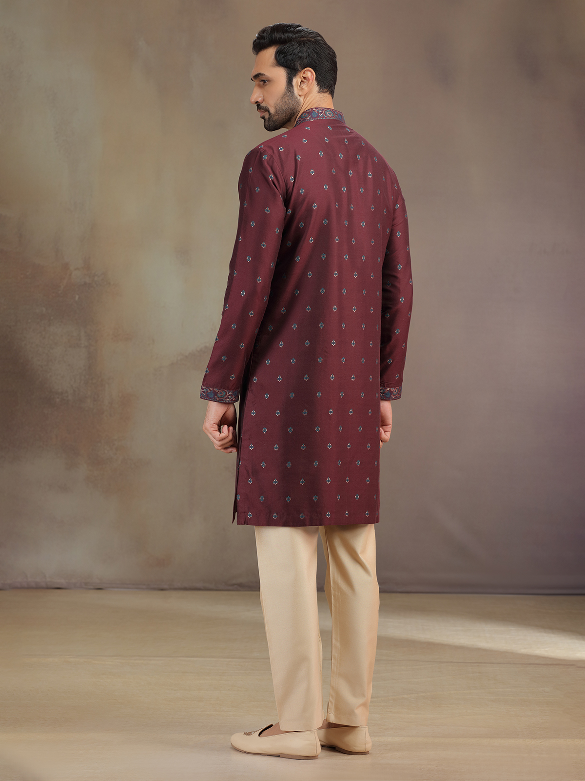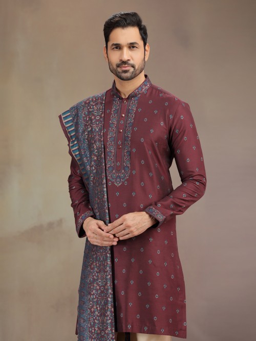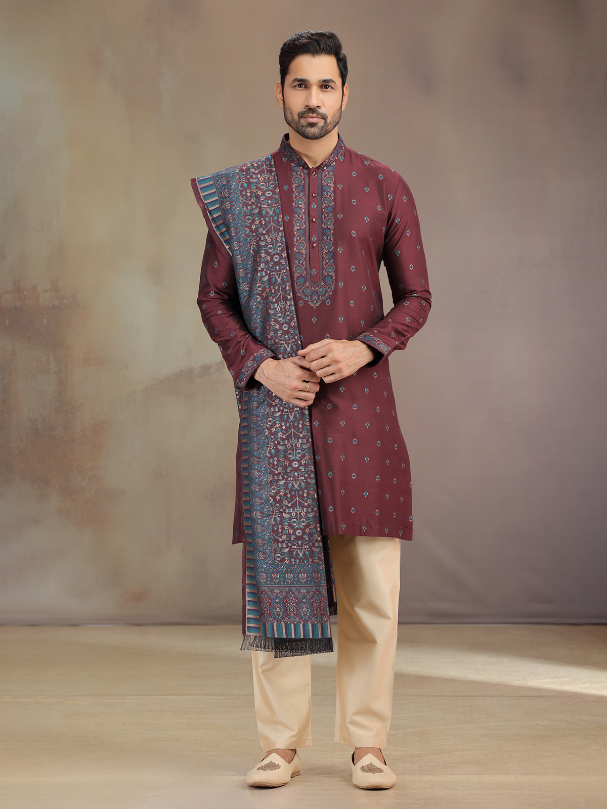 Celebrate festival with this earthy tones of this brown cotton silk kurta pajama. Subtle thread work enhances the full sleeves and mandarin collar, radiating understated elegance. Teamed with pants and a dupatta, it is an ensemble tailored for festive occasions, celebrating simplicity blended with cultural richness in every detail.