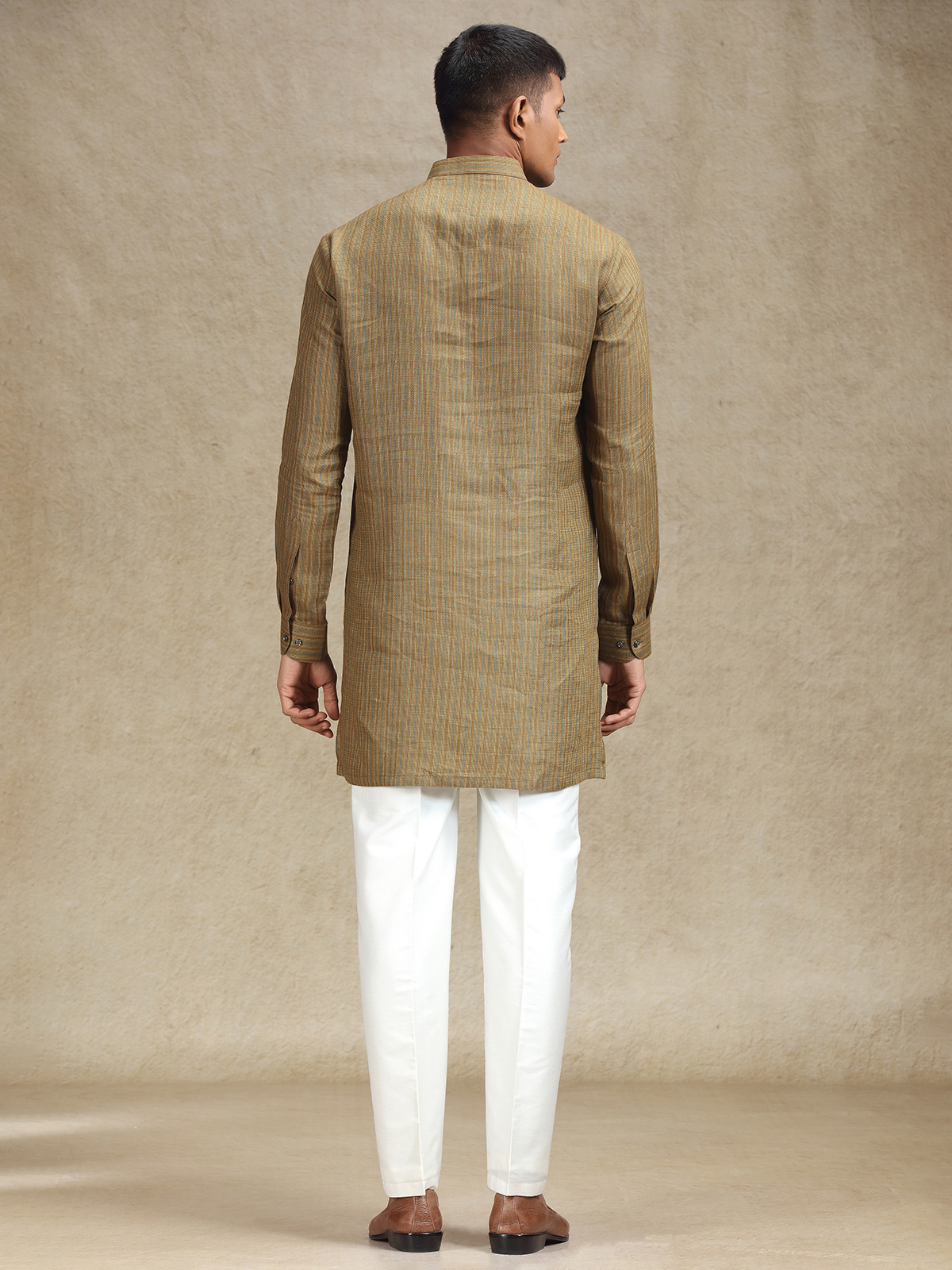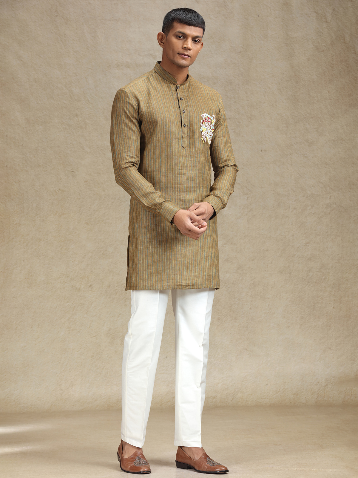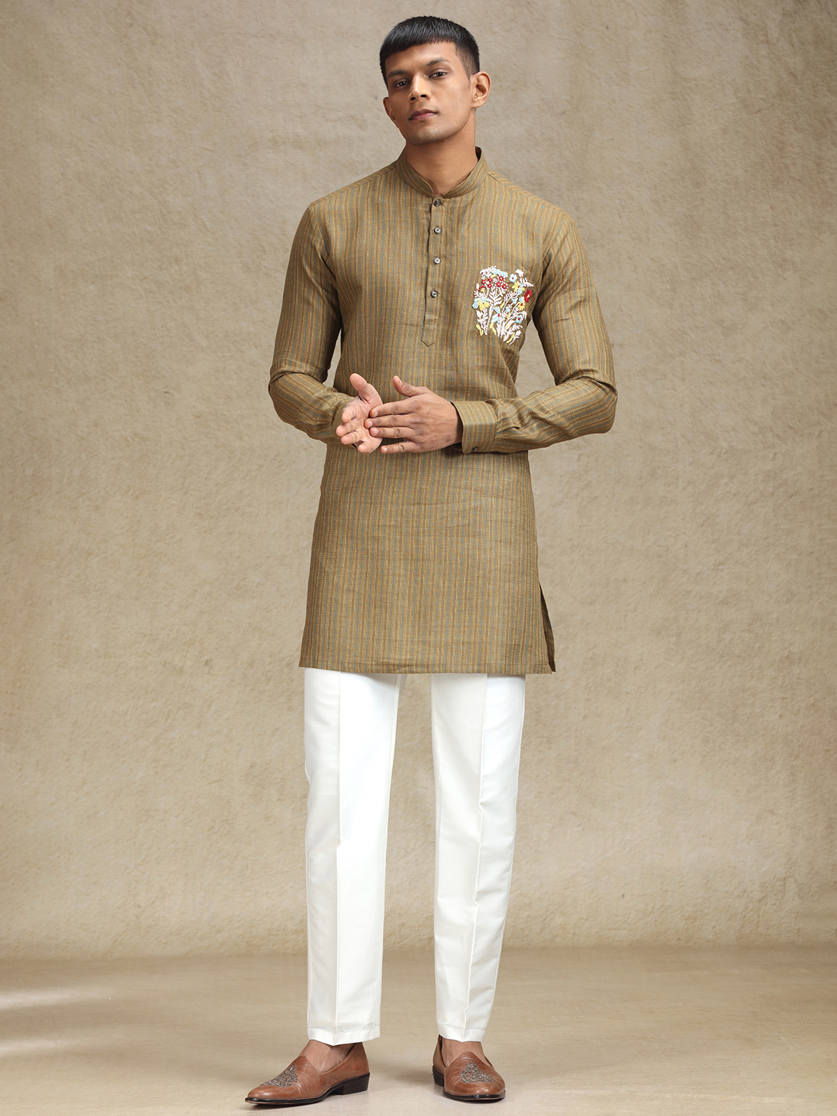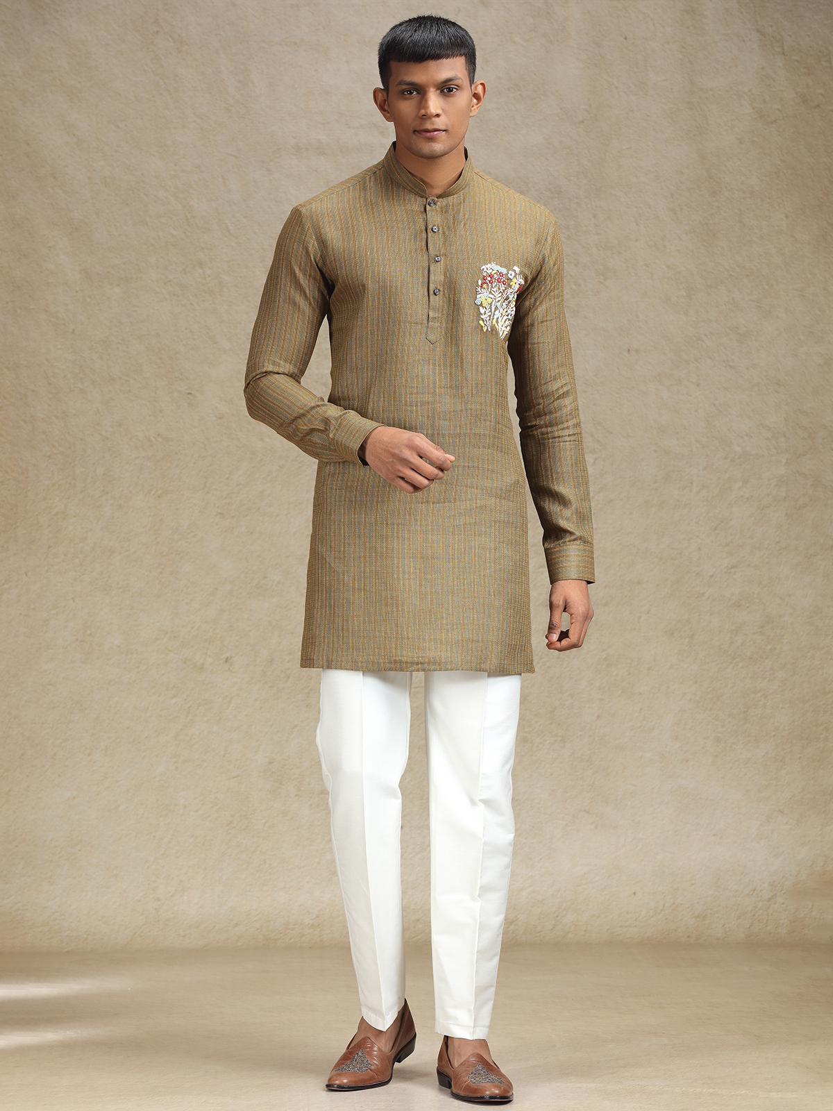 Make an impression in this Chocolate Brown linen kurta pajama set, detailed with exquisite thread embroidery focused on the chest area for an elevated look. The luxurious fabric and expert handiwork make this ideal for weddings, festivals, and cultural functions. Comes complete with matching pants.