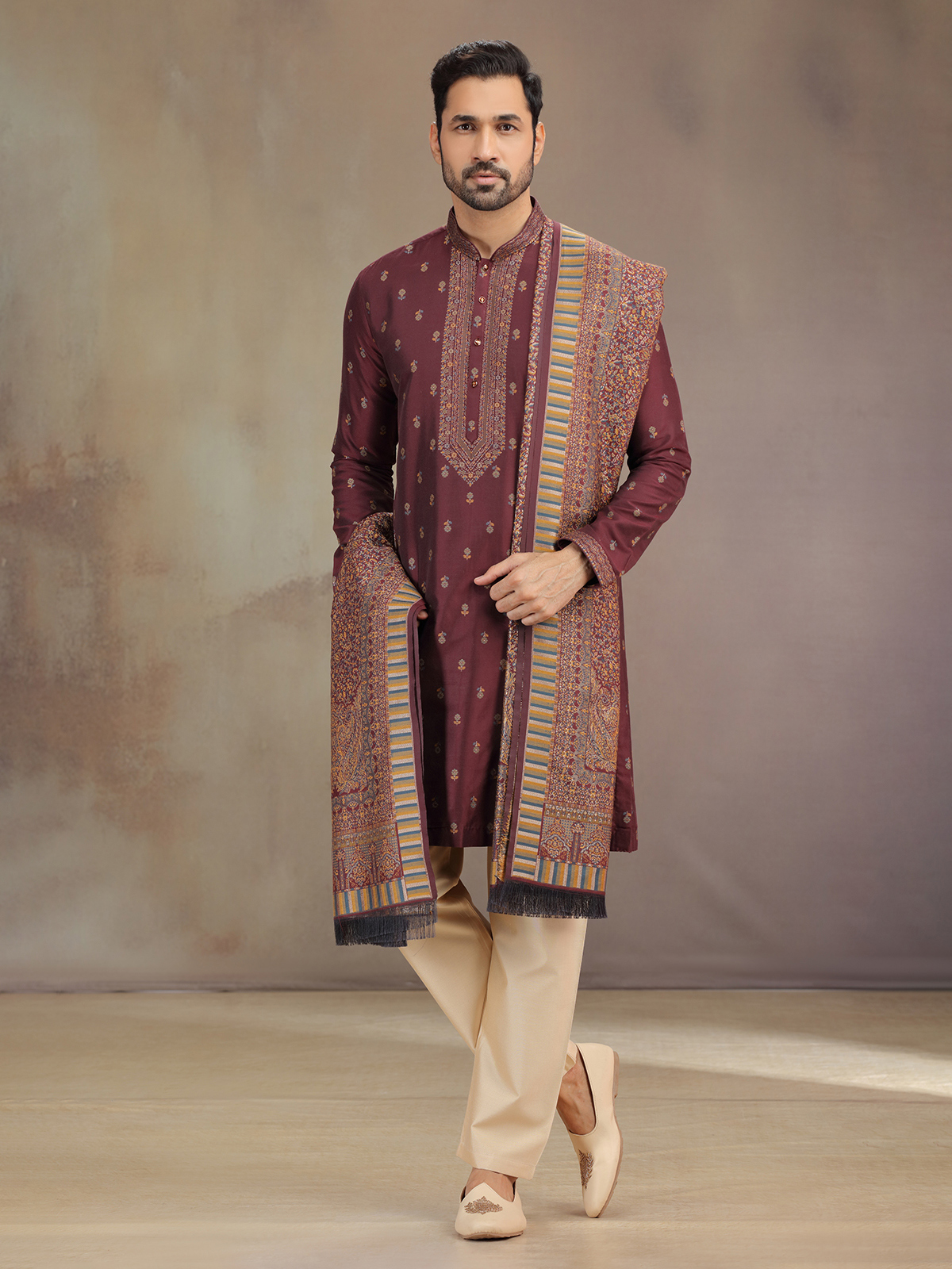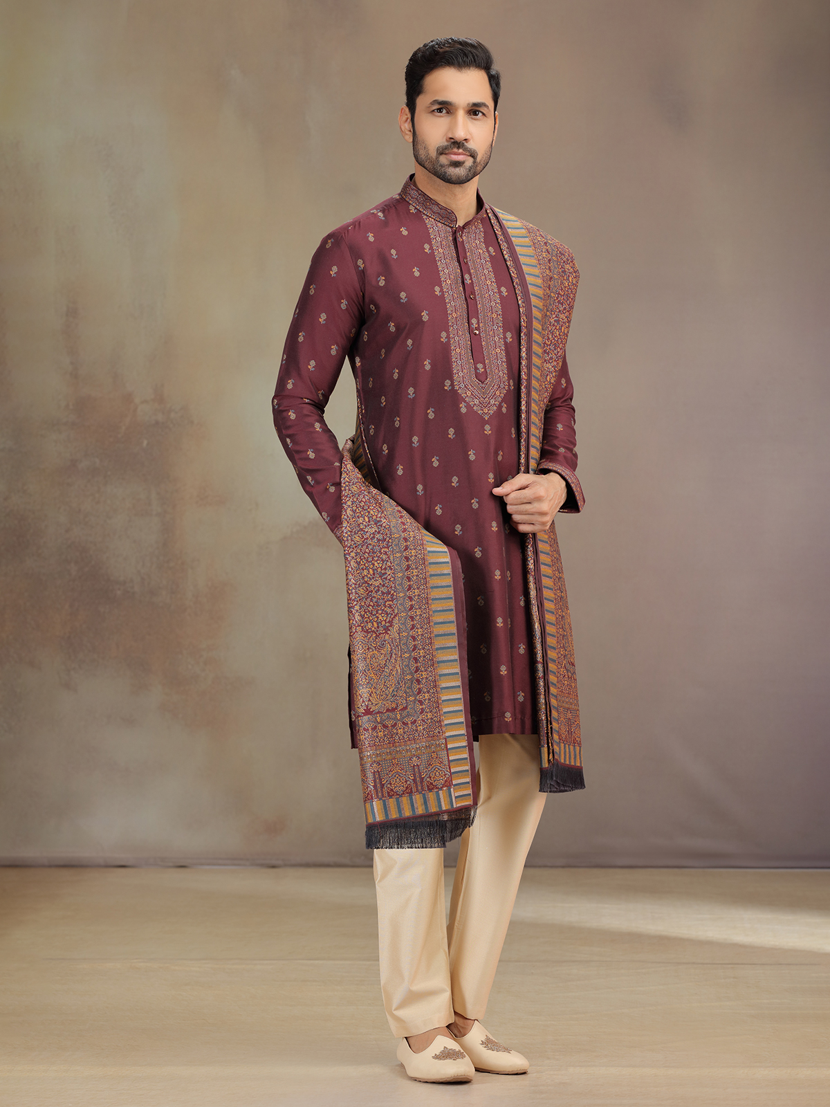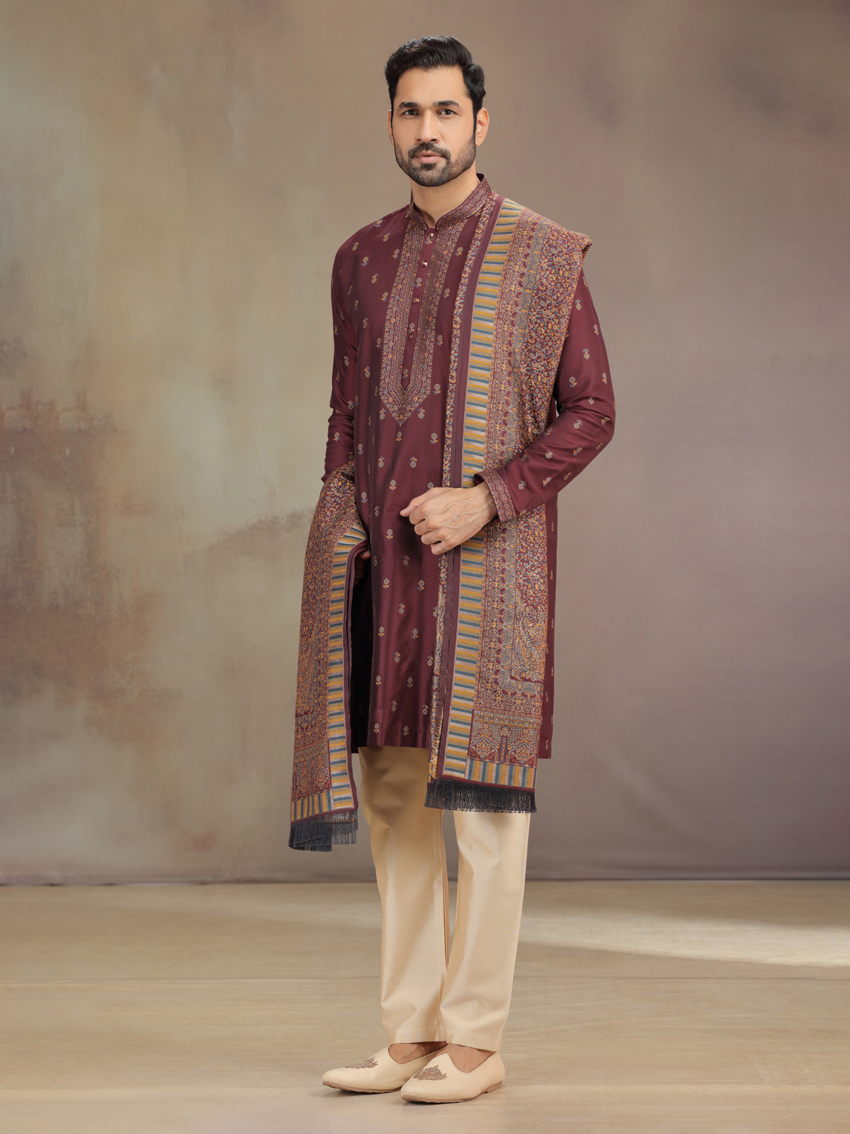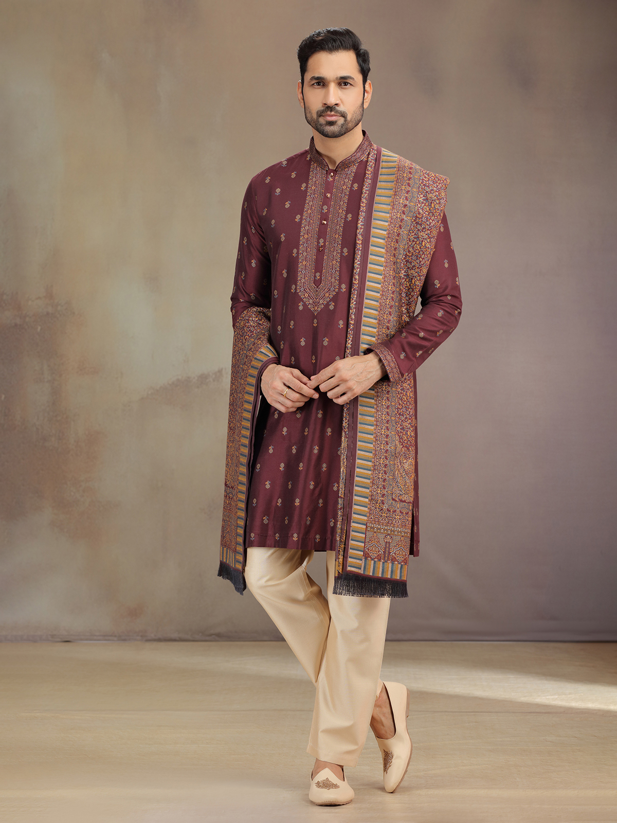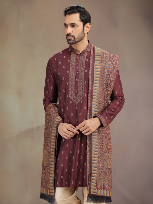 Warm and dignified, this brown cotton silk kurta pajama is touched with delicate thread artistry. The subtle work highlights its mandarin collar and full sleeves with grace. Combined with a dupatta and pants, it becomes an ensemble of refined simplicity, making it ideal for festive gatherings and wedding ceremonies filled with tradition.