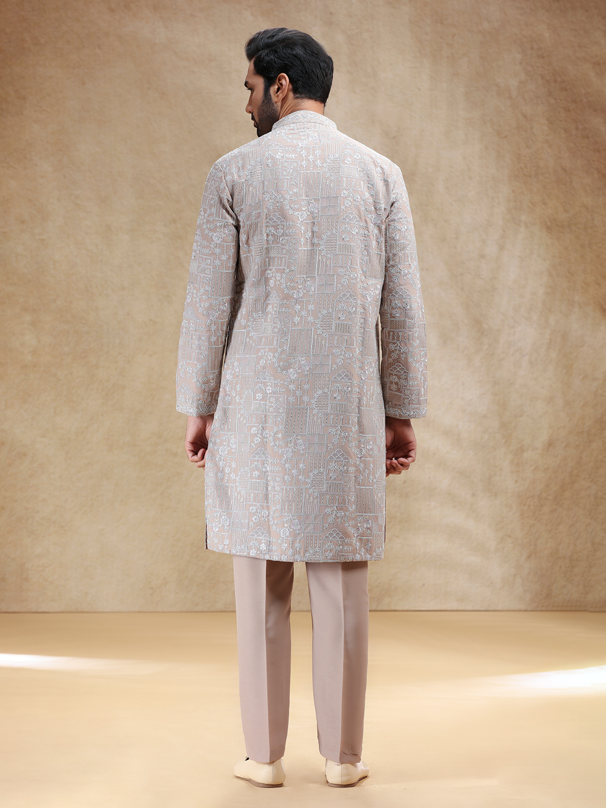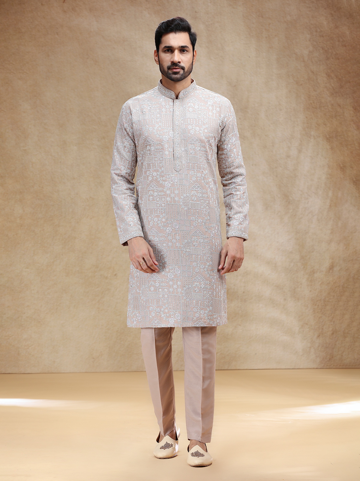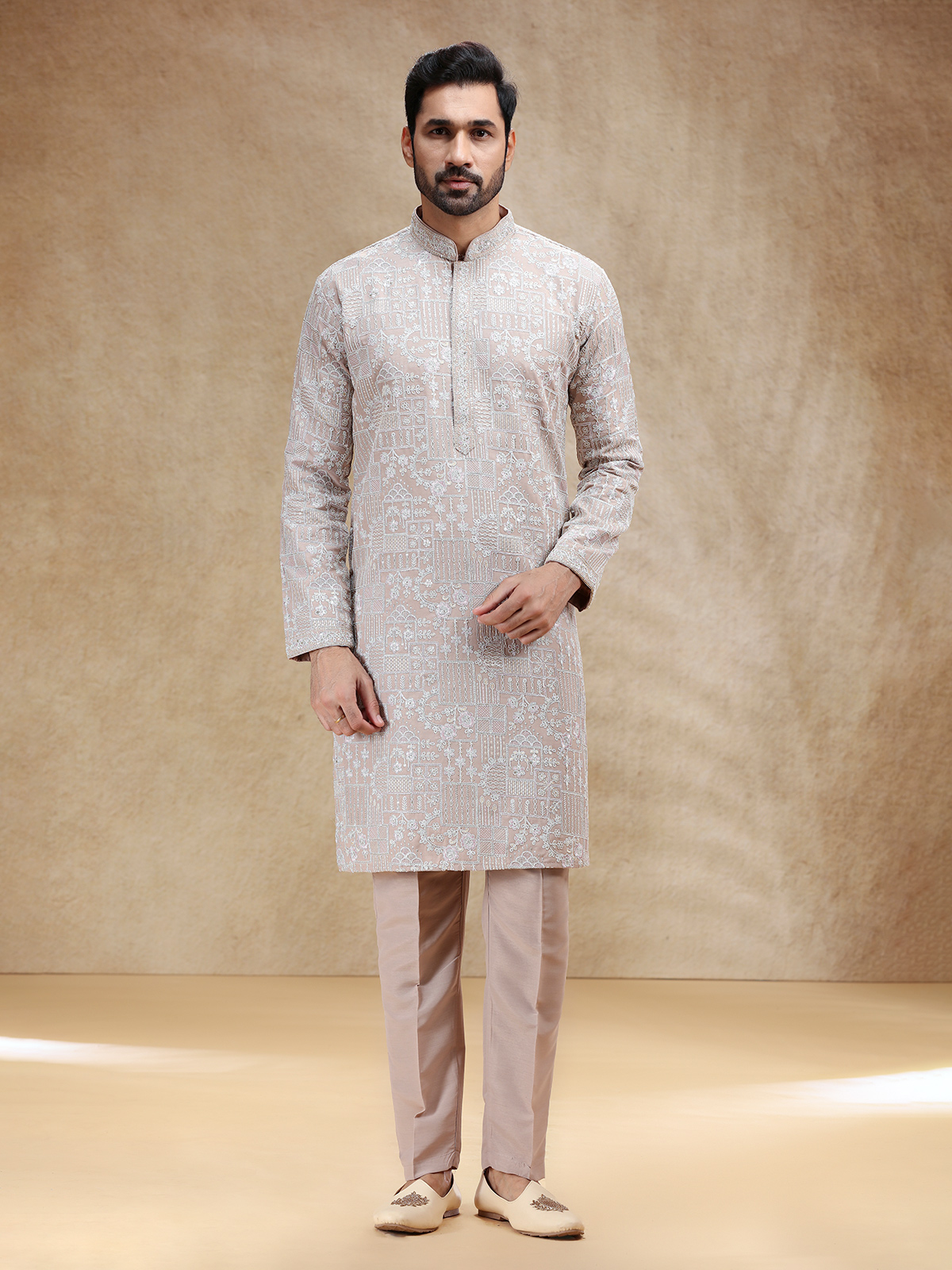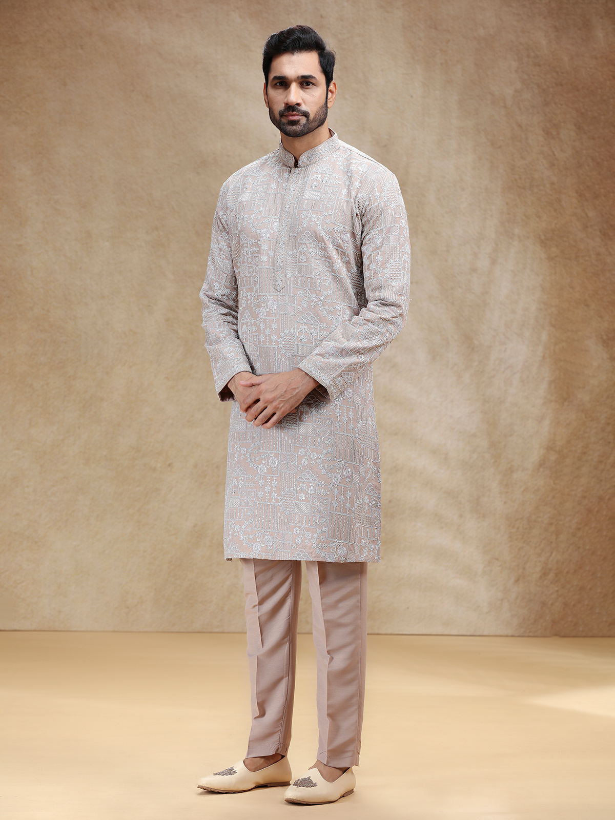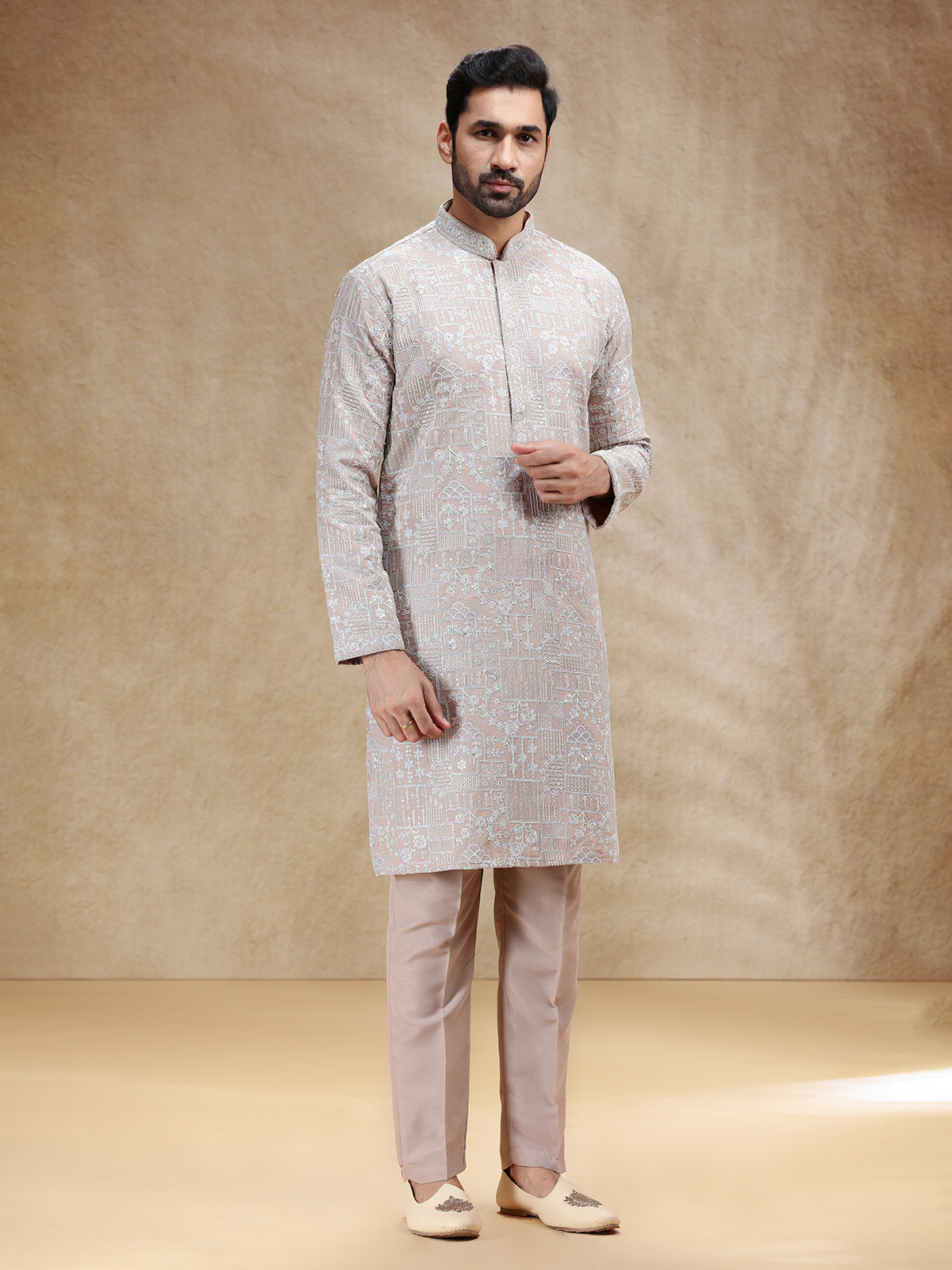 Understated yet luxurious, this beige silk kurta suit is highlighted with fine embroidery and thread work that reflect timeless beauty. Designed with a stand collar and full sleeves, it is paired with smartly tailored pants for a polished look. The soft beige hue lends warmth and grace, making it a perfect choice for festive events steeped in subtle sophistication.