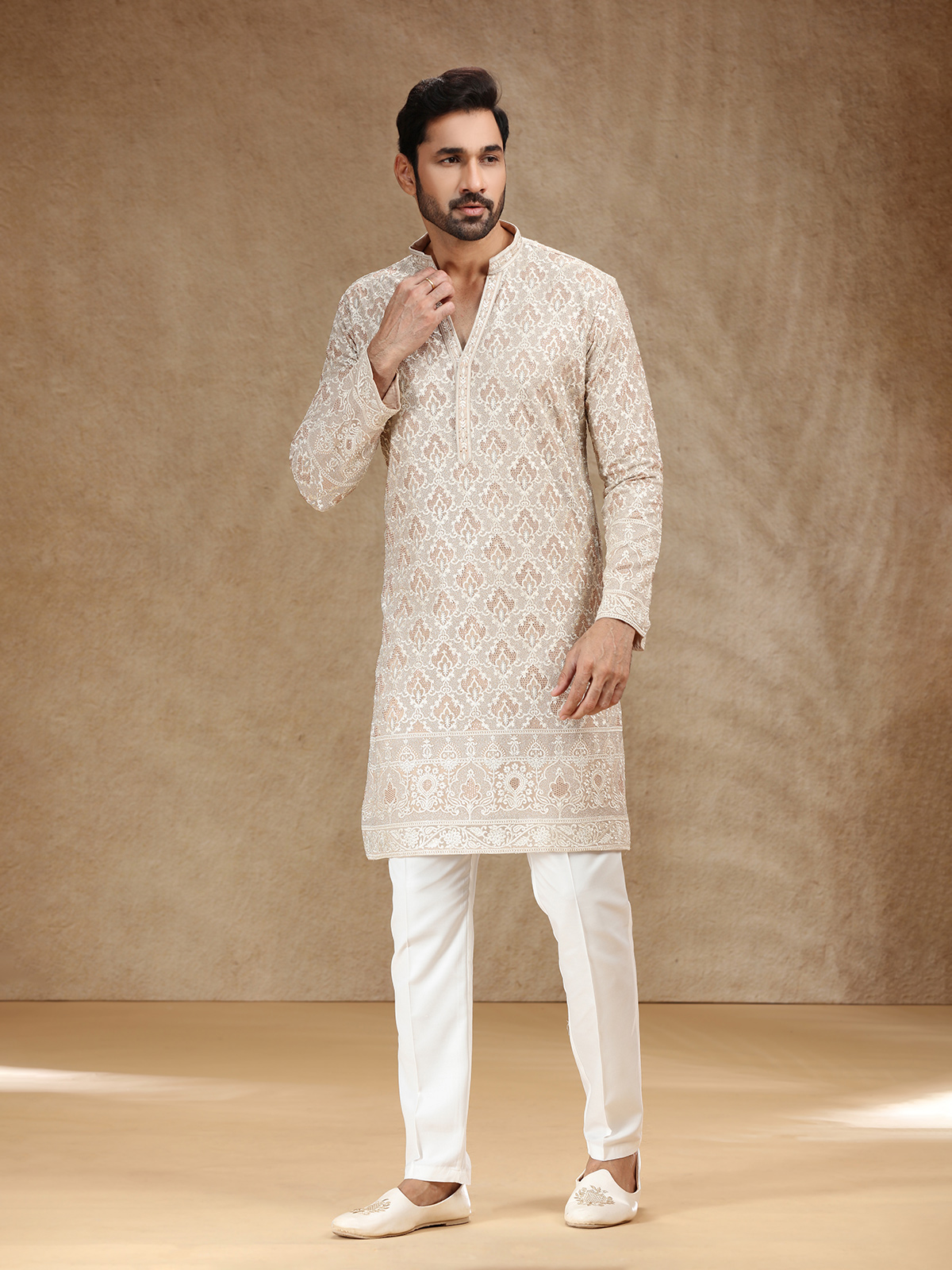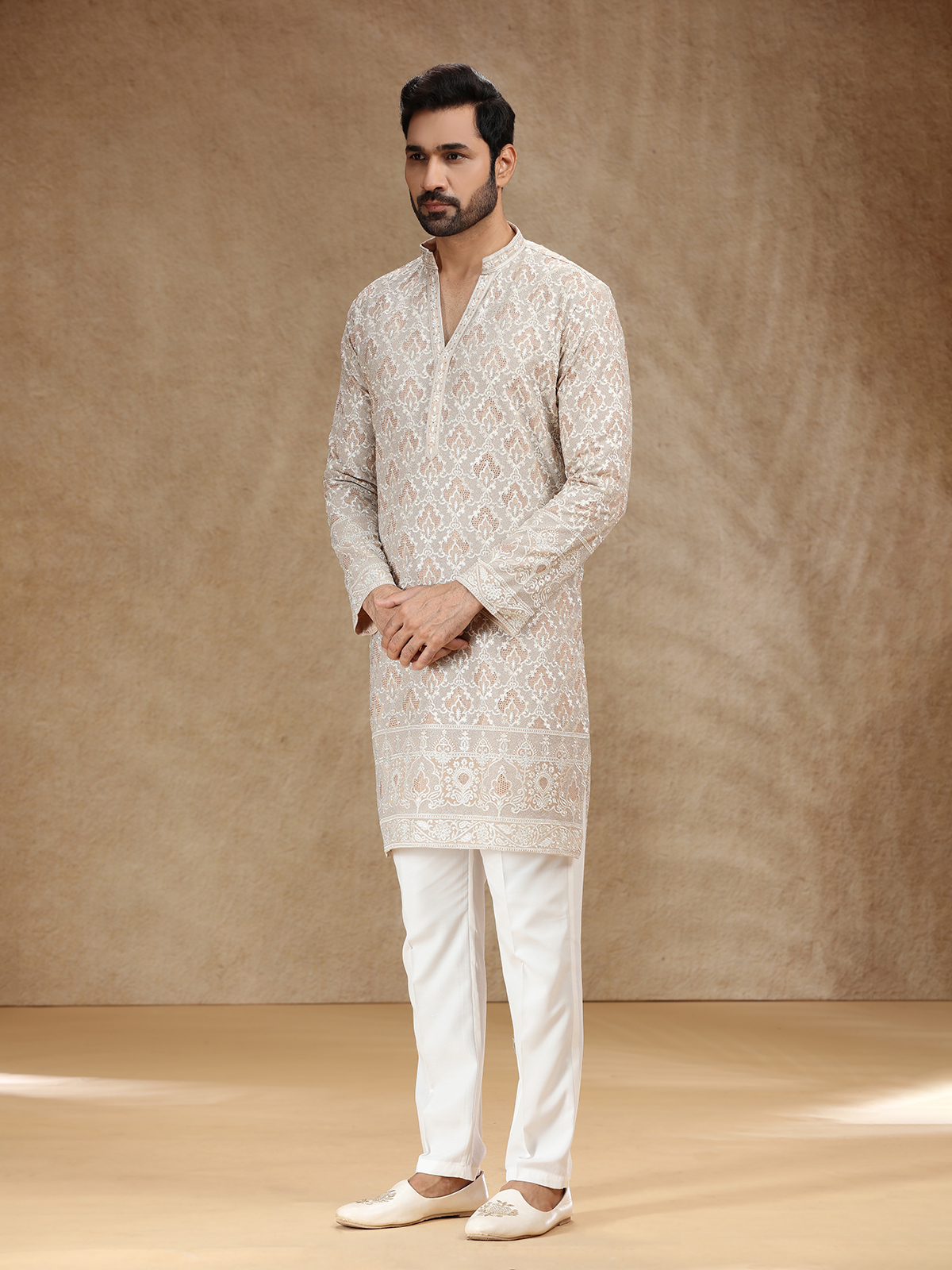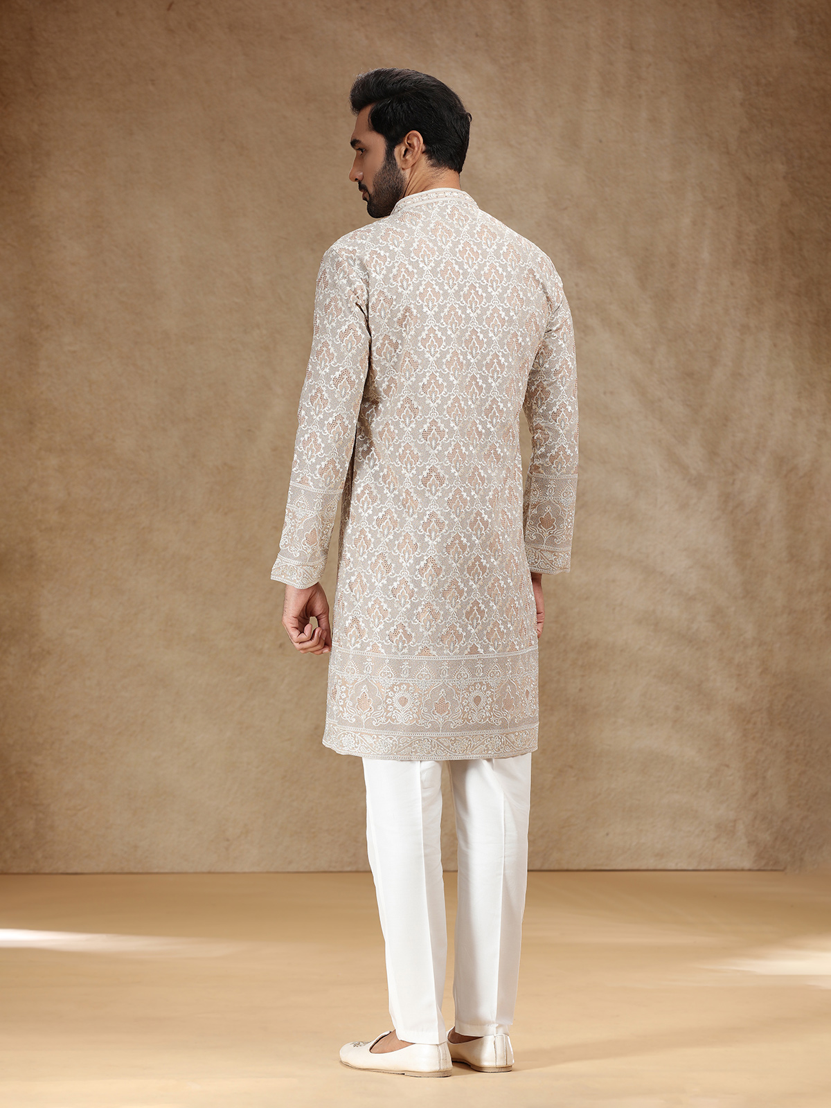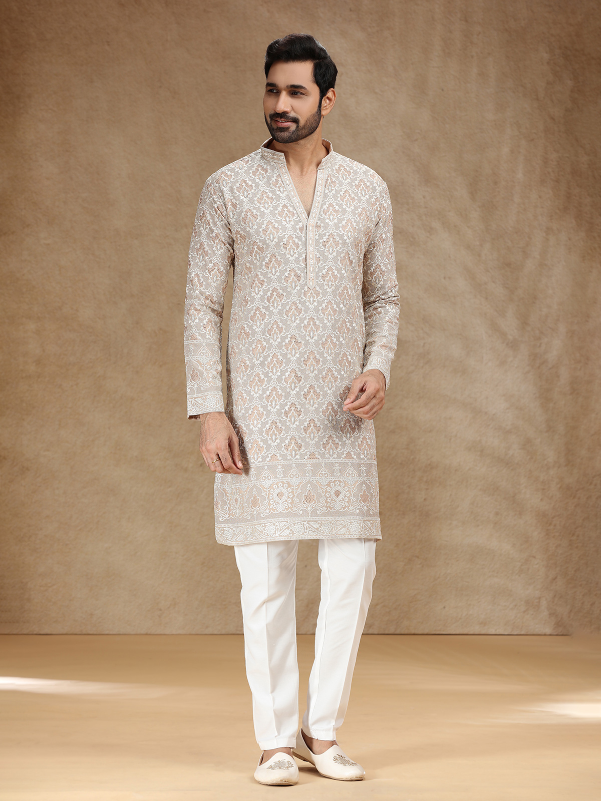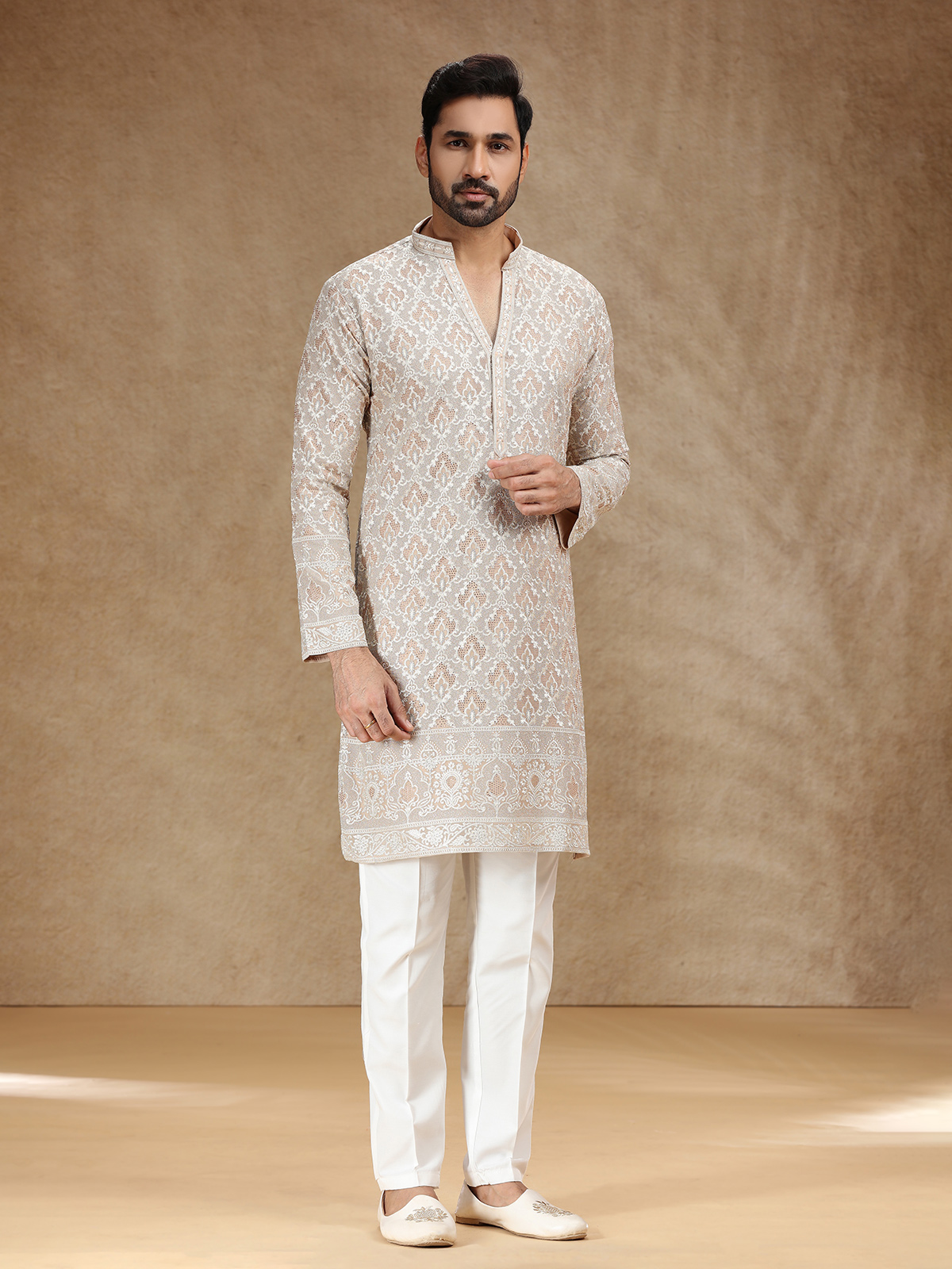 Resham and swarovski craftsmanship adorn this beige georgette kurta suit with luminous artistry. Styled with a refined stand collar and full sleeves, it pairs with a salwar that complements its soft silhouette. The gentle beige shade whispers elegance and charm, making this ensemble a serene choice for festive gatherings filled with warmth and grace.