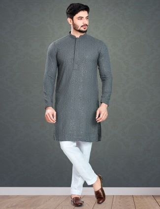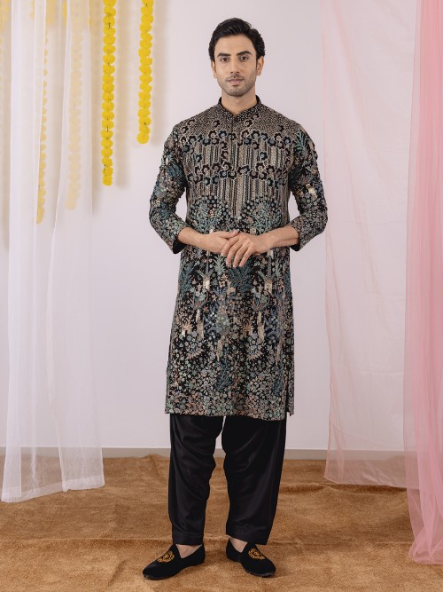 Exude festive sophistication in this black georgette kurta suit, featuring bold embroidery and sequins detailing, mandarin collar, half-button placket, and full sleeves. Paired with a salwar, it combines comfort with ethnic style, perfect for weddings, receptions, or festive celebrations.