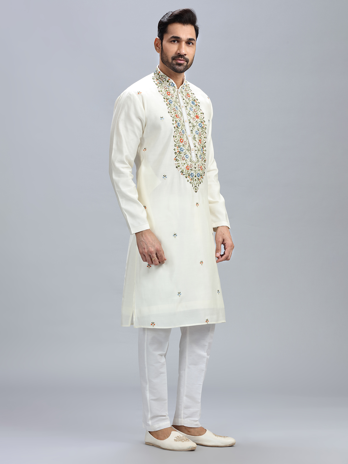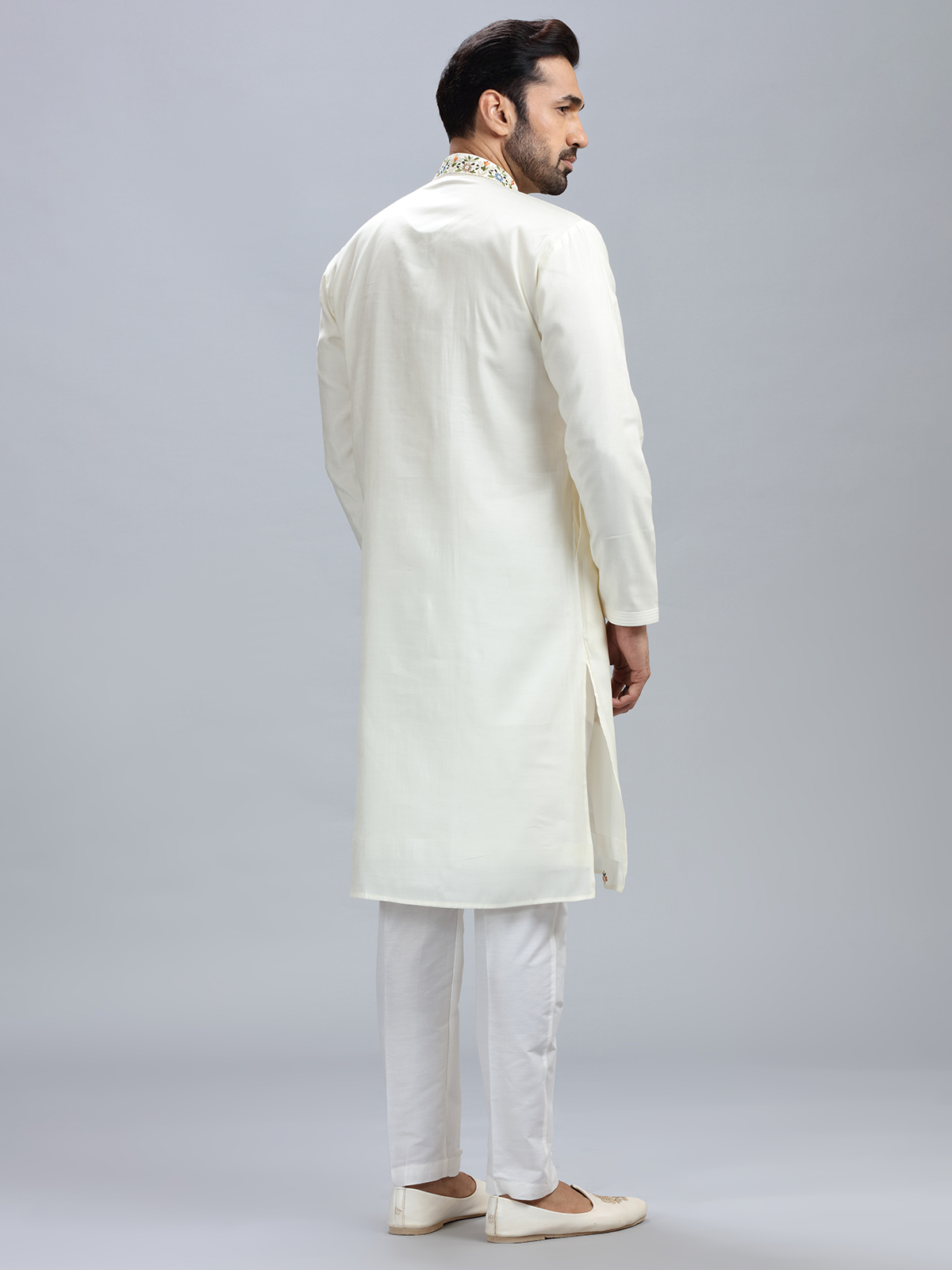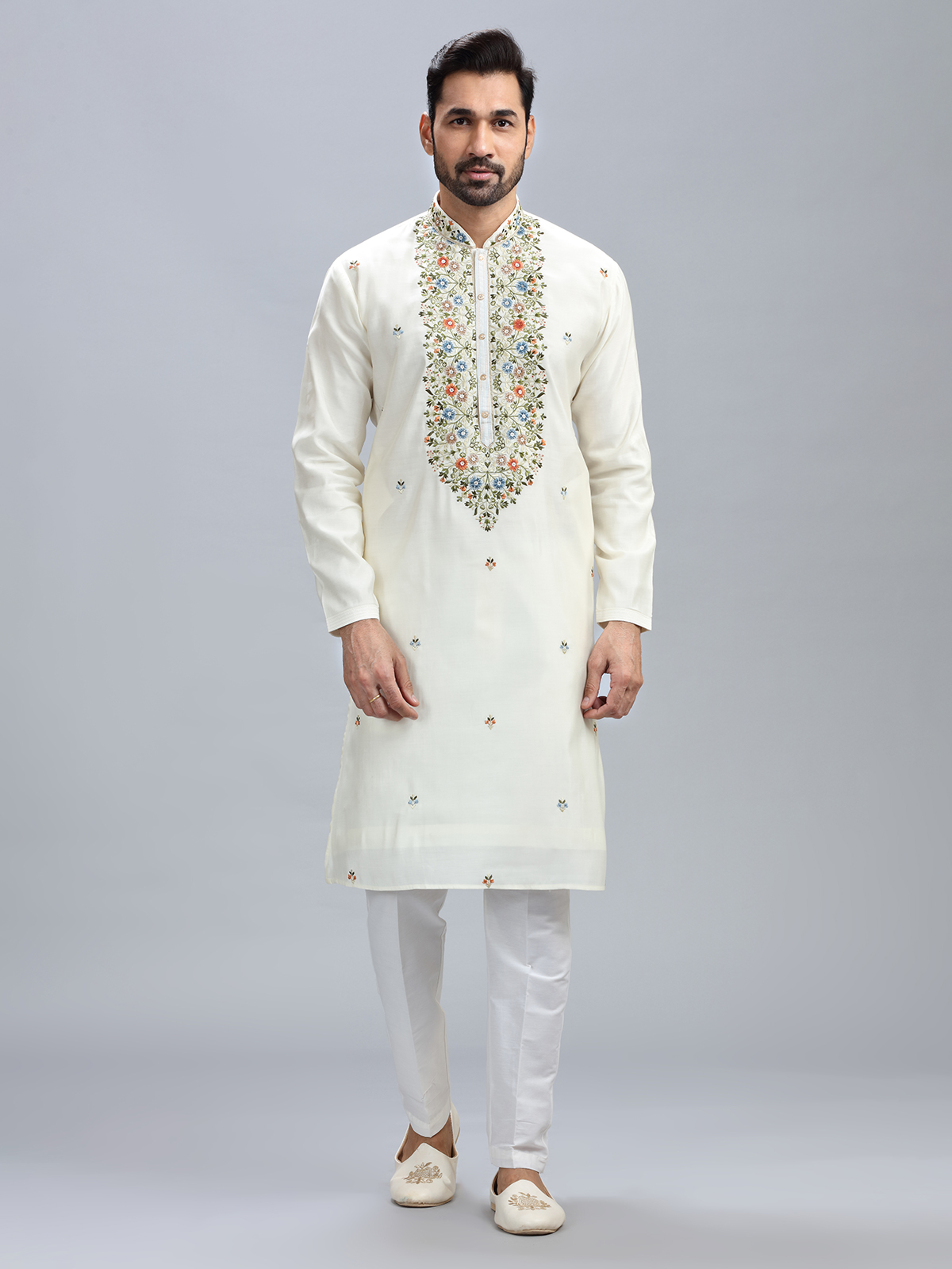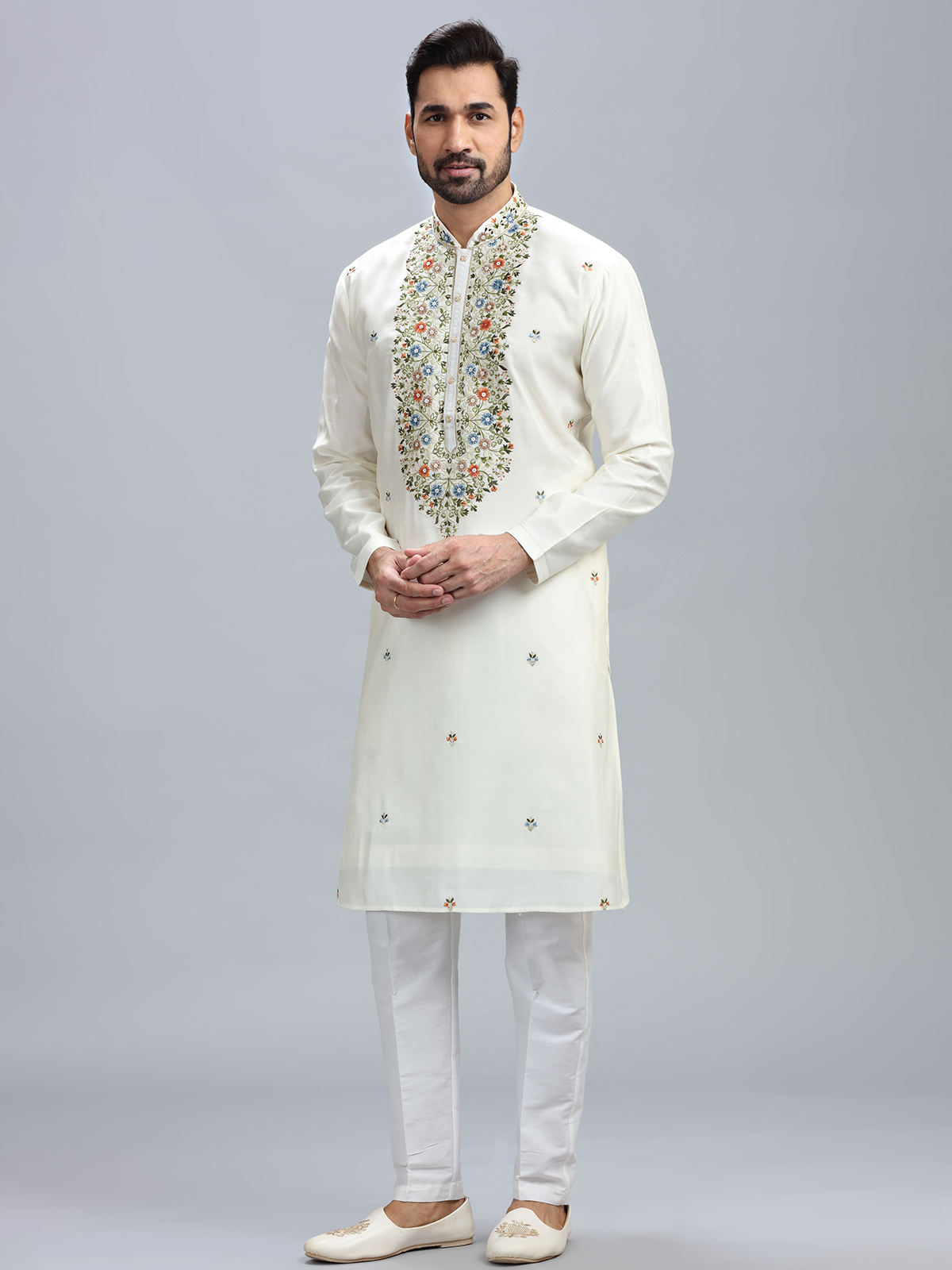 With this off-white cotton silk kurta set, you can easily access traditional ethnic style with just a single click. This one features a mandarin collar, beadwork, resham, and embroidery, and it also has a matching bottom.