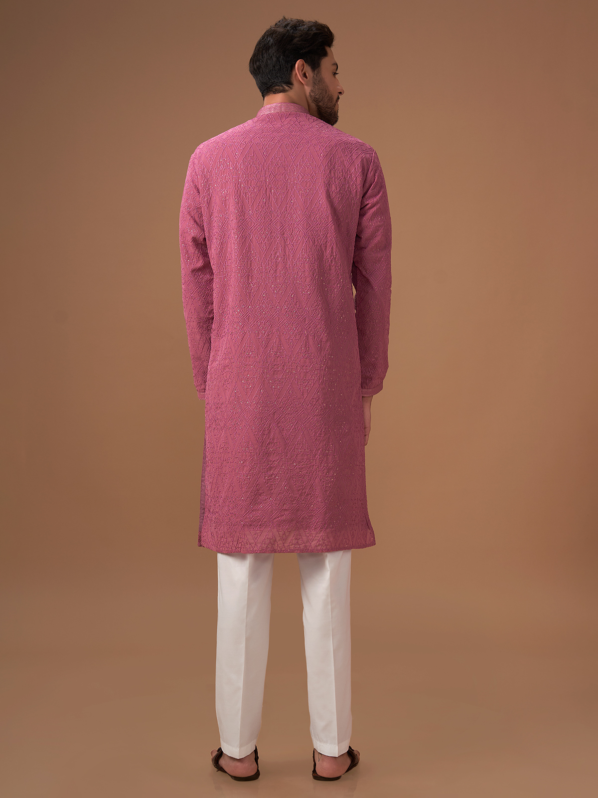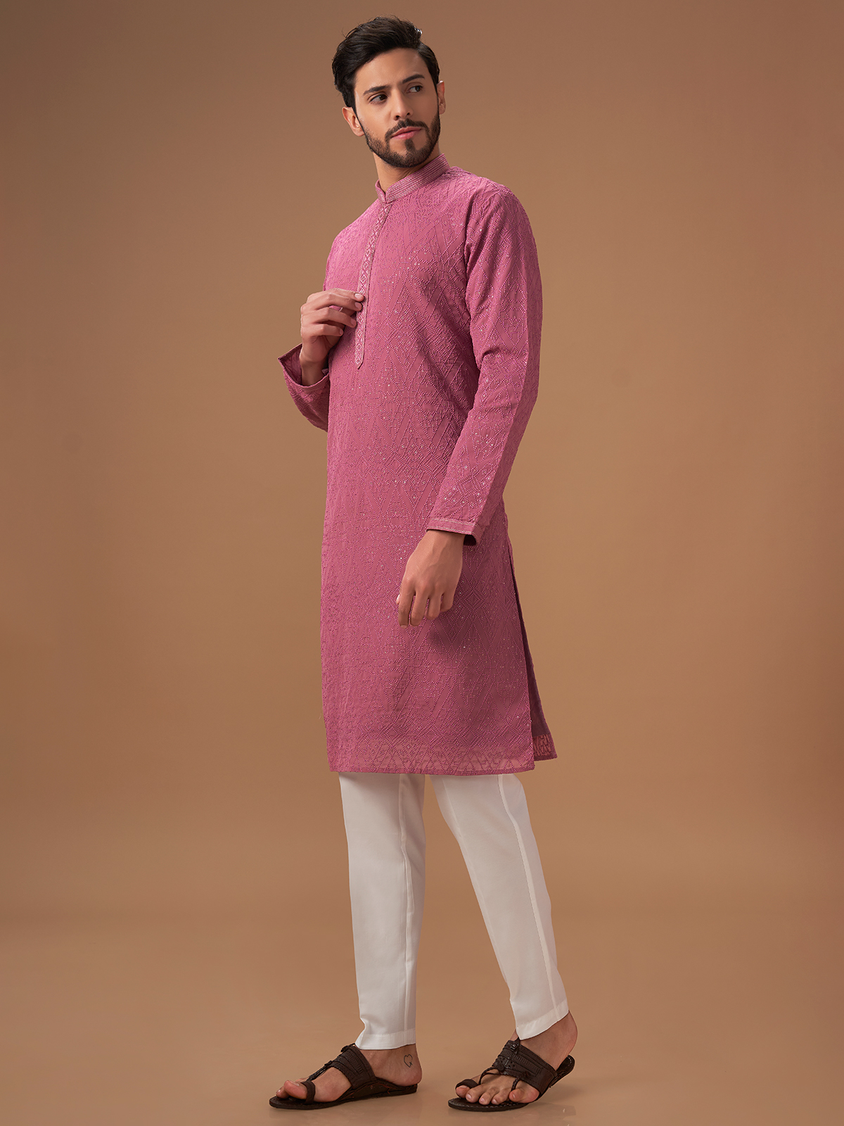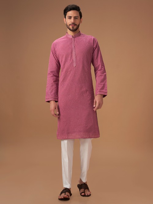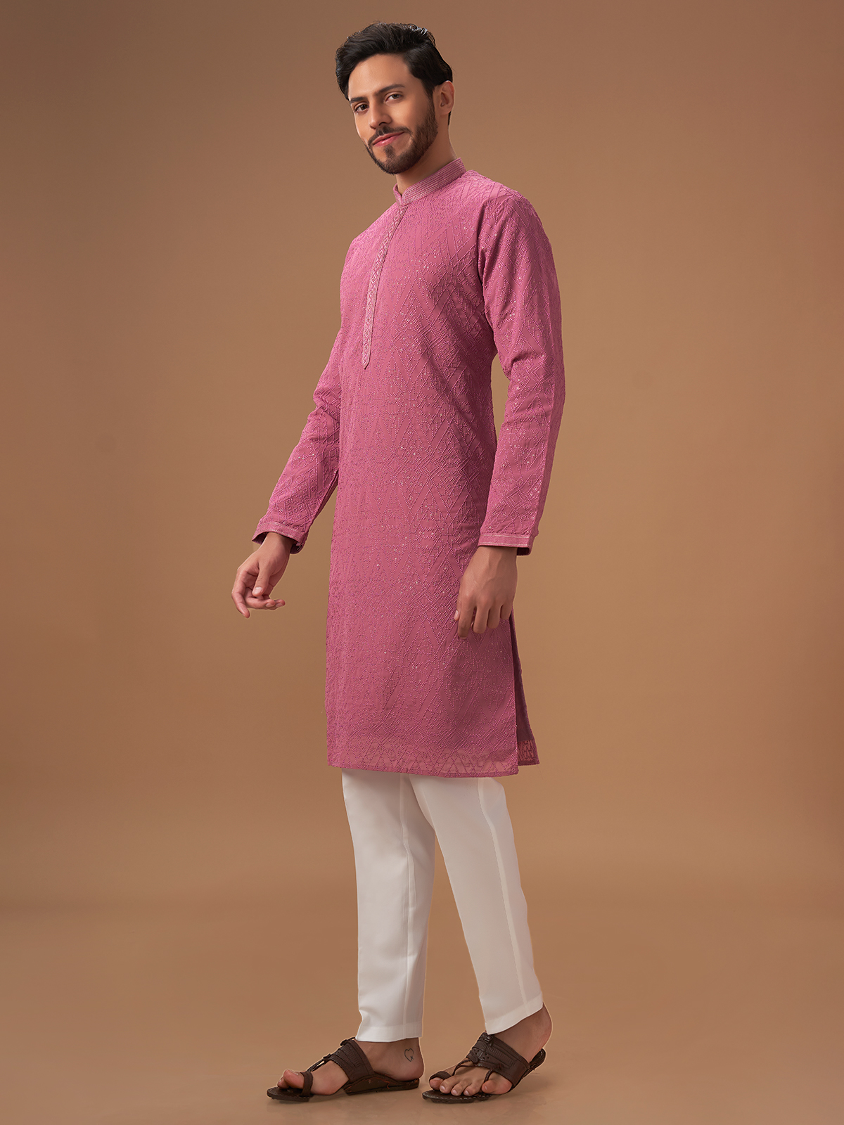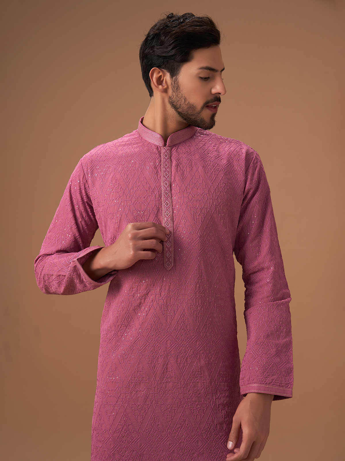 Make a statement with this pink georgette kurta suit. The exquisite embroidery, resham and sequins work, combined with full sleeves and a comfortable mandarin collar, make it a versatile choice. Comes with a bottom.