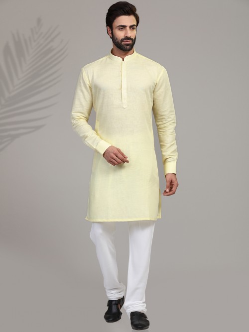 Yellow cotton kurta suit for festive occasions. Features stand collar, half button placket, full sleeves and straight hemline. Comes with a bottom.