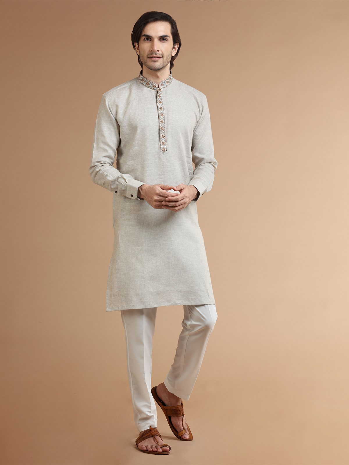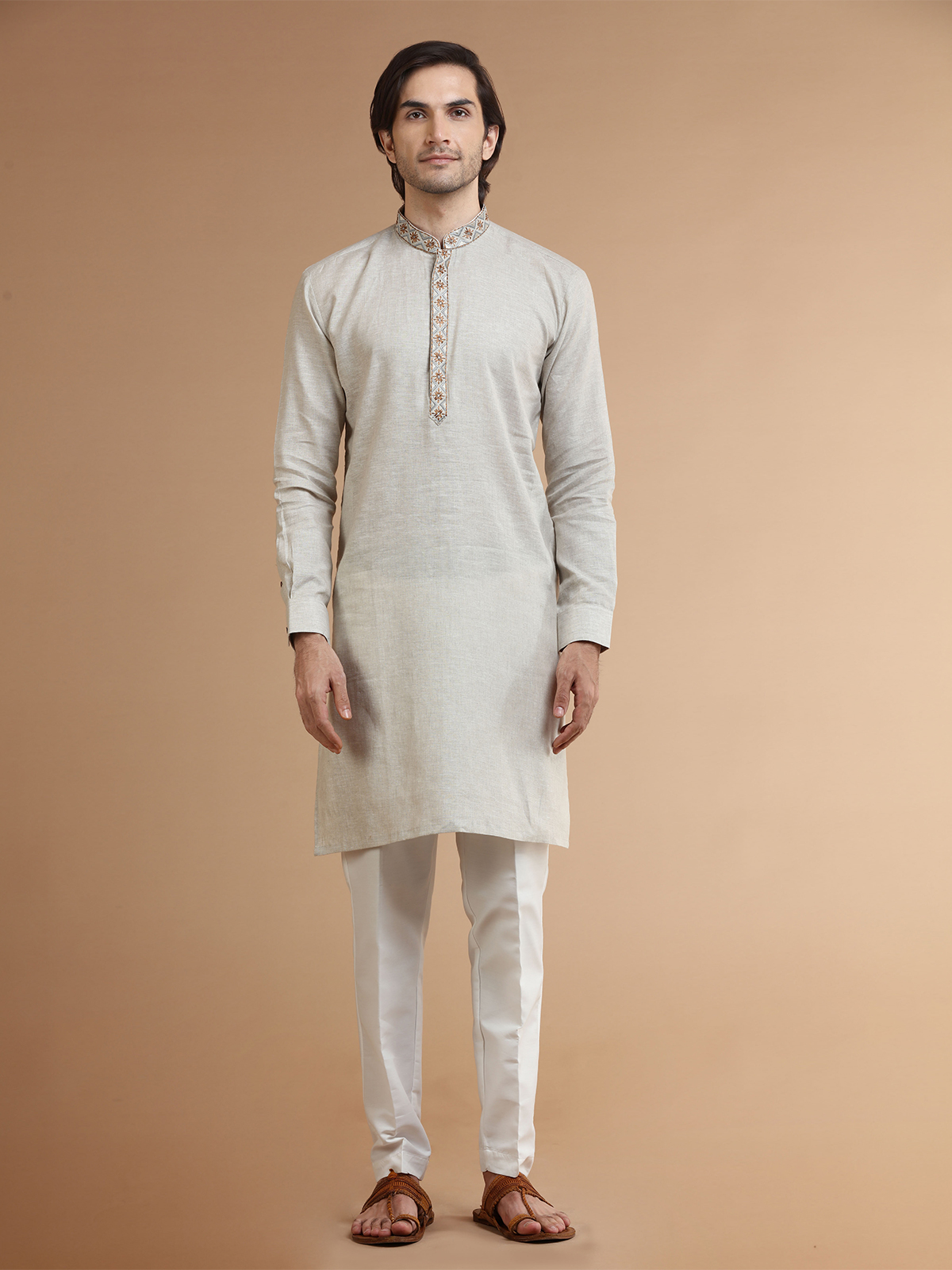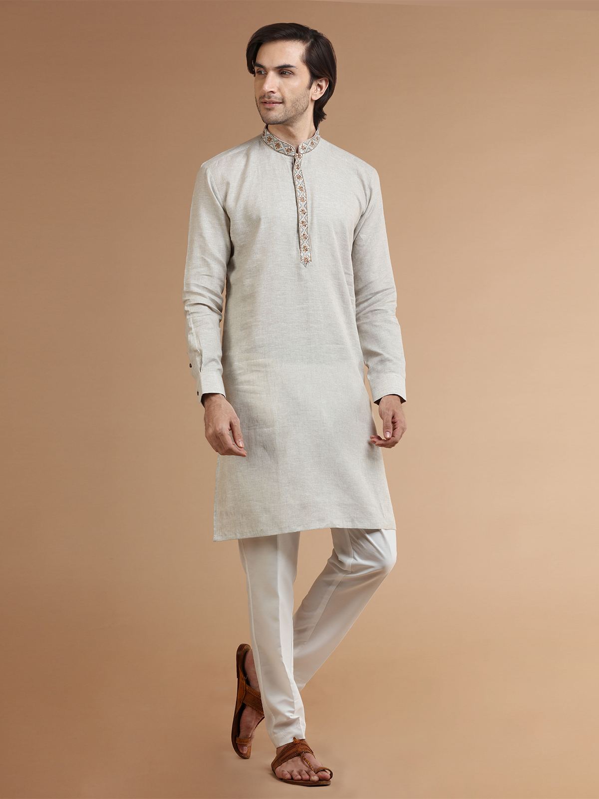 Make space in your ethnic collection for this classy beige plain linen kurta suit. The comfortable fabric and mandarin collar, along with full sleeves, make it perfect for any occasion. The set includes a bottom.