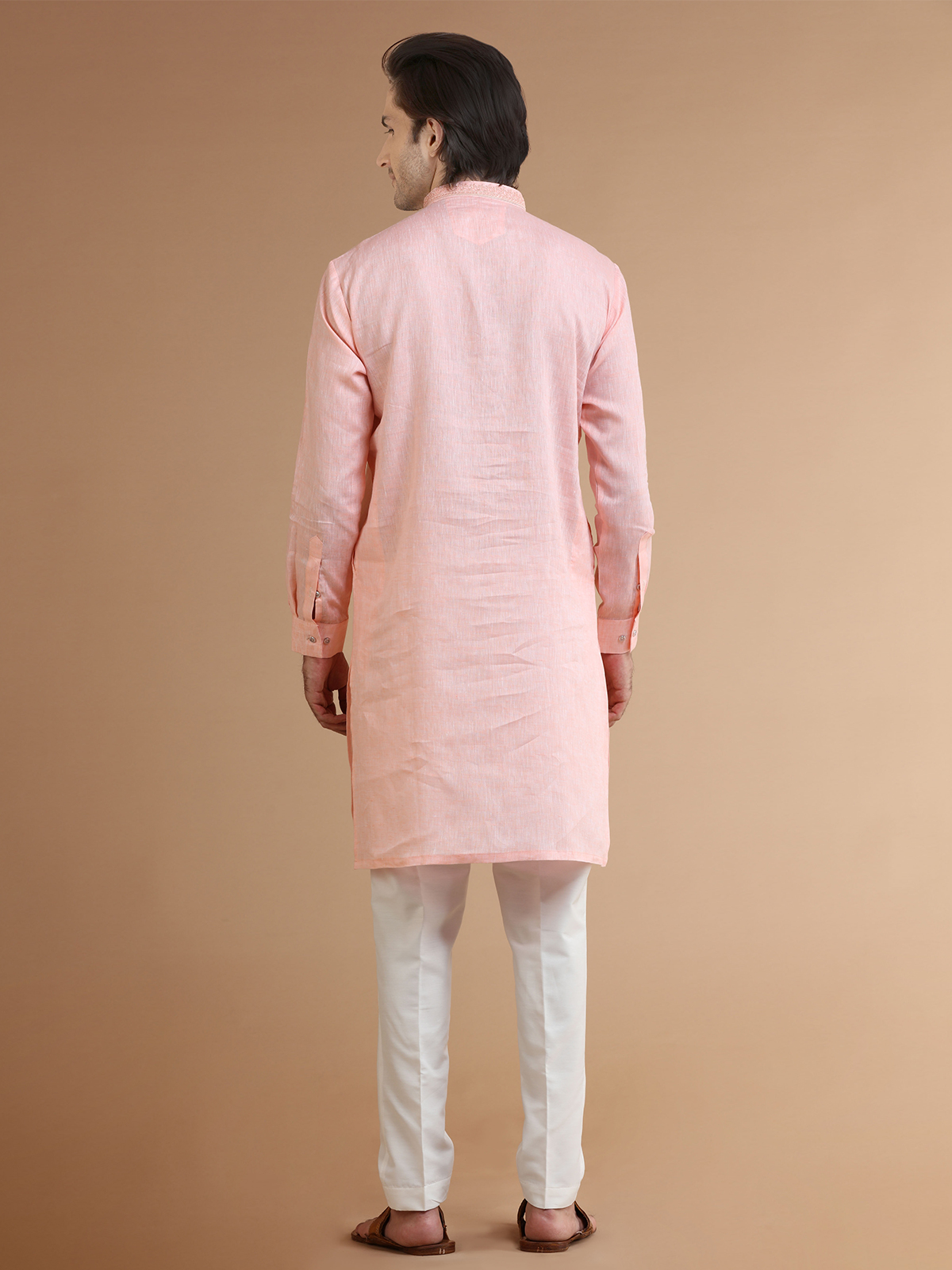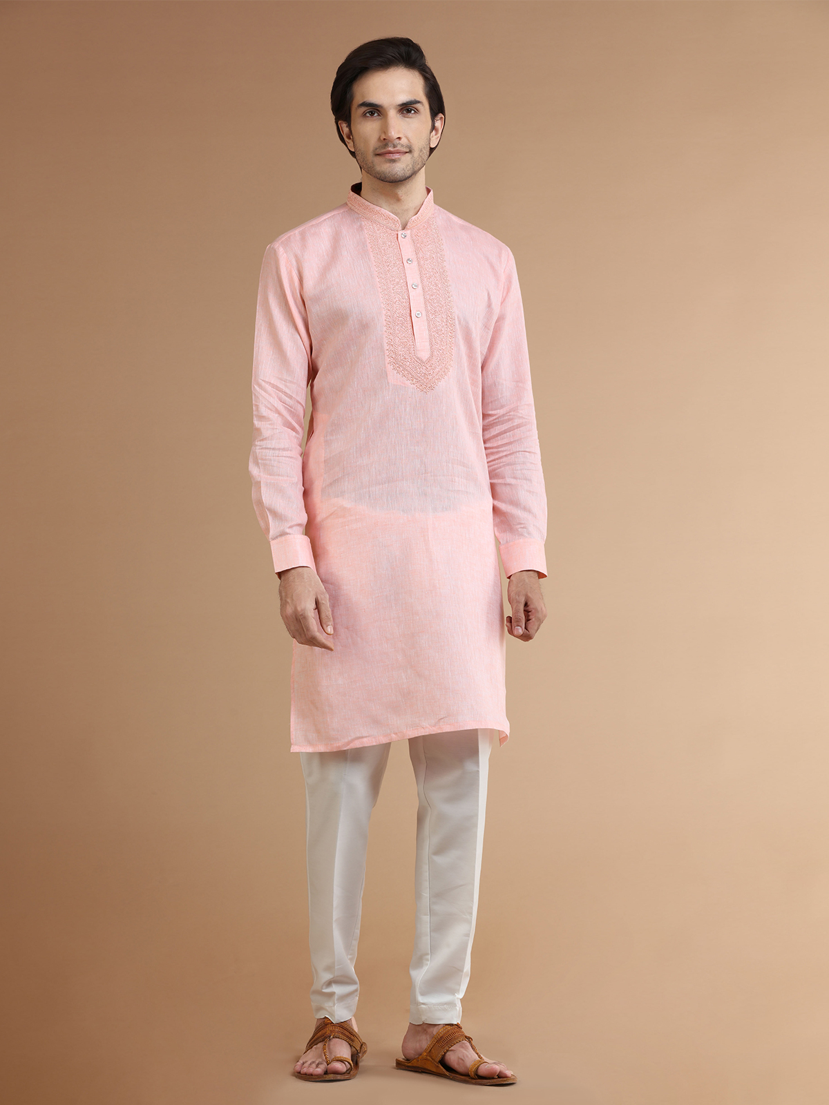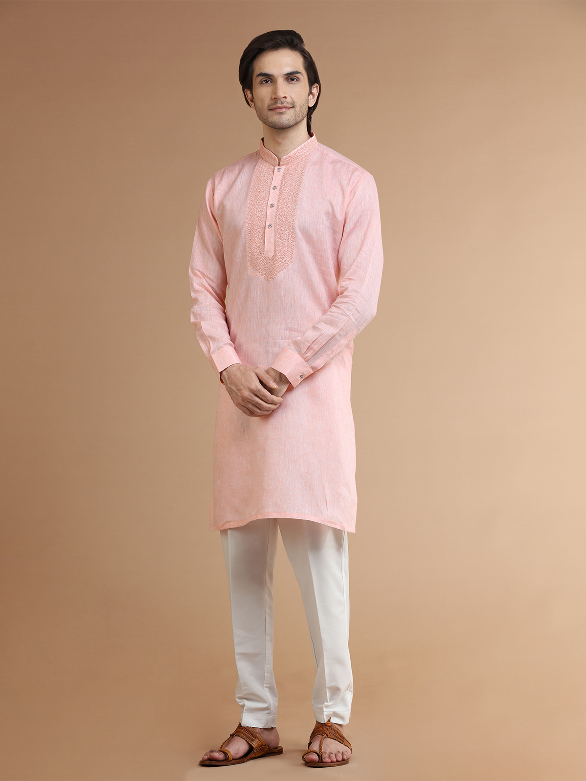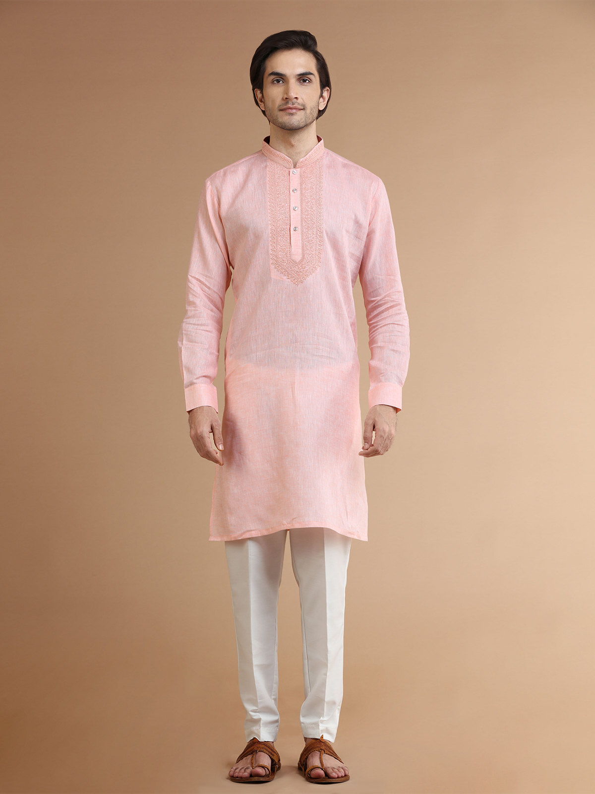 Get a classy look with this comfortable peach linen kurta suit. The resham work with a mandarin collar and full sleeves adds to the overall design. Comes with a bottom.