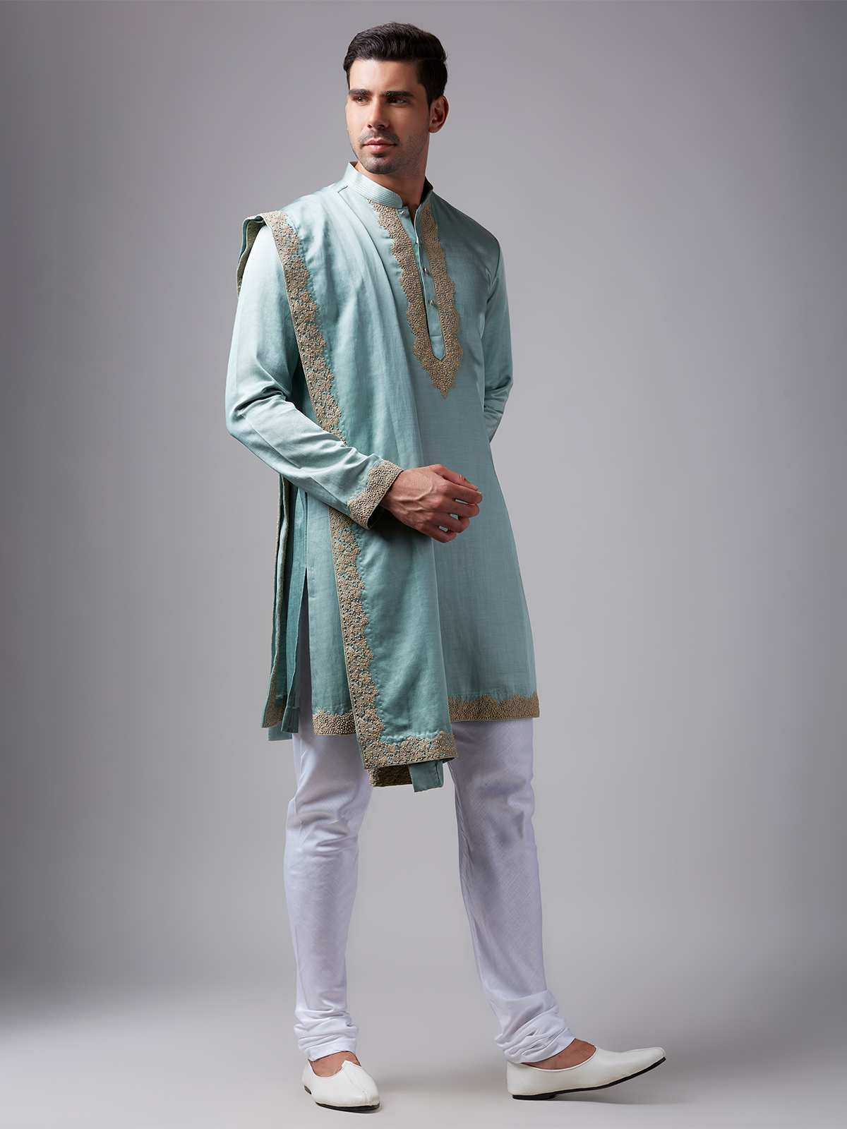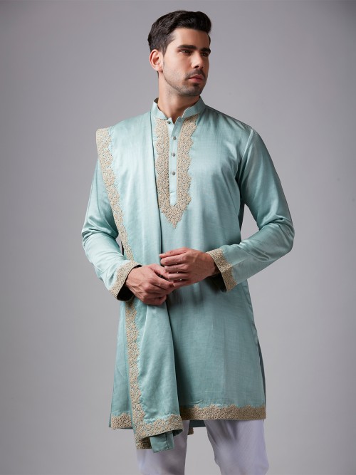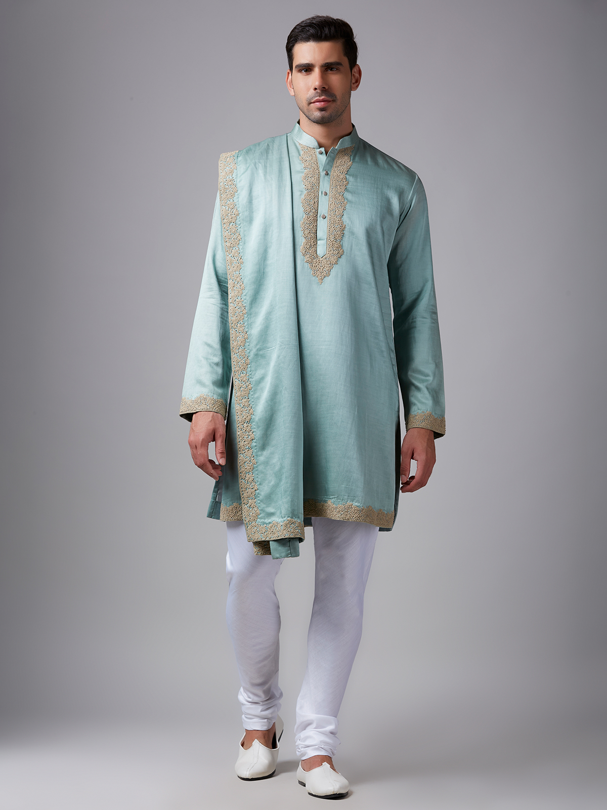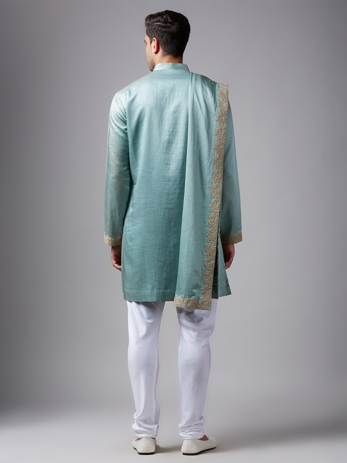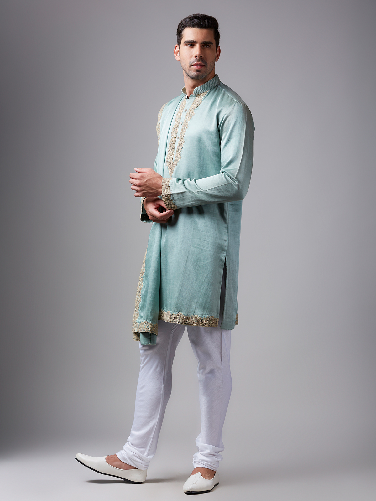 Radiate grace in this sea green silk kurta suit, adorned with intricate handwork for an ethnic flair. Complete with a mandarin collar, full sleeves, and churidar, it is a testament to timeless elegance.