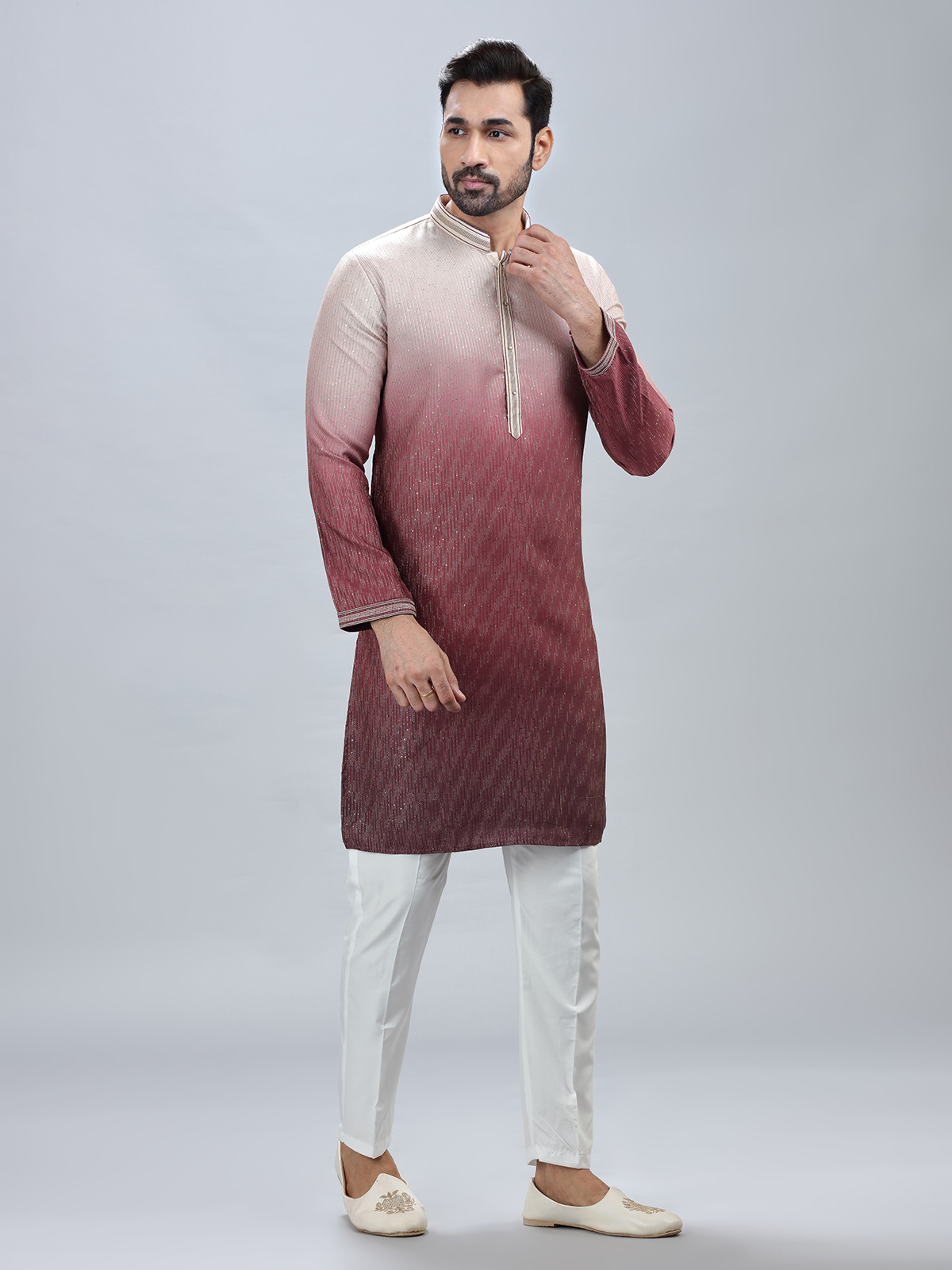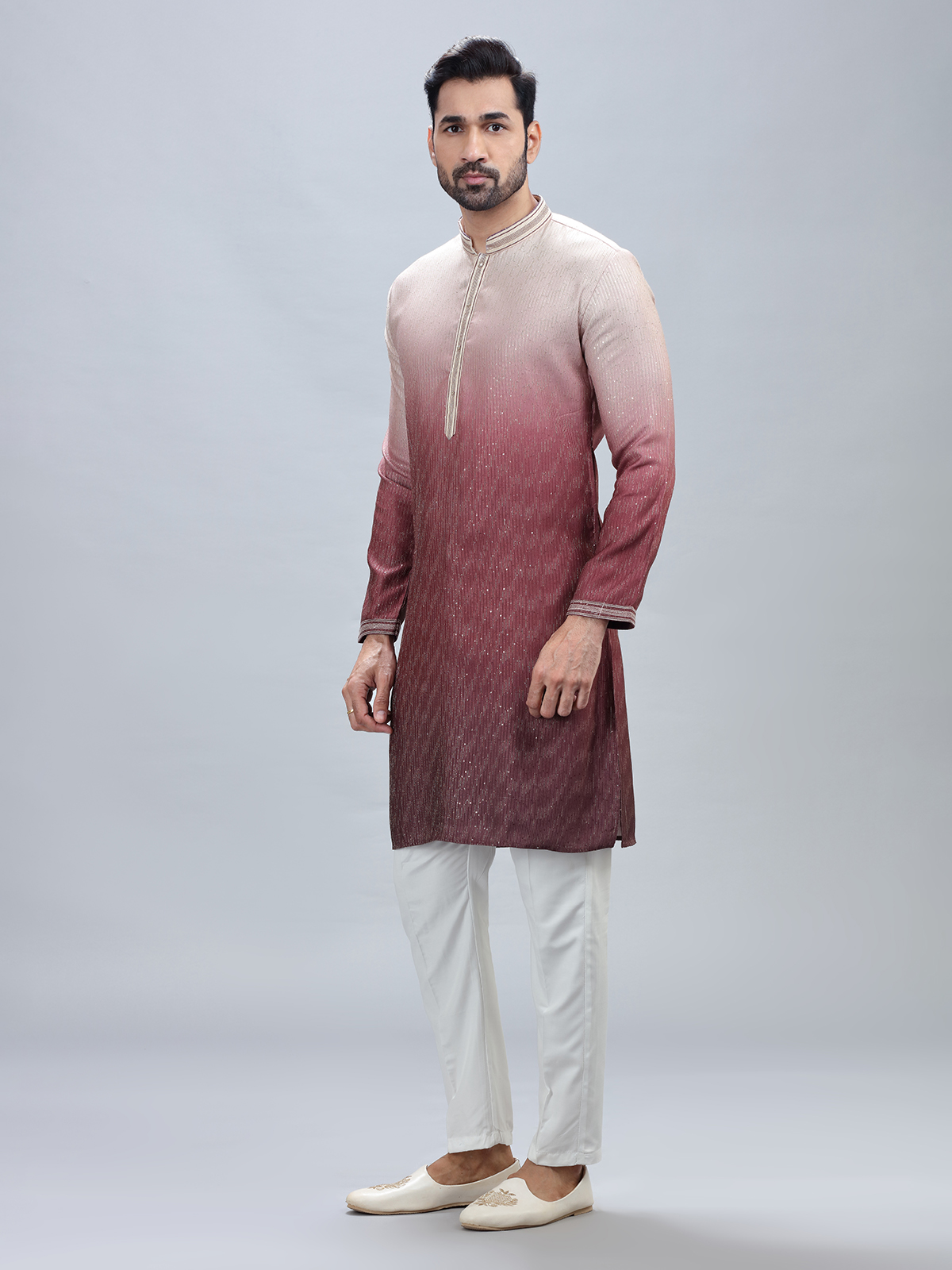 The perfect option for the major celebration day is a full-sleeved kurta suit in wine georgette with a mandarin collar, suitable sequins, and thread work throughout. It also comes with the matching bottom, so make the most of it now that it's here.