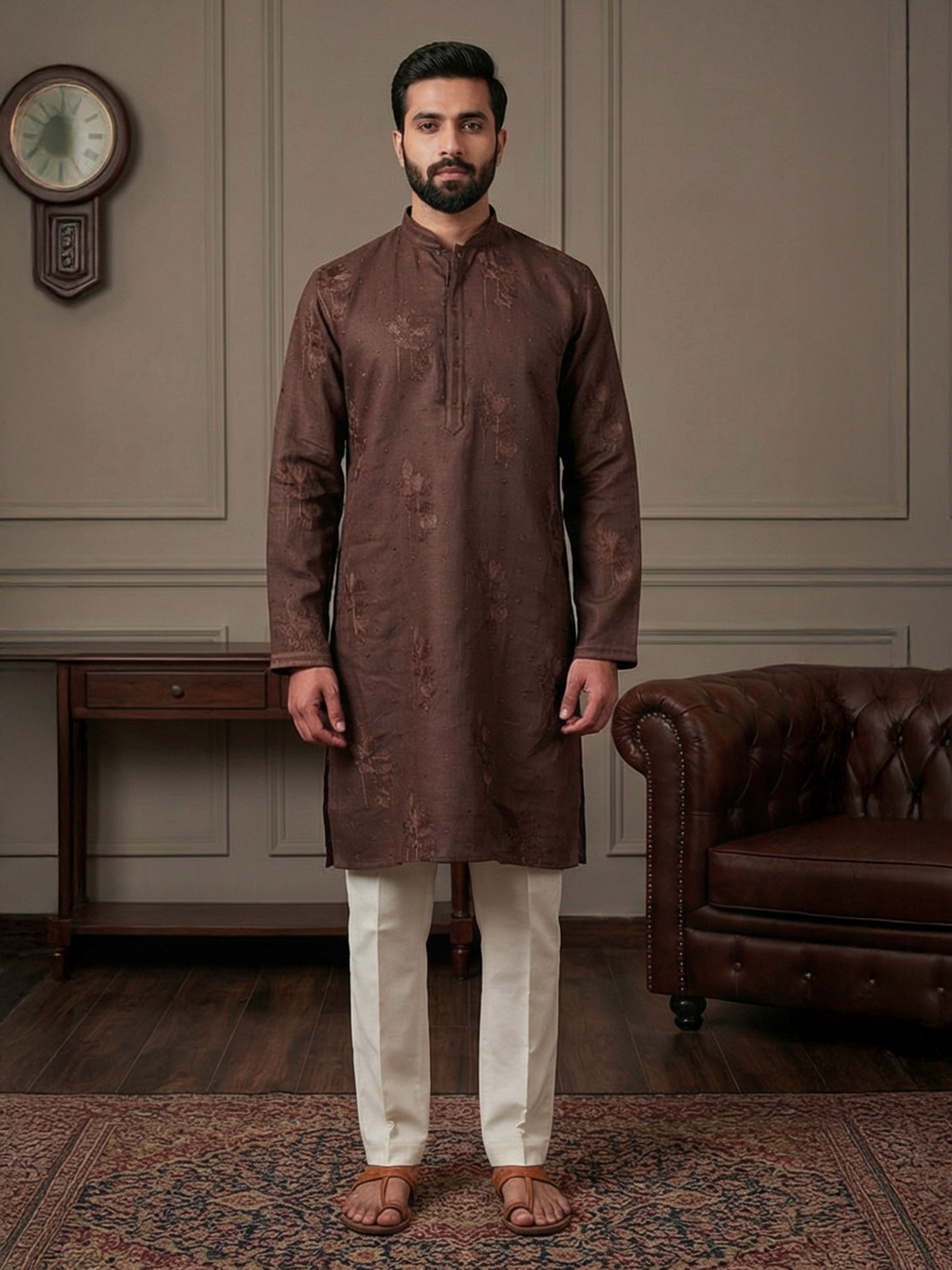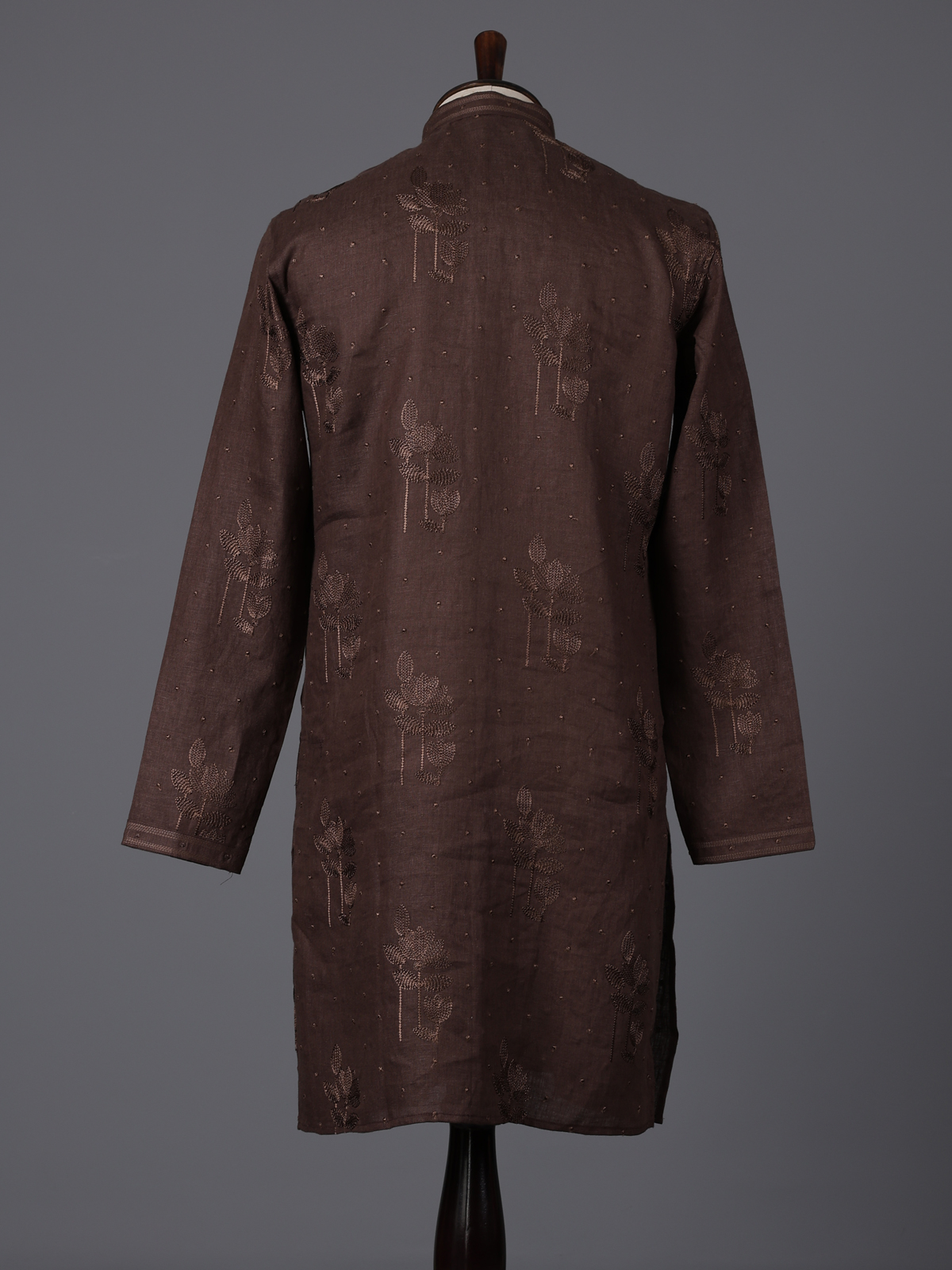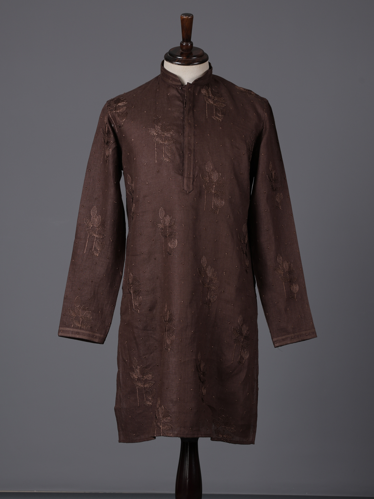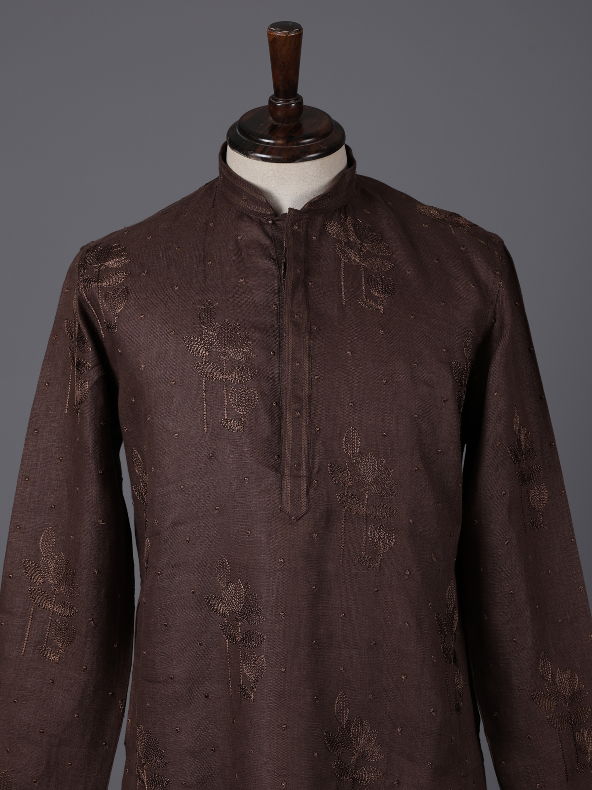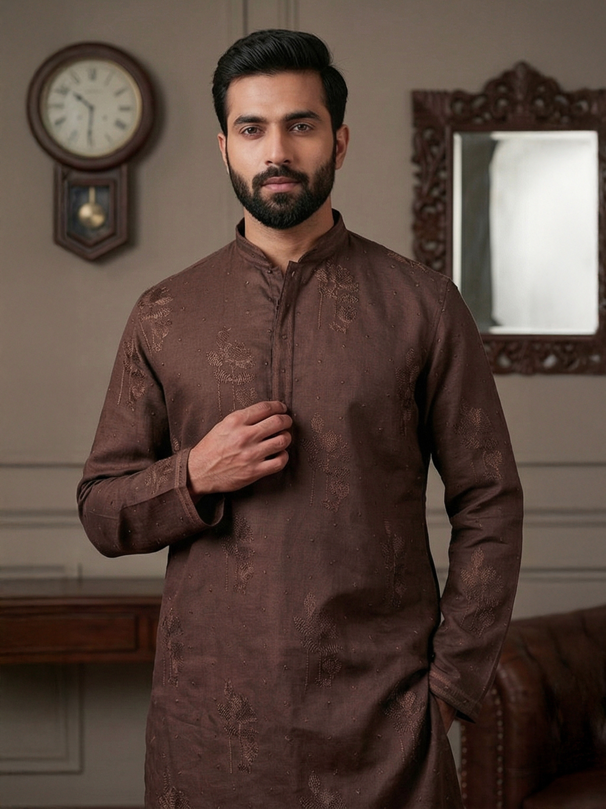 Deep coffee brown hues bring timeless elegance to this cotton linen kurta suit designed for festive wear. Adorned with fine embroidery work, it reflects subtle craftsmanship and refined detail. The mandarin collar sharpens its structured silhouette, while the breathable fabric ensures all day comfort. Paired with tailored pants, this ensemble creates a polished and graceful ethnic look perfect for sangeet and celebrations.