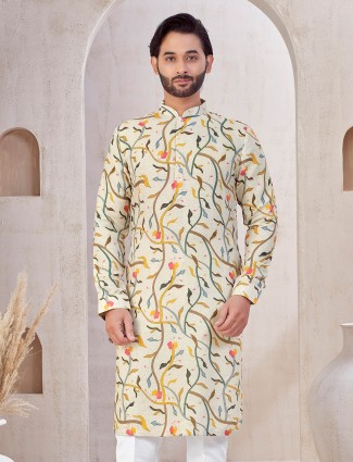 Keep it simple yet stylish with this beige cotton kurta suit, perfect for festive occasions. The breathable fabric, full sleeves, and subtle floral pattern pair beautifully with the neat mandarin collar. Comes with white bottoms for a graceful, complete look.