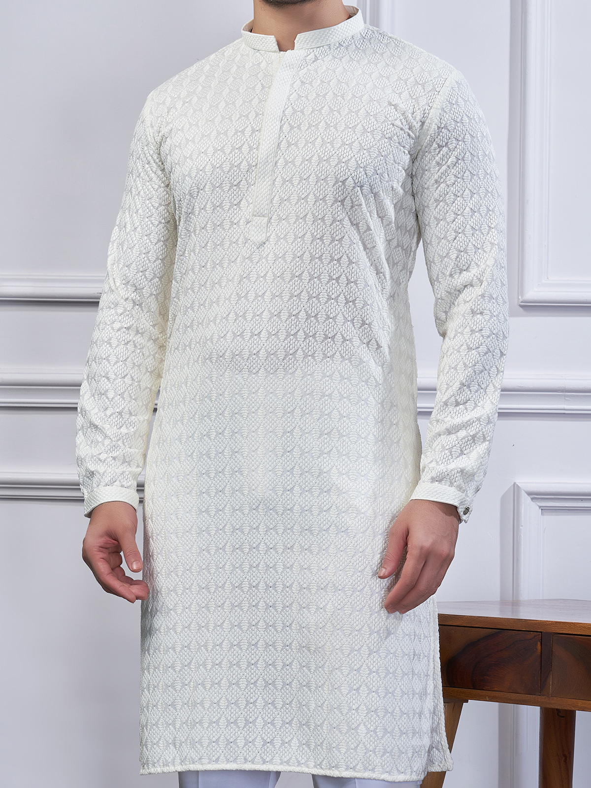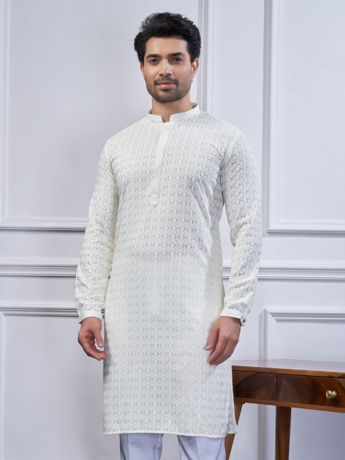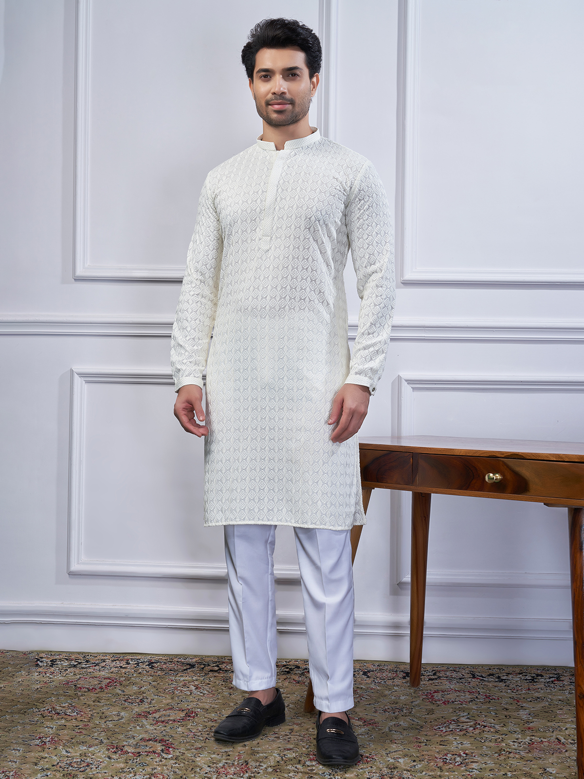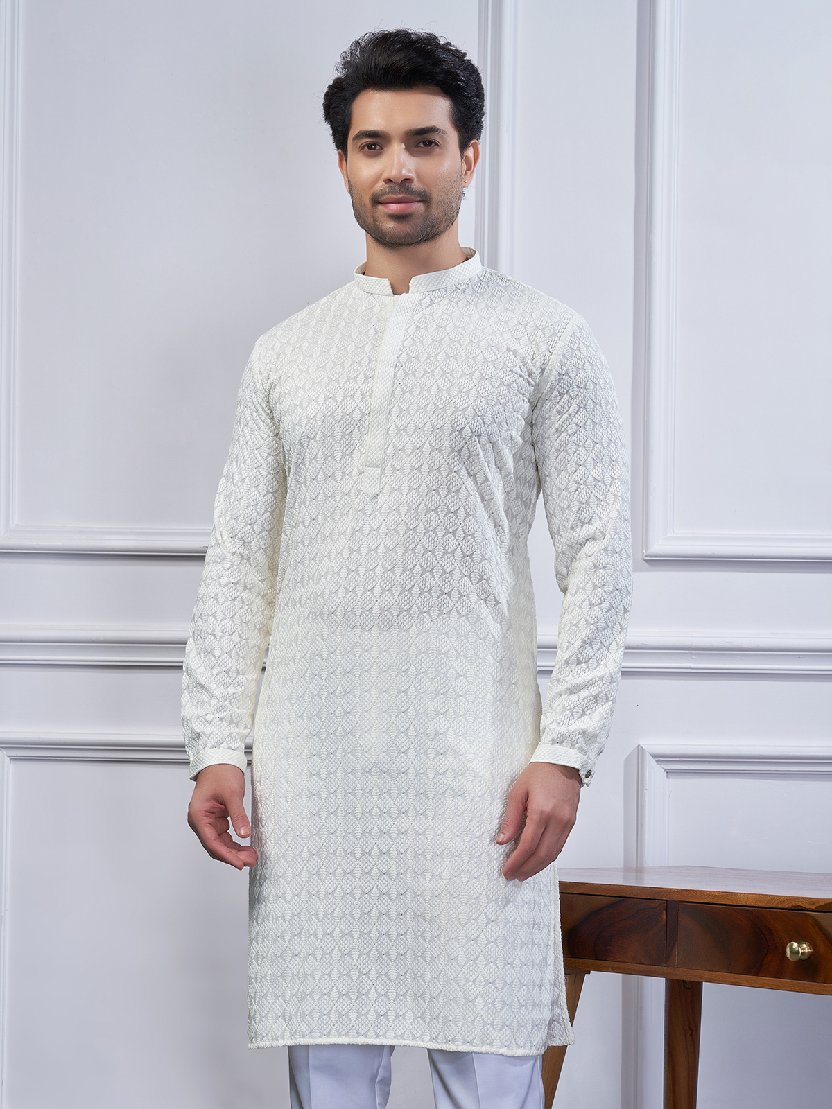 Elevate your festive look with this cream embroidered cotton kurta suit. Styled with a mandarin collar and full sleeves. Comes with a bottom.