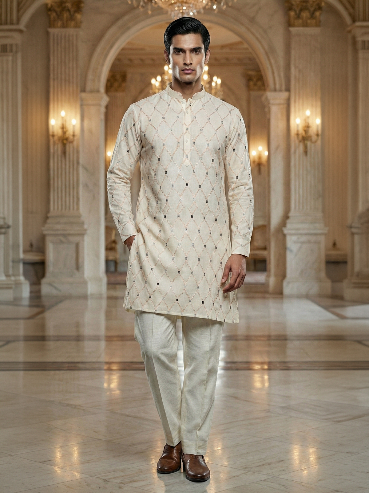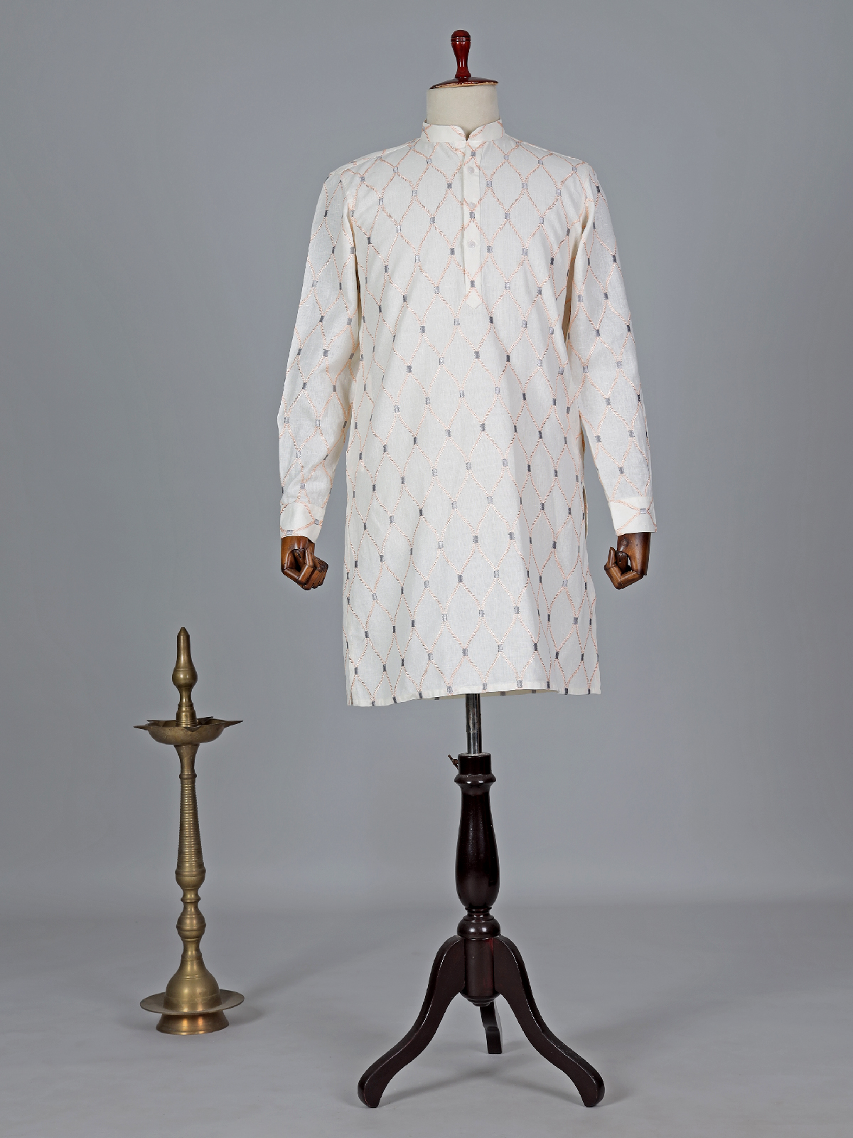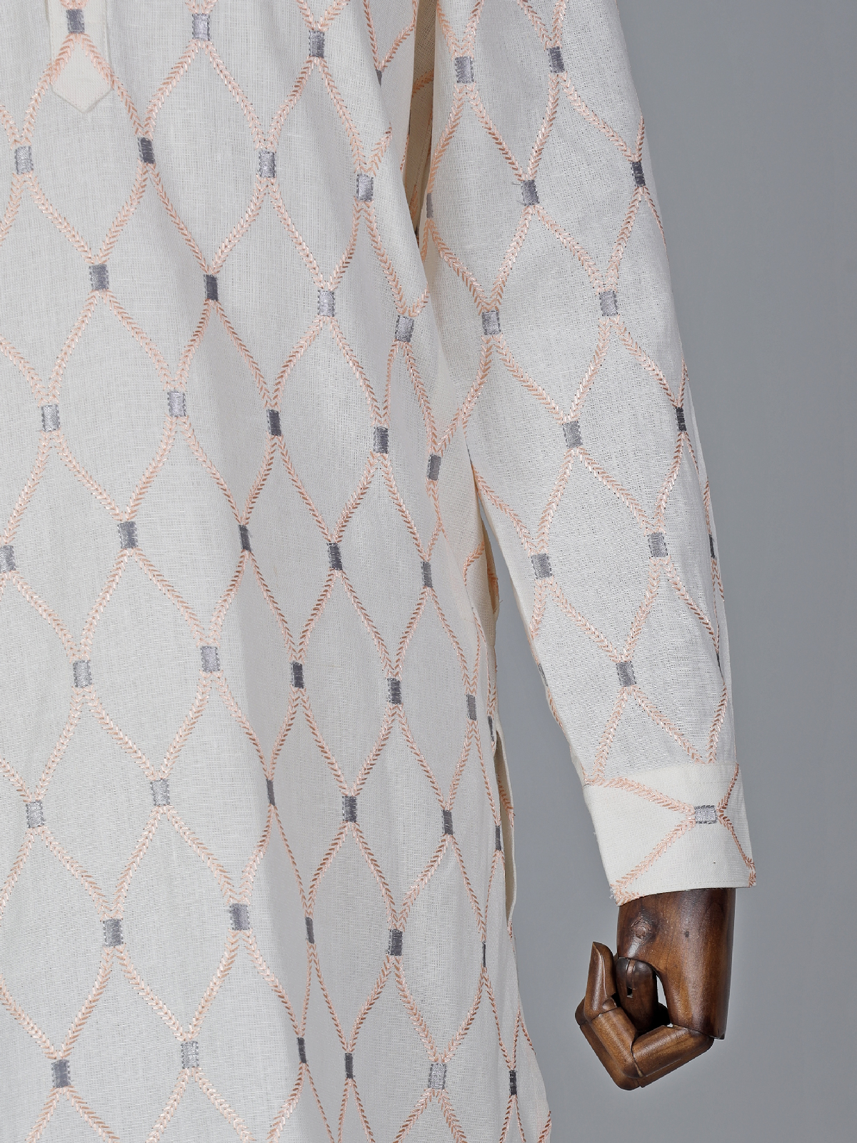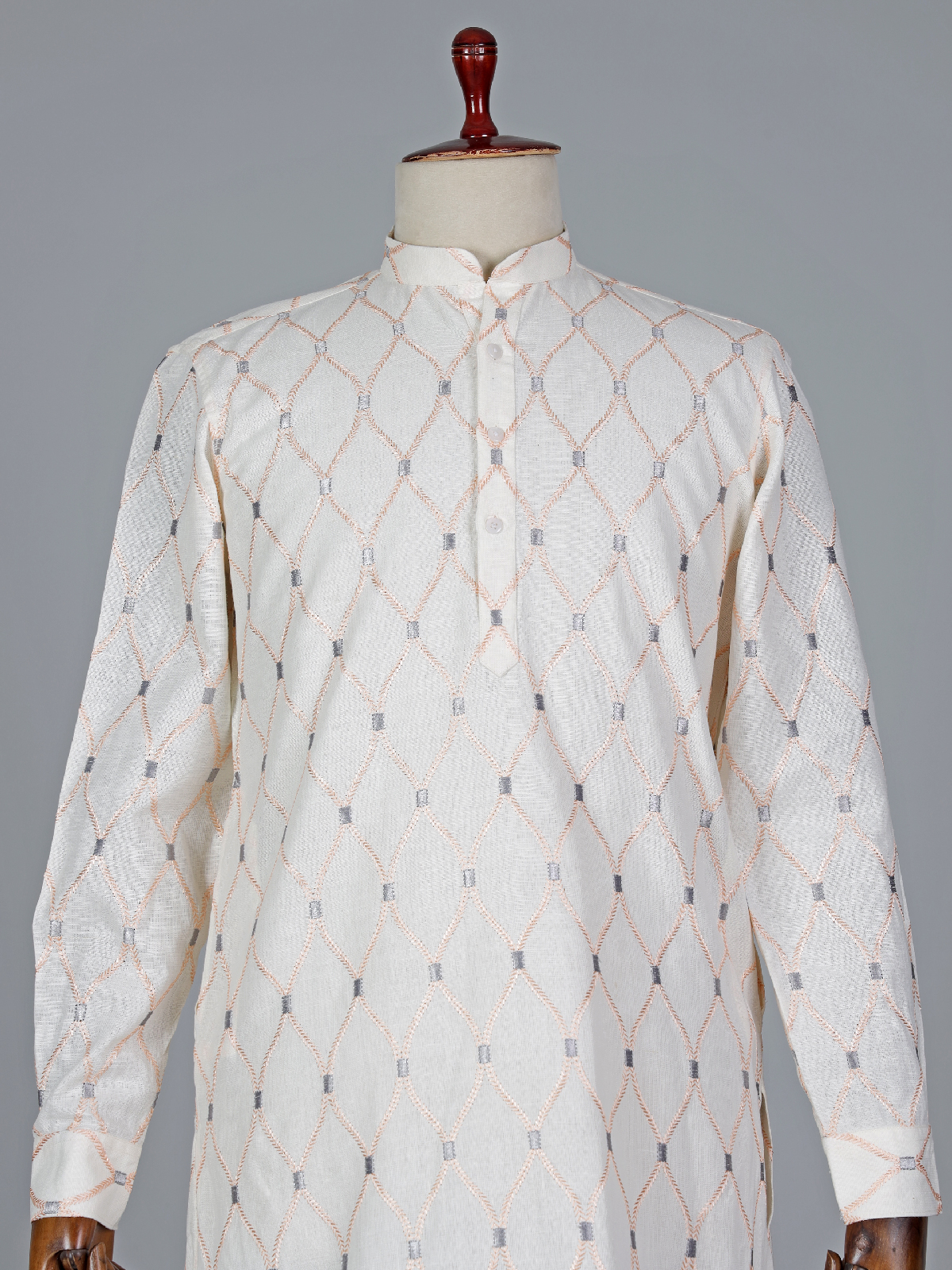 Make a statement with our light peach kurta suit suit, adorned with eye-catching embroidery work. Crafted from comfortable cotton, it boasts a mandarin collar and full sleeves. Complete with a bottom.