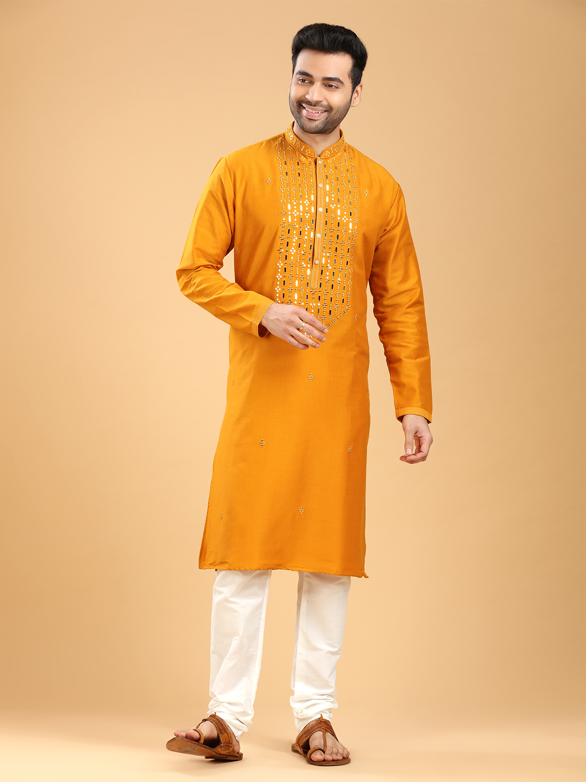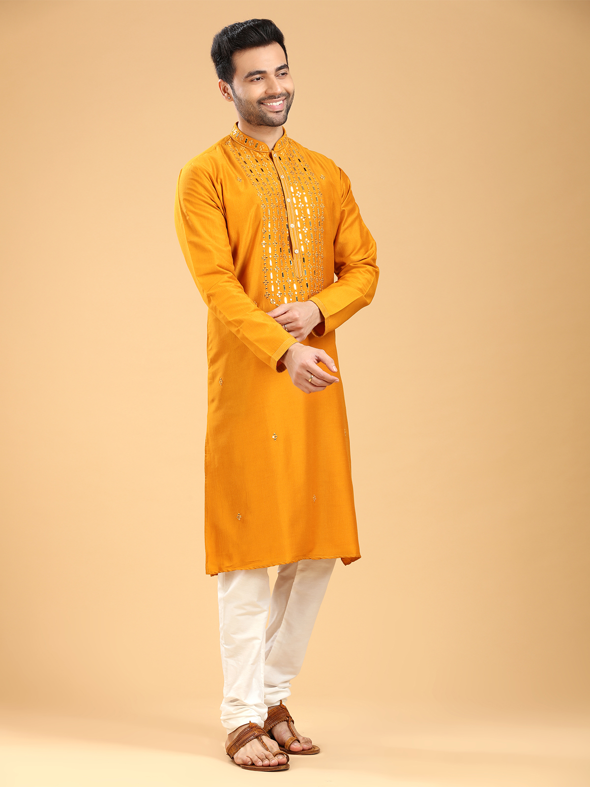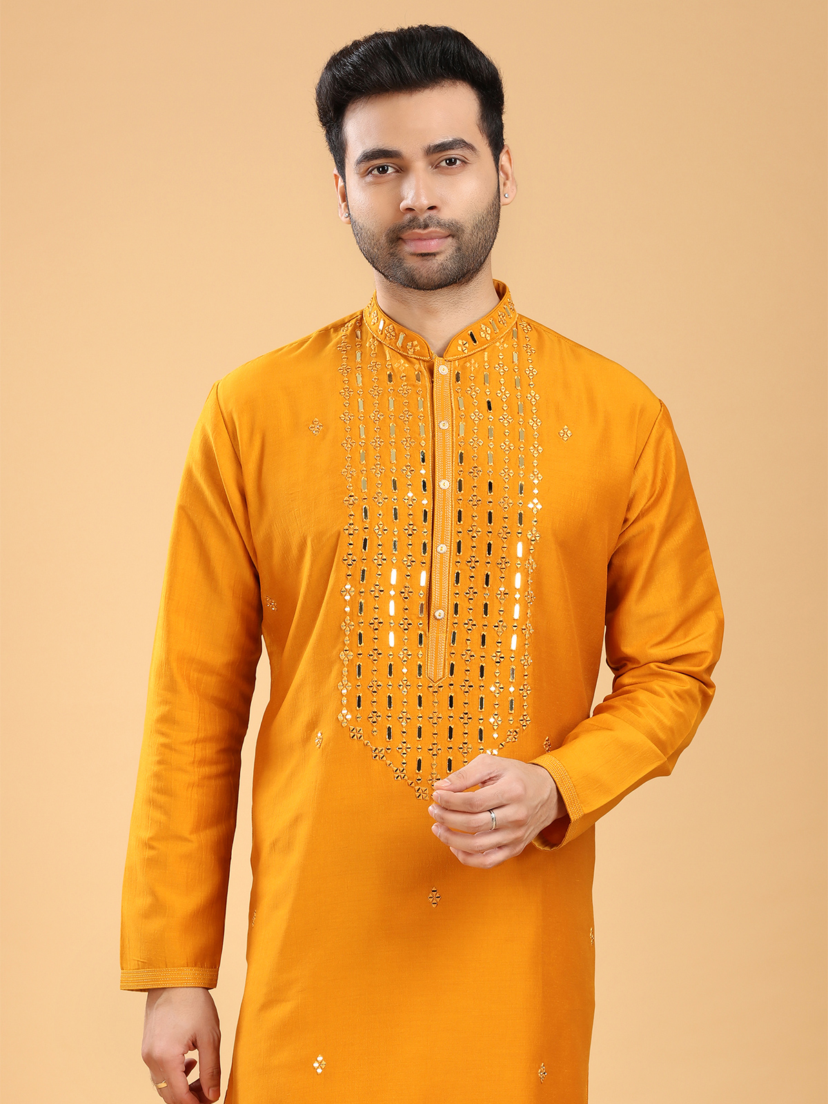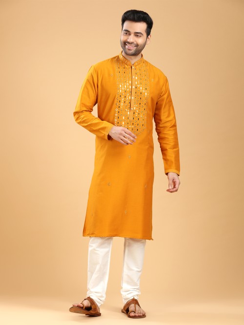 Get ready for any occasion with this latest mustard yellow cotton kurta suit, adorned with beautiful mirror and resham work. It features a mandarin collar and full sleeves. Comes with a bottom.