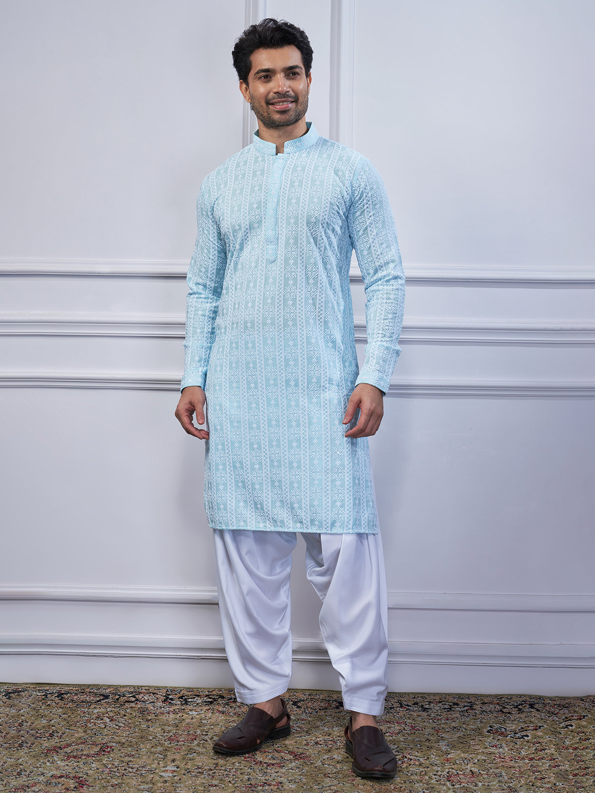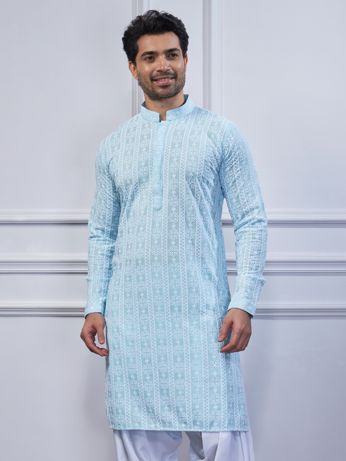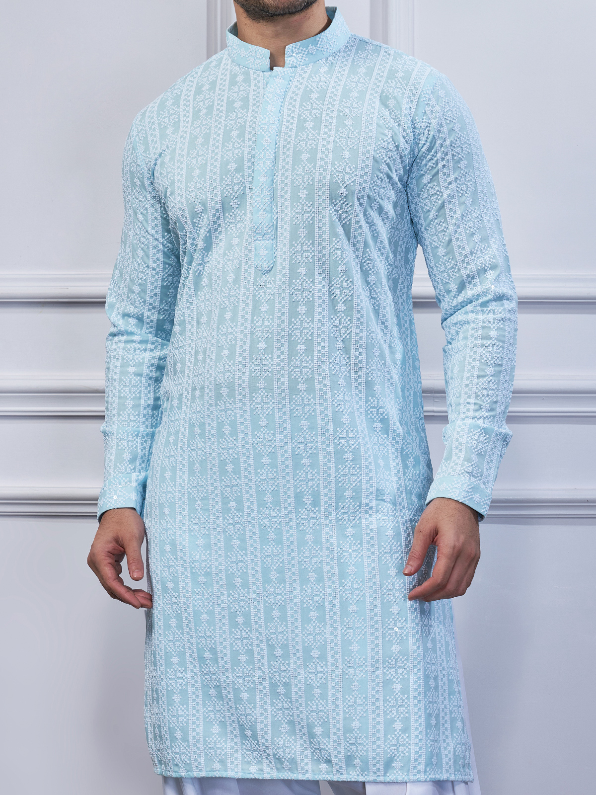 Add festive flair with this sky-blue embroidered cotton kurta suit. Features a mandarin collar and full sleeves. Comes with a bottom.