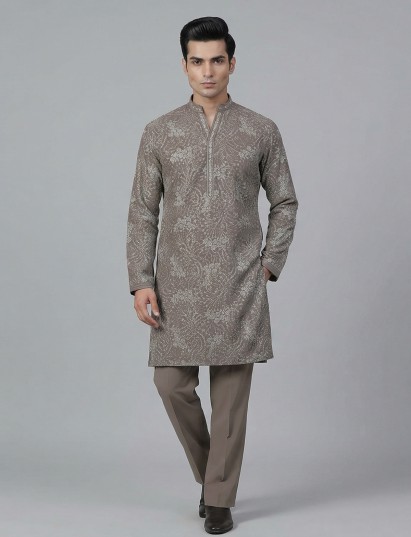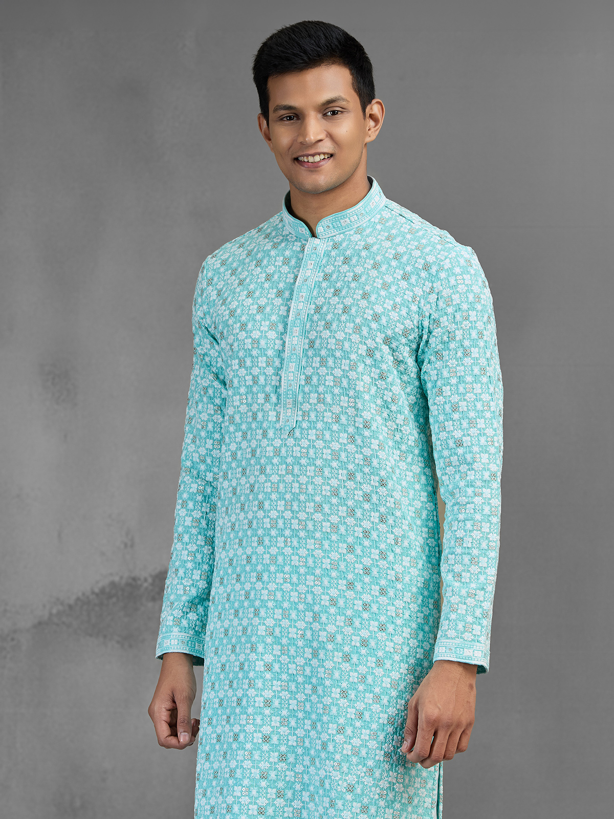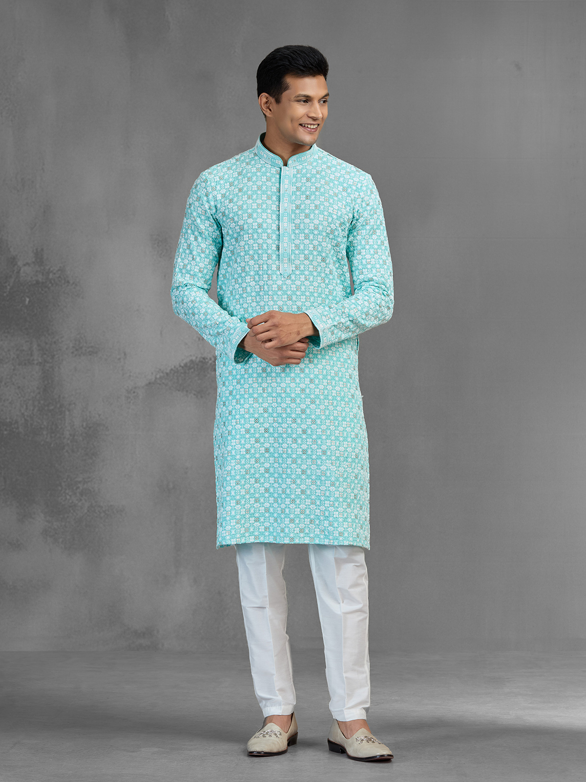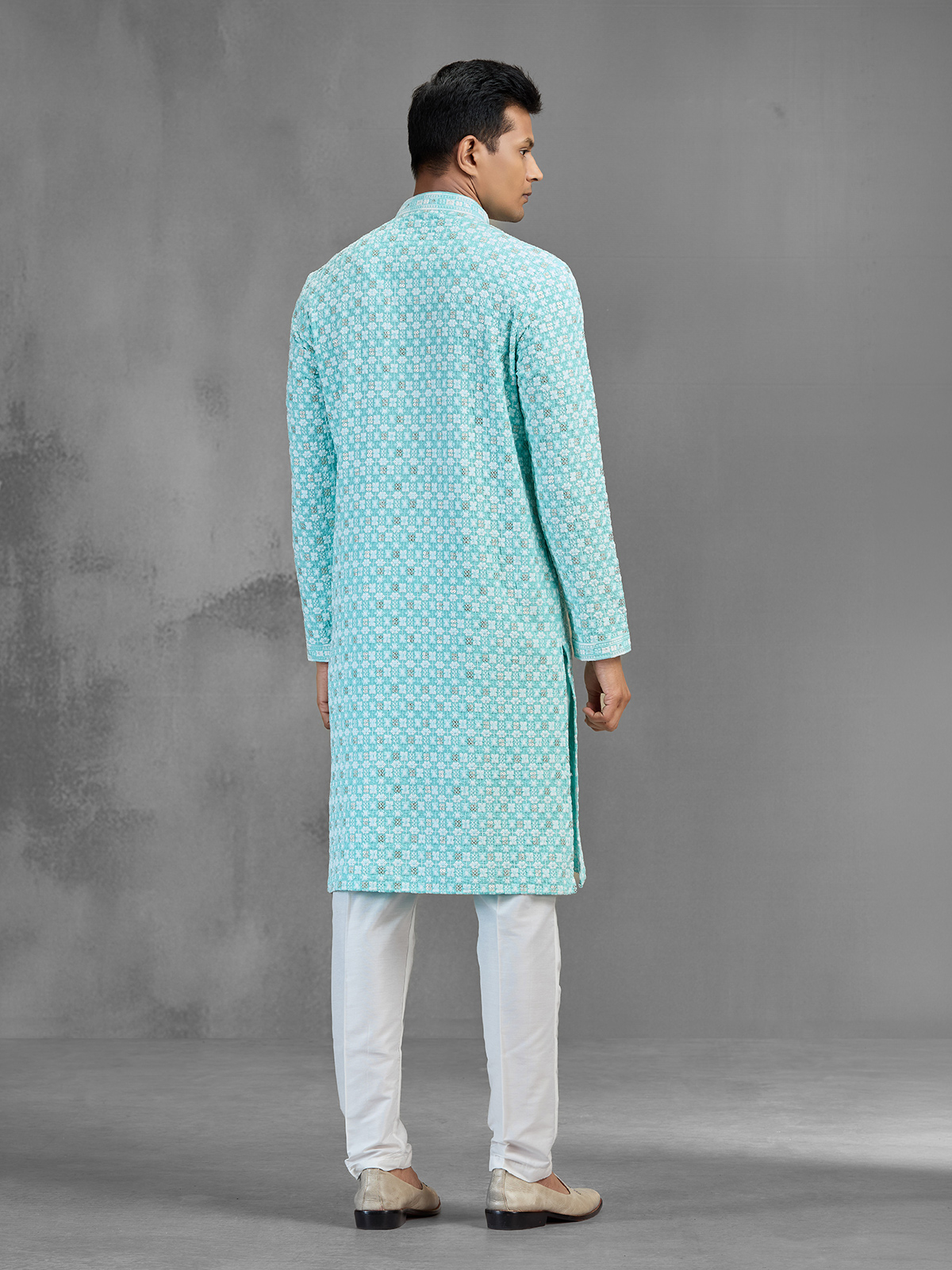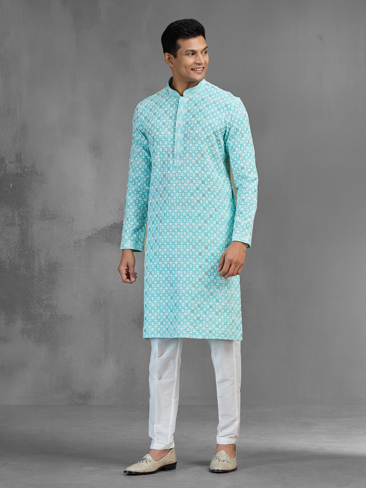 Cotton Sky Blue Men Kurta Suit Chikankari Elegance